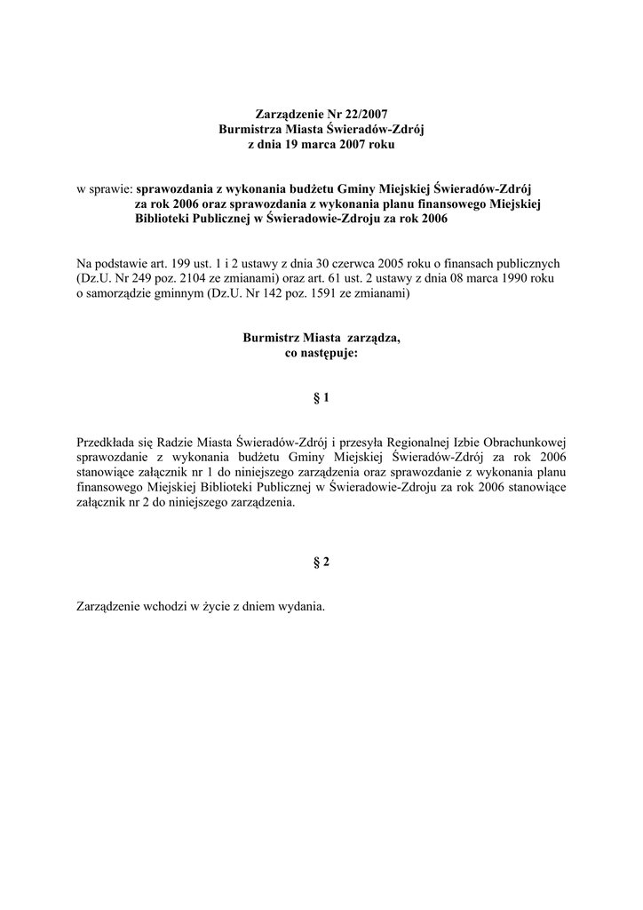 Zarządzenie Nr 22/2007 Burmistrza Miasta Świeradów-Zdrój z dnia 19 marca 2007 roku w sprawie: sprawozdania z wykonania budżetu Gminy Miejskiej Świeradów-Zdrój za rok 2006 oraz sprawozdania z wykonania planu finansowego Miejskiej Biblioteki Publicznej w Świeradowie-Zdroju za rok 2006 Na podstawie art. 199 ust. 1 i 2 ustawy z dnia 30 czerwca 2005 roku o finansach publicznych (Dz.U. Nr 249 poz. 2104 ze zmianami) oraz art. 61 ust. 2 ustawy z dnia 08 marca 1990 roku o samorządzie gminnym (Dz.U. Nr 142 poz. 1591 ze zmianami) Burmistrz Miasta zarządza, co następuje: §1 Przedkłada się Radzie Miasta Świeradów-Zdrój i przesyła Regionalnej Izbie Obrachunkowej sprawozdanie z wykonania budżetu Gminy Miejskiej Świeradów-Zdrój za rok 2006 stanowiące załącznik nr 1 do niniejszego zarządzenia oraz sprawozdanie z wykonania planu finansowego Miejskiej Biblioteki Publicznej w Świeradowie-Zdroju za rok 2006 stanowiące załącznik nr 2 do niniejszego zarządzenia. §2 Zarządzenie wchodzi w życie z dniem wydania. Uzasadnienie do Zarządzenia Nr 22/2007 Burmistrza Miasta Świeradów-Zdrój z dnia 19 marca 2007 roku Zgodnie z obowiązkiem wynikającym z art. 199 ustawy o finansach publicznych oraz z art. 61 ustawy o samorządzie gminnym, sprawozdanie z wykonania budżetu jednostki samorządu terytorialnego oraz sprawozdanie z wykonania planu finansowego samorządowej instytucji kultury przedkłada się Radzie Miasta i przesyła Regionalnej Izbie Obrachunkowej. Przedłożone sprawozdanie z wykonania budżetu Gminy Miejskiej Świeradów-Zdrój za rok 2006 zawiera zestawienia dochodów i wydatków wynikające z zamknięć rachunków budżetu gminy w szczegółowości nie mniejszej niż w uchwale budżetowej oraz część opisową.