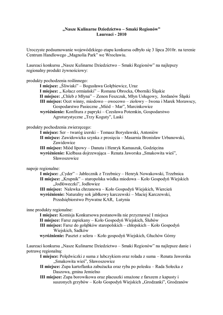 „Nasze Kulinarne Dziedzictwo – Smaki Regionów” Laureaci - 2010 Uroczyste podsumowanie wojewódzkiego etapu konkursu odbyło się 3 lipca 2010r. na terenie Centrum Handlowego „Magnolia Park” we Wrocławiu. Laureaci konkursu „Nasze Kulinarne Dziedzictwo – Smaki Regionów” na najlepszy regionalny produkt żywnościowy: produkty pochodzenia roślinnego: I miejsce: „Śliwiaki” – Bogusława Gołębiewicz, Uraz I miejsce: „ Kołacz ormiański” – Romana Obrocka, Oborniki Śląskie II miejsce: „Chleb z Młyna” – Zenon Feszczuk, Młyn Usługowy, Jordanów Śląski III miejsce: Ocet winny, miodowo – owocowo – ziołowy – Iwona i Marek Morawscy, Gospodarstwo Pasieczne „Miód – Mar”, Marcinkowice wyróżnienie: Konfitura z papryki – Czesława Potemkin, Gospodarstwo Agroturystyczne „Trzy Koguty”, Laski produkty pochodzenia zwierzęcego: I miejsce: Ser – twaróg izerski – Tomasz Borysławski, Antoniów II miejsce: Zawidowicka szynka z prosięcia – Masarnia Bronisław Urbanowski, Zawidowice III miejsce: Miód lipowy – Danuta i Henryk Kamaszuk, Godzięcina wyróżnienie: Kiełbasa dojrzewająca – Renata Jaworska „Smakowita wieś”, Sławoszowice napoje regionalne: I miejsce: „Cyder” – Jabłecznik z Trzebnicy – Henryk Nowakowski, Trzebnica II miejsce: „Krupnik” – staropolska wódka miodowa – Koło Gospodyń Wiejskich „Jodłóweczki”, Jodłowice III miejsce: Nalewka chrzanowa – Koło Gospodyń Wiejskich, Wiercień wyróżnienie: Naturalny sok jabłkowy karczewski – Maciej Karczewski, Przedsiębiorstwo Prywatne KAR, Lutynia inne produkty regionalne: I miejsce: Komisja Konkursowa postanowiła nie przyznawać I miejsca II miejsce: Farsz zapiekany – Koło Gospodyń Wiejskich, Ślubów III miejsce: Farsz do gołąbków staropolskich – chłopskich – Koło Gospodyń Wiejskich, Sadków wyróżnienie: Pasztet z selera – Koło gospodyń Wiejskich, Głuchów Górny Laureaci konkursu „Nasze Kulinarne Dziedzictwo – Smaki Regionów” na najlepsze danie i potrawę regionalną: I miejsce: Polędwiczki z suma z lubczykiem oraz rolada z suma – Renata Jaworska „Smakowita wieś”, Sławoszowice II miejsce: Zupa kartoflanka zabużacka oraz ryba po polesku – Rada Sołecka z Daszowa, gmina Jemielno III miejsce: Zupa borowikowa oraz placuszki smażone z farszem z kapusty i suszonych grzybów – Koło Gospodyń Wiejskich „Grodzanki”, Grodzanów wyróżnienie: Galareta studzinina oraz kogutki wiejskie smażone w śmietanie swojskiej – Koło Gospodyń Wiejskich, Jutrzyna Nominacja do ogólnopolskiej nagrody „Perła 2010” w kategorii produkt: Ser kozi łomnicki – Bożena i Daniel Sokołowscy, Łomnica, Pstrąg wędzony – Danuta Ćwikła „Pstrąg – Mar”, Ścinawka Średnia. Nominacja do ogólnopolskiej nagrody „Perła 2010” w kategorii danie i potrawa: Polędwiczki z suma z lubczykiem oraz rolada z suma – Renata Jaworska „Smakowita wieś”, Sławoszowice Prestiżową nagrodę „Perła 2010” podczas targów Polagra Food otrzymał: Pstrąg wędzony – Danuta Ćwikła „Pstrąg – Mar”, Ścinawka Średnia, Polędwiczki z suma z lubczykiem – Renata Jaworska „Smakowita wieś”, Sławoszowice.