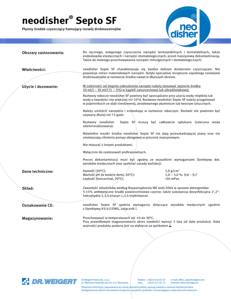 ® neodisher Septo SF Płynny środek czyszczący hamujący rozwój drobnoustrojów Obszary zastosowania: Do ręcznego, wstępnego czyszczenia narzędzi termostabilnych i termolabilnych, także endoskopów elastycznych i narzędzi stomatologicznych, przed maszynową dekontaminacją. Także do mokrego przechowywania narzędzi chirurgicznych i stomatologicznych. Właściwości: neodisher Septo SF charakteryzuje się bardzo dobrym działaniem czyszczącym. Nie powoduje zmian materiałowych narzędzi. Dzięki specjalnej recepturze zapobiega rozwojowi drobnoustrojów w roztworze środka nawet w dłuższym okresie. Użycie i dozowanie: W zależności od stopnia zabrudzenia narzędzi należy stosować stężenie środka 10 ml/l – 30 ml/l (1 – 3%) w kąpieli zanurzeniowej lub ultradźwiękowej. Roztwory robocze neodisher SF powinny być sporządzane przy użyciu wody miękkiej lub wody o twardości nie większej niż 10°d. Roztwory neodisher Septo SF należy przygotować w pojemnikach ze stali nierdzewnej, anodowanego aluminium lub tworzyw sztucznych. Należy umieścić narzędzia i endoskopy w roztworze roboczym. Roztwór nie powinien być używany dłużej niż 72 godz. Roztwory neodisher zdemineralizowana). Septo SF muszą być całkowicie spłukane (zalecana woda Niewielkie resztki środka neodisher Septo SF nie dają przeszkadzającej piany oraz nie zmniejszają ciśnienia pompy obiegowej w procesie maszynowym. Nie mieszać z innymi produktami. Wyłącznie do zastosowań profesjonalnych. Proces dekontaminacji musi być zgodny ze wszystkimi wymaganiami Dyrektywy dot. wyrobów medycznych oraz spełniać zasady walidacji. 3 Dane techniczne: Gęstość (20°C): Wartość pH (w wodzie demi, 20°C): Lepkość (koncentrat, 20°C): Skład: Zawartość składników według Rozporządzenia WE 648/2004 w sprawie detergentów: 5-15% amfoteryczne środki powierzchniowo czynne; także substancja dezynfekcyjna 2',2''heksahydro-1,3,5-triazyn-1,3,5-triyltrietanol. Oznakowanie CE: neodisher Septo SF spełnia wymagania dotyczące wyrobów medycznych zgodnie z Dyrektywą 93/42/EWG, załącznik I. Magazynowanie: Przechowywać w temperaturach od -10 do 30°C. Przy prawidłowym magazynowaniu okres trwałości wynosi 3 lata od daty produkcji. Data ważności produktu podana jest na etykiecie za symbolem . Dr.Weigert Polska Sp. z o.o. ul. Wybrzeże Gdyńskie 6A, 01-531 Warszawa 1,0 g/cm 1,0 – 3,0 %: 9,8 – 9,7 <50 mPas Telefon: +4822 616 02 23 Faks: +4822 617 81 21 e-mail: [email protected] Internet: www.drweigert.pl Powyższa informacja, odpowiednia do naszej aktualnej wiedzy, opisuje produkt w zakresie bezpieczeństwa. Odstępstwa od zaleceń stosowania nie gwarantują jakości produktu i nie pociągają za sobą roszczeń prawnych. ® neodisher Septo SF Płynny środek czyszczący hamujący rozwój drobnoustrojów Rodzaje zagrożeń i zasady prawidłowego postępowania: Klasyfikacja i oznakowanie koncentratu według Dyrektywy 1999/45WE odnoszącej się do preparatów niebezpiecznych: Oznaczenie zagrożenia: C – produkt żrący. Zawiera: 2,2',2''-heksahydro-1,3,5-triazyn-1,3,5triyltrietanol, amfoteryczne środki powierzchniowo czynne. Rodzaje zagroż zagroż eń: R 20/22 R 34 R 43 Działa szkodliwie przez drogi oddechowe i po połknięciu. Powoduje oparzenia. Może spowodować uczulenie w kontakcie ze skórą. Prawidł Prawidłowe postę postępowanie z mieszaniną mieszaniną niebezpieczną niebezpieczną: S 26 Zanieczyszczone oczy przemyć natychmiast dużą ilością wody i zasięgnąć porady lekarza. S 27/28 W przypadku zanieczyszczenia skóry natychmiast zdjąć całą zanieczyszczoną odzież i przemyć zanieczyszczoną skórę dużą ilością wody. S 36/37/39 Nosić odpowiednią odzież ochronną, odpowiednie rękawice ochronne i okulary lub ochronę twarzy. S 45 W przypadku awarii lub jeżeli źle się poczujesz, niezwłocznie zasięgnij porady lekarza – jeżeli to możliwe, pokaż etykietę. S 51 Stosować wyłącznie w dobrze wentylowanych pomieszczeniach. Zamknięte opakowania należy usuwać jako odpady tylko po całkowitym opróżnieniu. Usuwanie resztek produktu według zaleceń zamieszczonych w karcie charakterystyki. Informacje dotyczące bezpieczeństwa i ochrony środowiska znajdują się w karcie charakterystyki dostępnej na stronie www.drweigert.pl Producent: Chemische Fabrik Dr.Weigert GmbH & Co. KG, Mühlenhagen 85, 20539 Hamburg/Niemcy PL 2.0 / 08.2014 Dr.Weigert Polska Sp. z o.o. ul. Wybrzeże Gdyńskie 6A, 01-531 Warszawa Telefon: +4822 616 02 23 Faks: +4822 617 81 21 e-mail: [email protected] Internet: www.drweigert.pl Powyższa informacja, odpowiednia do naszej aktualnej wiedzy, opisuje produkt w zakresie bezpieczeństwa. Odstępstwa od zaleceń stosowania nie gwarantują jakości produktu i nie pociągają za sobą roszczeń prawnych.