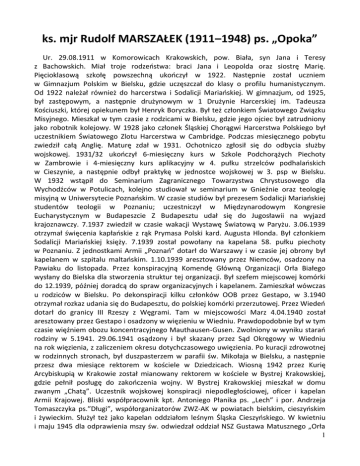 ks. mjr Rudolf MARSZAŁEK (1911–1948) ps. „Opoka” Ur. 29.08.1911 w Komorowicach Krakowskich, pow. Biała, syn Jana i Teresy z Bachowskich. Miał troje rodzeństwa: braci Jana i Leopolda oraz siostrę Marię. Pięcioklasową szkołę powszechną ukończył w 1922. Następnie został uczniem w Gimnazjum Polskim w Bielsku, gdzie uczęszczał do klasy o profilu humanistycznym. Od 1922 należał również do harcerstwa i Sodalicji Mariańskiej. W gimnazjum, od 1925, był zastępowym, a następnie drużynowym w 1 Drużynie Harcerskiej im. Tadeusza Kościuszki, której opiekunem był Henryk Boryczka. Był też członkiem Światowego Związku Misyjnego. Mieszkał w tym czasie z rodzicami w Bielsku, gdzie jego ojciec był zatrudniony jako robotnik kolejowy. W 1928 jako członek Śląskiej Chorągwi Harcerstwa Polskiego był uczestnikiem Światowego Zlotu Harcerstwa w Cambridge. Podczas miesięcznego pobytu zwiedził całą Anglię. Maturę zdał w 1931. Ochotniczo zgłosił się do odbycia służby wojskowej. 1931/32 ukończył 6-miesięczny kurs w Szkole Podchorążych Piechoty w Zambrowie i 4-miesięczny kurs aplikacyjny w 4. pułku strzelców podhalańskich w Cieszynie, a następnie odbył praktykę w jednostce wojskowej w 3. psp w Bielsku. W 1932 wstąpił do Seminarium Zagranicznego Towarzystwa Chrystusowego dla Wychodźców w Potulicach, kolejno studiował w seminarium w Gnieźnie oraz teologię misyjną w Uniwersytecie Poznańskim. W czasie studiów był prezesem Sodalicji Mariańskiej studentów teologii w Poznaniu; uczestniczył w Międzynarodowym Kongresie Eucharystycznym w Budapeszcie Z Budapesztu udał się do Jugosławii na wyjazd krajoznawczy. 7.1937 zwiedził w czasie wakacji Wystawę Światową w Paryżu. 3.06.1939 otrzymał święcenia kapłańskie z rąk Prymasa Polski kard. Augusta Hlonda. Był członkiem Sodalicji Mariańskiej księży. 7.1939 został powołany na kapelana 58. pułku piechoty w Poznaniu. Z jednostkami Armii „Poznań” dotarł do Warszawy i w czasie jej obrony był kapelanem w szpitalu maltańskim. 1.10.1939 aresztowany przez Niemców, osadzony na Pawiaku do listopada. Przez konspiracyjną Komendę Główną Organizacji Orła Białego wysłany do Bielska dla stworzenia struktur tej organizacji. Był szefem miejscowej komórki do 12.1939, później doradcą do spraw organizacyjnych i kapelanem. Zamieszkał wówczas u rodziców w Bielsku. Po dekonspiracji kilku członków OOB przez Gestapo, w 3.1940 otrzymał rozkaz udania się do Budapesztu, do polskiej komórki przerzutowej. Przez Wiedeń dotarł do granicy III Rzeszy z Węgrami. Tam w miejscowości Marz 4.04.1940 został aresztowany przez Gestapo i osadzony w więzieniu w Wiedniu. Prawdopodobnie był w tym czasie więźniem obozu koncentracyjnego Mauthausen-Gusen. Zwolniony w wyniku starań rodziny w 5.1941. 29.06.1941 osądzony i był skazany przez Sąd Okręgowy w Wiedniu na rok więzienia, z zaliczeniem okresu dotychczasowego uwięzienia. Po kuracji zdrowotnej w rodzinnych stronach, był duszpasterzem w parafii św. Mikołaja w Bielsku, a następnie przesz dwa miesiące rektorem w kościele w Dziedzicach. Wiosną 1942 przez Kurię Arcybiskupią w Krakowie został mianowany rektorem w kościele w Bystrej Krakowskiej, gdzie pełnił posługę do zakończenia wojny. W Bystrej Krakowskiej mieszkał w domu zwanym „Chatą”. Uczestnik wojskowej konspiracji niepodległościowej, oficer i kapelan Armii Krajowej. Bliski współpracownik kpt. Antoniego Płanika ps. „Lech” i por. Andrzeja Tomaszczyka ps.”Długi”, współorganizatorów ZWZ-AK w powiatach bielskim, cieszyńskim i żywieckim. Służył też jako kapelan oddziałom leśnym Śląska Cieszyńskiego. W kwietniu i maju 1945 dla odprawienia mszy św. odwiedzał oddział NSZ Gustawa Matusznego „Orła 1 Białego” w Białej Wisełce i Brennej, a od czerwca do 10 września tego roku ochotniczo służył w (Ludowym) Wojsku Polskim, w stopniu kpt., mianowany kapelanem tworzonej wówczas na Górnym Śląsku 13. DP w Katowicach. Od lica 1945 był równolegle kapelanem śląskiego konspiracyjnego VII Okręgu NSZ. 15.09.1945 z fałszywymi dokumentami przez Czechosłowację dotarł do Niemiec, zgłosił się do bp. Józefa Gawliny, biskupa polowego i ordynariusza Polaków w Niemczech. 1.10.1945 został przez niego mianowany kapelanem wojskowym w Norymberdze, a przez płk. Antoniego Szackiego, dowódcę Brygady Świętokrzyskiej NSZ, oficerem Grupy Operacyjnej Zachód NSZ i awansowany do stopnia majora. W grudniu 1945 powrócił do Polski, w Warszawie zgłosił się do duszpasterstwa wojskowego, ale został skierowany do rezerwy. Od 24.12.1945 do 30.06.1946 był rektorem kościółka w Bystrej Śląskiej obejmującego swoją działalnością również Mikuszowice Śląskie. W tym czasie sprawował też funkcję kapelana oddziałów Zgrupowania Leśnego NSZ „Bartka”. W związku z próbą aresztowania go przez Urząd Bezpieczeństwa Publicznego od 1 lipca ukrywał się w Bystrej i Szczyrku, a następnie dołączył do Zgrupowania NSZ kpt. Henryka Flame „Bartka” w kompleksie Baraniej Góry. W czasie pobytu w oddziale zachował kontakt listowny z przełożonym Zgromadzenia Chrystusowców ks. Ignacym Posadzym. W uzgodnieniu z dowódcą zgrupowania NSZ, na przełomie sierpnia i września 1946 wyjechał ponownie do Niemiec w celu zorganizowania pomocy oddziałom NSZ i ich przerzutu na Zachód. O jego postawie świadczą fragmenty listów wysyłanych w tym czasie do Polski. Do znajomych w kraju pisał: „Być wolnym, a jednak czuć się niewolnikiem, to chyba najstraszniejsze uczucie. A jednak jest ono w sercach nas wszystkich. I te pęta niewoli szatańskiej chcemy zerwać, my, garstka szaleńców, którzyśmy się wyrzekli wszystkiego – nawet prymitywizmu życiowego – domu rodzinnego – wszelkiej wygody, a wzięliśmy na siebie trud i krwawy znój. Walczymy dziś o wolność całego narodu, by poprzez mogiły tych, co polegli, śladem krwi 