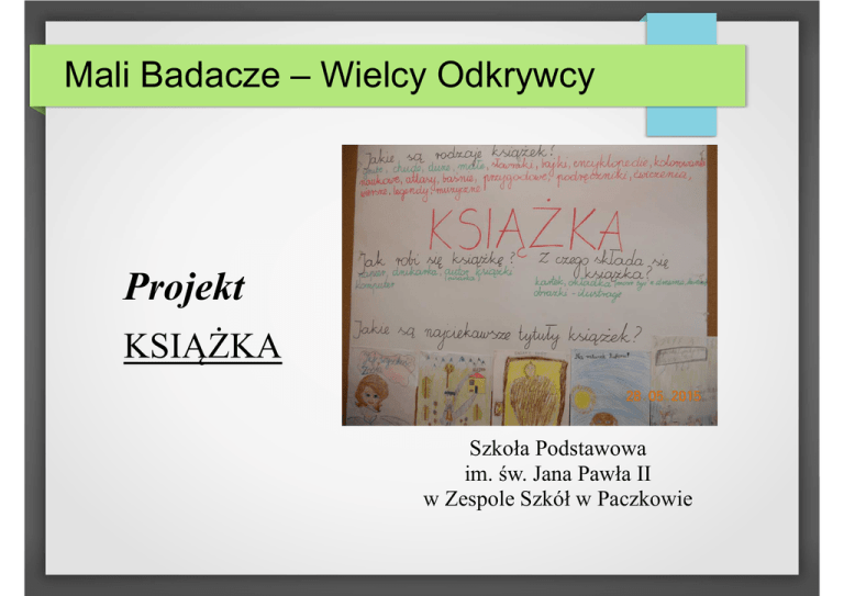 Mali Badacze – Wielcy Odkrywcy Projekt KSIĄŻKA Szkoła Podstawowa im. św. Jana Pawła II w Zespole Szkół w Paczkowie Mali Badacze – Wielcy Odkrywcy Wycieczka do biblioteki szkolnej i spotkanie z panem bibliotekarzem. Mali Badacze – Wielcy Odkrywcy Mali Badacze – Wielcy Odkrywcy Mali Badacze – Wielcy Odkrywcy Mali Badacze – Wielcy Odkrywcy Spotkanie z pisarką, panią Agatą Widzowską. Mali Badacze – Wielcy Odkrywcy Mali Badacze – Wielcy Odkrywcy Mali Badacze – Wielcy Odkrywcy Mali Badacze – Wielcy Odkrywcy Dzieci rysują swe wyobrażenia o najwspanialszej książce. Mali Badacze – Wielcy Odkrywcy Mali Badacze – Wielcy Odkrywcy Układamy pytania badawcze. Mali Badacze – Wielcy Odkrywcy Prezentacja ulubionych, interesujących książek. Mali Badacze – Wielcy Odkrywcy Mali Badacze – Wielcy Odkrywcy Mali Badacze – Wielcy Odkrywcy Chętni uczniowie z pomocą rodziców przygotowali swoje książki. Mali Badacze – Wielcy Odkrywcy Mali Badacze – Wielcy Odkrywcy Mali Badacze – Wielcy Odkrywcy Mali Badacze – Wielcy Odkrywcy Przygotowujemy klasową książkę „Ulubione wiersze klasy I a”. Mali Badacze – Wielcy Odkrywcy Mali Badacze – Wielcy Odkrywcy Mali Badacze – Wielcy Odkrywcy Mali Badacze – Wielcy Odkrywcy Mali Badacze – Wielcy Odkrywcy Zwiedzanie drukarni. Mali Badacze – Wielcy Odkrywcy Mali Badacze – Wielcy Odkrywcy Mali Badacze – Wielcy Odkrywcy Mali Badacze – Wielcy Odkrywcy Pamiątkowe zdjęcie z właścicielem drukarni panem Witeckim. Mali Badacze – Wielcy Odkrywcy Opowiadamy lub czytamy kolorowe bajki. Mali Badacze – Wielcy Odkrywcy Mali Badacze – Wielcy Odkrywcy Mali Badacze – Wielcy Odkrywcy Pasowanie na czytelnika. Mali Badacze – Wielcy Odkrywcy Mali Badacze – Wielcy Odkrywcy Mali Badacze – Wielcy Odkrywcy Mali Badacze – Wielcy Odkrywcy