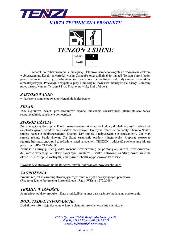 KARTA TECHNICZNA PRODUKTU TENZON 2 SHINE SYMBOL pH A-48 7 Preparat do zabezpieczenia i pielęgnacji lakierów samochodowych (z wyraźnym efektem wybłyszczenia). Dzięki zawartości wosku Carnauba oraz unikalnej formulacji Tenzon chroni lakier przed wilgocią, korozją, osadzaniem się brudu oraz szkodliwym oddziaływaniem czynników atmosferycznych. Precyzyjnie wypełnia pory i mikrorysy, zwiększa intensywność barwy. Zalecany przed zastosowaniem Tenzon 3 Prot. Tworzy powłokę hydrofobową. ZASTOSOWANIE: karoserie samochodowe, powierzchnie lakierowane. SKŁAD: <5% niejonowe związki powierzchniowo czynne, substancja konserwująca (Benzisothiazolinone), rozpuszczalniki, substancje pomocnicze SPOSÓB UŻYCIA: Preparat gotowy do użycia. Przed zastosowaniem lakier samochodowy dokładnie umyć z zabrudzeń eksploatacyjnych, owadów oraz osadów mineralnych. Do mycia zaleca się preparaty: Shampo Neutro (mycie ręczne z nabłyszczaniem), Shampo Dry (mycie i nabłyszczanie z osuszaniem), Car Max (mycie ręczne, bezdotykowe), Car Stone (usuwanie osadów mineralnych). Preparat stosować ręcznie lub maszynowo. Bezpośrednio przed nałożeniem TENZON 1 odtłuścić powierzchnię lakieru przy użyciu IPA CLEANER. Nanieść na umytą, suchą, odtłuszczoną powierzchnię za pomocą aplikatora, równomiernie, delikatnie wcierając w lakier okrężnymi ruchami. Cienko nałożoną warstwę pozostawić na około 1h. Następnie wolnymi, kolistymi ruchami wypolerować karoserię. Uwaga: Nie stosować na nasłonecznionych, nagrzanych powierzchniach! ZAGROŻENIA: Produkt nie jest mieszaniną stwarzającą zagrożenie w myśl obowiązujących przepisów. (Rozporządzenie Parlamentu Europejskiego i Rady (WE) nr 1272/2008). TERMIN WAŻNOŚCI: 36 miesięcy od daty produkcji. Data produkcji/seria oraz data ważności podana na opakowaniu. DODATKOWE INFORMACJE: Dodatkowe informacje dostępne w karcie charakterystyki mieszaniny chemicznej. TENZI Sp. z o.o., 72-002 Dołuje, Skarbimierzyce 20 tel. (091) 311 97 77, fax: (091)311 97 79 e-mail: [email protected], www.tenzi.pl Strona 1 z 2 KARTA TECHNICZNA PRODUKTU Zanieczyszczone opakowanie należy całkowicie opróżnić. Puste opakowania wypłukać kilkakrotnie wodą, którą zużyć tak jak preparat. Puste opakowanie można składować w pojemnikach przeznaczonych do zbiórki opakowań z tworzyw sztucznych lub przekazać wyspecjalizowanej firmie do utylizacji. Przestrzegać przepisów Ustawy z dnia 13 czerwca 2013 r. o gospodarce opakowaniami i odpadami opakowaniowymi (Dz. U. 2013, poz. 888). TENZI Sp. z o.o., 72-002 Dołuje, Skarbimierzyce 20 tel. (091) 311 97 77, fax: (091)311 97 79 e-mail: [email protected], www.tenzi.pl Strona 2 z 2
