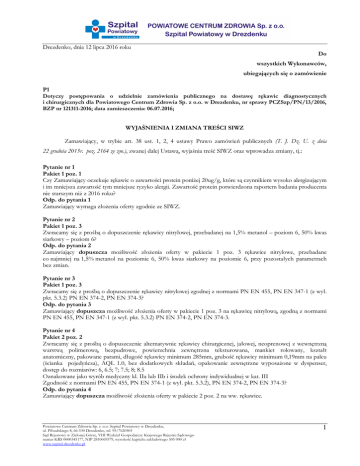 Drezdenko, dnia 12 lipca 2016 roku Do wszystkich Wykonawców, ubiegających się o zamówienie P1 Dotyczy postępowania o udzielnie zamówienia publicznego na dostawę rękawic diagnostycznych i chirurgicznych dla Powiatowego Centrum Zdrowia Sp. z o.o. w Drezdenku, nr sprawy PCZSzp/PN/13/2016, BZP nr 121311-2016; data zamieszczenia: 06.07.2016; WYJAŚNIENIA I ZMIANA TREŚCI SIWZ Zamawiający, w trybie art. 38 ust. 1, 2, 4 ustawy Prawo zamówień publicznych (T. J. Dz. U. z dnia 22 grudnia 2015r. poz. 2164 ze zm.), zwanej dalej Ustawą, wyjaśnia treść SIWZ oraz wprowadza zmiany, tj.: Pytanie nr 1 Pakiet 1 poz. 1 Czy Zamawiający oczekuje rękawic o zawartości protein poniżej 20ug/g, które są czynnikiem wysoko alergizującym i im mniejsza zawartość tym mniejsze ryzyko alergii. Zawartość protein potwierdzona raportem badania producenta nie starszym niż z 2016 roku? Odp. do pytania 1 Zamawiający wymaga złożenia oferty zgodnie ze SIWZ. Pytanie nr 2 Pakiet 1 poz. 3 Zwracamy się z prośbą o dopuszczenie rękawicy nitrylowej, przebadanej na 1,5% metanol – poziom 6, 50% kwas siarkowy – poziom 6? Odp. do pytania 2 Zamawiający dopuszcza możliwość złożenia oferty w pakiecie 1 poz. 3 rękawice nitrylowe, przebadane co najmniej na 1,5% metanol na poziomie 6, 50% kwas siarkowy na poziomie 6, przy pozostałych parametrach bez zmian. Pytanie nr 3 Pakiet 1 poz. 3 Zwracamy się z prośbą o dopuszczenie rękawicy nitrylowej zgodnej z normami PN EN 455, PN EN 347-1 (z wył. pkt. 5.3.2) PN EN 374-2, PN EN 374-3? Odp. do pytania 3 Zamawiający dopuszcza możliwość złożenia oferty w pakiecie 1 poz. 3 na rękawicę nitrylową, zgodną z normami PN EN 455, PN EN 347-1 (z wył. pkt. 5.3.2) PN EN 374-2, PN EN 374-3. Pytanie nr 4 Pakiet 2 poz. 2 Zwracamy się z prośbą o dopuszczenie alternatywnie rękawicy chirurgicznej, jałowej, neoprenowej z wewnętrzną warstwą polimerową, bezpudrowe, powierzchnia zewnętrzna teksturowana, mankiet rolowany, kształt anatomiczny, pakowane parami, długość rękawicy minimum 285mm, grubość rękawicy minimum 0,19mm na palcu (ścianka pojedyńcza), AQL 1.0, bez dodatkowych składań, opakowanie zewnętrzne wyposażone w dyspenser, dostęp do rozmiarów: 6, 6.5; 7; 7.5; 8; 8.5 Oznakowane jako wyrób medyczny kl. IIa lub IIb i środek ochrony indywidualnej w kat. III Zgodność z normami PN EN 455, PN EN 374-1 (z wył. pkt. 5.3.2), PN EN 374-2, PN EN 374-3? Odp. do pytania 4 Zamawiający dopuszcza możliwość złożenia oferty w pakiecie 2 poz. 2 na ww. rękawice. Powiatowe Centrum Zdrowia Sp. z .o.o. Szpital Powiatowy w Drezdenku, ul. Piłsudskiego 8, 66-530 Drezdenko, tel. 95/7620505 Sąd Rejonowy w Zielonej Górze, VIII Wydział Gospodarczy Krajowego Rejestru Sądowego numer KRS 0000345177, NIP 2810069579, wysokość kapitału zakładowego 505 000 zł www.szpital-drezdenko.pl 1 Pytanie nr 5 Pakiet 2 poz. 1-3 Zwracamy się z prośbą o dopuszczenie rękawic chirurgicznych zgodnych z normami PN EN 455, PN EN 374-1 (z wył.pkt. 5.3.2) PN EN 374-2, PN EN 374-3? Odp. do pytania 5 Zamawiający dopuszcza możliwość złożenia oferty w pakiecie 2 poz. 1-3 na rękawice chirurgiczne zgodne z normami PN EN 455, PN EN 347-1 (z wył. pkt. 5.3.2) PN EN 374-2, PN EN 374-3. Pytanie nr 6 Pakiet 3 poz. 1-2 Zwracamy się z prośbą o dopuszczenie rękawicy nitrylowej zgodnej z normami PN EN 455, PNEN 374-1 (z wył.pkt. 5.3.2) PN EN 374-2, PN EN 374-3? Odp. do pytania 6 Zamawiający dopuszcza możliwość złożenia oferty w pakiecie 3 poz. 1-2 na rękawice zgodne z normami PN EN 455, PN EN 347-1 (z wył. pkt. 5.3.2) PN EN 374-2, PN EN 374-3. Pytanie nr 7 Pakiet 3 poz. 1 Zwracamy się z prośbą o dopuszczenie rękawicy nitrylowej o grubości na palcu 0.14mm, przebadanej na 1,5% metanol – poziom 6, 50% kwas siarkowy – poziom 6? Odp. do pytania 7 Zamawiający dopuszcza możliwość złożenia oferty w pakiecie 3 poz.1 na rękawicę nitrylową o grubości na palcu 0.14mm. Zamawiający dopuszcza możliwość złożenia oferty w pakiecie 3 poz. 1 rękawice nitrylowe, przebadane co najmniej na 1,5% metanol na poziomie 6, 50% kwas siarkowy na poziomie 6, przy pozostałych parametrach bez zmian. Pytanie nr 8 Pakiet 3 poz. 2 Zwracamy się z prośbą o dopuszczenie rękawicy nitrylowej o grubości na palcu 0.18-0.20mm, przebadanej na 1,5% metanol – poziom 6, pozostałe wymagane substancje przebadane? Odp. do pytania 8 Zamawiający dopuszcza możliwość złożenia oferty w pakiecie 3 poz.2 na rękawicę nitrylową o grubości na palcu 0.18-0.20mm. Zamawiający dopuszcza możliwość złożenia oferty w pakiecie 3 poz. 2 rękawice nitrylowe, przebadane co najmniej na 1,5% metanol na poziomie 6, przy pozostałych parametrach bez zmian. Pytanie nr 9 Pakiet 1 poz. 1 Prosimy o dopuszczenie rękawic oznakowanych jako wyrób medyczny kl.I i środek ochrony indywidualnej w kat. I, reszta parametrów bez zmian. Odp. do pytania 9 Zamawiający wymaga złożenia oferty zgodnie ze SIWZ. Pytanie nr 10 Pakiet 1 poz. 2 Prosimy o dopuszczenie rękawic o grubości na palcu min. 0.06mm (ścianka pojedyncza). Prosimy o dopuszczenie rękawic oznakowanych jako wyrób medyczny kl. I i środek ochrony indywidualnej w kat. I. Odp. do pytania 10 Zamawiający wymaga złożenia oferty zgodnie ze SIWZ. Pytanie nr 11 Pakiet 1 poz. 3 Prosimy o dopuszczenie rękawic przebadanych na przenikanie substancji chemicznych z listy A normy PN EN 374-1 tj.: 47% kwas siarkowy, 40% wodorotlenek sodu. Prosimy o dopuszczenie rękawic oznakowanych jako wyrób medyczny kl. I i środek ochrony indywidualnej w kat. I. Powiatowe Centrum Zdrowia Sp. z .o.o. Szpital Powiatowy w Drezdenku, ul. Piłsudskiego 8, 66-530 Drezdenko, tel. 95/7620505 Sąd Rejonowy w Zielonej Górze, VIII Wydział Gospodarczy Krajowego Rejestru Sądowego numer KRS 0000345177, NIP 2810069579, wysokość kapitału zakładowego 505 000 zł www.szpital-drezdenko.pl 2 Odp. do pytania 11 Zamawiający wymaga złożenia oferty zgodnie ze SIWZ. Pyt
