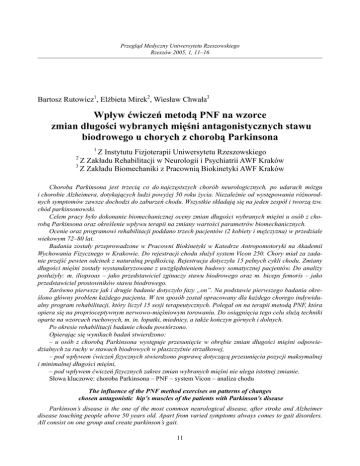 Przegląd Medyczny Uniwersytetu Rzeszowskiego Rzeszów 2005, 1, 11–16 Bartosz Rutowicz1, Elżbieta Mirek2, Wiesław Chwała3 Wpływ ćwiczeń metodą PNF na wzorce zmian długości wybranych mięśni antagonistycznych stawu biodrowego u chorych z chorobą Parkinsona 1 Z Instytutu Fizjoterapii Uniwersytetu Rzeszowskiego Z Zakładu Rehabilitacji w Neurologii i Psychiatrii AWF Kraków 3 Z Zakładu Biomechaniki z Pracownią Biokinetyki AWF Kraków 2 Choroba Parkinsona jest trzecią co do najczęstszych chorób neurologicznych, po udarach mózgu i chorobie Alzheimera, dotykających ludzi powyżej 50 roku życia. Niezależnie od występowania różnorodnych symptomów zawsze dochodzi do zaburzeń chodu. Wszystkie składają się na jeden zespół i tworzą tzw. chód parkinsonowski. Celem pracy było dokonanie biomechanicznej oceny zmian długości wybranych mięśni u osób z chorobą Parkinsona oraz określenie wpływu terapii na zmiany wartości parametrów biomechanicznych. Ocenie oraz programowi rehabilitacji poddano trzech pacjentów (2 kobiety i mężczyzna) w przedziale wiekowym 72–80 lat. Badania zostały przeprowadzone w Pracowni Biokinetyki w Katedrze Antropomotoryki na Akademii Wychowania Fizycznego w Krakowie. Do rejestracji chodu służył system Vicon 250. Chory miał za zadanie przejść pewien odcinek z naturalną prędkością. Rejestracja dotyczyła 15 pełnych cykli chodu. Zmiany długości mięśni zostały wystandaryzowane z uwzględnieniem budowy somatycznej pacjentów. Do analizy posłużyły: m. iliopsoas – jako przedstawiciel zginaczy stawu biodrowego oraz m. biceps femoris – jako przedstawiciel prostowników stawu biodrowego. Zarówno pierwsze jak i drugie badanie dotyczyło fazy „on”. Na podstawie pierwszego badania określono główny problem każdego pacjenta. W ten sposób został opracowany dla każdego chorego indywidualny program rehabilitacji, który liczył 15 sesji terapeutycznych. Polegał on na terapii metodą PNF, która opiera się na proprioceptywnym nerwowo-mięśniowym torowaniu. Do osiągnięcia tego celu służą techniki oparte na wzorcach ruchowych, m. in. łopatki, miednicy, a także kończyn górnych i dolnych. Po okresie rehabilitacji badanie chodu powtórzono. Opierając się wynikach badań stwierdzono: – u osób z chorobą Parkinsona występuje przesunięcie w obrębie zmian długości mięśni odpowiedzialnych za ruchy w stawach biodrowych w płaszczyźnie strzałkowej, – pod wpływem ćwiczeń fizycznych stwierdzono poprawę dotyczącą przesunięcia pozycji maksymalnej i minimalnej długości mięśni, – pod wpływem ćwiczeń fizycznych zakres zmian wybranych mięśni nie ulega istotnej zmianie. Słowa kluczowe: choroba Parkinsona – PNF – system Vicon – analiza chodu The influence of the PNF method exercises on patterns of changes chosen antagonistic hip’s muscles of the patients with Parkinson's disease Parkinson’s disease is the one of the most common neurological disease, after stroke and Alzheimer disease touching people above 50 years old. Apart from varied symptoms always comes to gait disorders. All consist on one group and create parkinson’s gait. 11 The aim of the work was biomechanical assessment of the chosen muscle changes at the persons with PD and define effects of the therapy on change of the values biomechanical parameters. Put to the rest three patients (2 women and a man) with PD in aged 72–80 years old. The investigations were made at the Biokinetics Laboratory on the Antropomotorcity Cathedral at the Academy of Physical Education in Cracow. Vicon 250 system served to gait registration. Patient had for task of passages sure section with natural speed. The registration concerned 15 full cycles of walk. The length changes of the muscles were standarizationed with consideration of somatic build. The analysis concerned: m. iliopsoas – as a representative of the hip flexors and m. biceps femoris – as representative of the hip extensors. Both first and second investigation concerned „on” phase. On the basis of first investigation there was qualified main problem of every patient. In this way there was worked out for every patient the individual rehabilitation program in which included 15 therapeutic sessions. This program depended on therapy of the PNF method which is based on proprioceptive neuromuscular facilitation. To obtain the aim there serve techniques based on the movement patterns: shoulder, pelvic and upper or lower extremity. The investigation of walk after period of rehabilitation was repeated. On results of investigations it was founded that: – at persons with PD there is a displacement of muscles length changes responsible for hip movements in sagittal plane, – under the influence of physical exercises it was found improvement of the maximal and minimal muscle length, – under the influence of physical exercises the range of changes of chosen muscles does not undergo the essential change. Key words: Parkinson’s disease – PNF – Vicon system – gait analysis z chorobą Parkinsona oraz określenie wpływu terapii na zmiany wartości parametrów biomechanicznych. WSTĘP Choroba Parkinsona jest trzecią co do najczęstszych chorób neurologicznych, po udarach mózgu i chorobie Alzheimera, dotykających ludzi powyżej 50 roku życia. Rzadko dotyczy ludzi młodych, jednak znane są przypadki zachorowań poniżej 25 roku życia. Pomimo tego, że jest znana i opisywana od wielu lat, wciąż nie wiadomo co jest jej przyczyną. Klinicznie chorobę Parkinsona określa tak zwana triada parkinsonowska, na którą składają się drżenie spoczynkowe, sztywność mięśniowa i spowolnienie ruchowe [1]. Jednak niezależnie od występowania i nasilenia różnorodnych symptomów zawsze dochodzi do zaburzeń chodu. Lepsze poznanie i zrozumienie mechaniki chodu patologicznego, wpływ na planowanie procesu usprawniania, a także ocena tego procesu są możliwe dzięki analizie ch