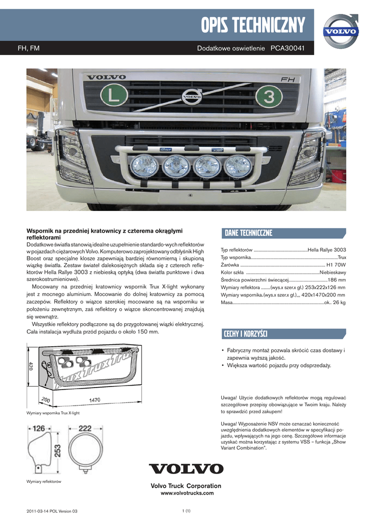 OPIS TECHNICZNY Dodatkowe oswietlenie PCA30041 FH, FM Wspornik na przedniej kratownicy z czterema okrągłymi reflektorami Dodatkowe światła stanowią idealne uzupełnienie standardo-wych reflektorów w pojazdach ciężarowych Volvo. Komputerowo zaprojektowany odbłyśnik High Boost oraz specjalne klosze zapewniają bardziej równomierną i skupioną wiązkę światła. Zestaw świateł dalekosiężnych składa się z czterech reflektorów Hella Rallye 3003 z niebieską optyką (dwa światła punktowe i dwa szerokostrumieniowe). Mocowany na przedniej kratownicy wspornik Trux X-light wykonany jest z mocnego aluminium. Mocowanie do dolnej kratownicy za pomocą zaczepów. Reflektory o wiązce szerokiej mocowane są na wsporniku w położeniu zewnętrznym, zaś reflektory o wiązce skoncentrowanej znajdują się wewnątrz. Wszystkie reflektory podłączone są do przygotowanej wiązki elektrycznej. Cała instalacja wydłuża przód pojazdu o około 150 mm. DANE TECHNICCZNE Typ reflektorów ...............................................Hella Rallye 3003 Typ wspornika............................................................................Trux Żarówka .......................................................................... H1 70W Kolor szkła ................................................................Niebieskawy Średnica powierzchni świecącej..................................186 mm Wymiary reflektora ........(wys.x szer.x gł.) 253x222x126 mm Wymiary wspornika.(wys.x szer.x gł.),,, 420x1470x200 mm Masa................................................................................ok.. 26 kg cechy i korzyści • Fabryczny montaż pozwala skrócić czas dostawy i zapewnia wyższą jakość. • Większa wartość pojazdu przy odsprzedaży. Uwaga! Użycie dodatkowych reflektorów mogą regulować szczegółowe przepisy obowiązujące w Twoim kraju. Należy to sprawdzić przed zakupem! Wymiary wspornika Trux X-light Uwaga! Wyposażenie NSV może oznaczać konieczność uwzględnienia dodatkowych elementów w specyfikacji pojazdu, wpływających na jego cenę. Szczegółowe informacje uzyskać można korzystając z systemu VSS – funkcja „Show Variant Combination”. Wymiary reflektorów 2011-03-14 POL Version 03 1 (1)