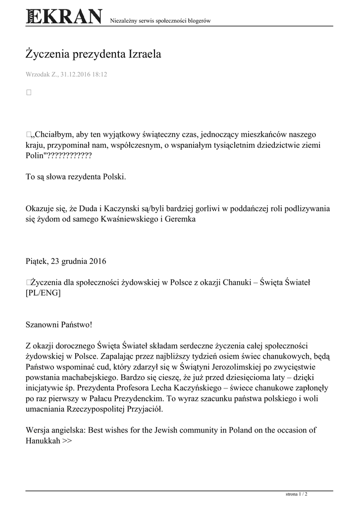 Niezależny serwis społeczności blogerów Życzenia prezydenta Izraela Wrzodak Z., 31.12.2016 18:12 ,,Chciałbym, aby ten wyjątkowy świąteczny czas, jednoczący mieszkańców naszego kraju, przypominał nam, współczesnym, o wspaniałym tysiącletnim dziedzictwie ziemi Polin"???????????? To są słowa rezydenta Polski. Okazuje się, że Duda i Kaczynski są/byli bardziej gorliwi w poddańczej roli podlizywania się żydom od samego Kwaśniewskiego i Geremka Piątek, 23 grudnia 2016 Życzenia dla społeczności żydowskiej w Polsce z okazji Chanuki – Święta Świateł [PL/ENG] Szanowni Państwo! Z okazji dorocznego Święta Świateł składam serdeczne życzenia całej społeczności żydowskiej w Polsce. Zapalając przez najbliższy tydzień osiem świec chanukowych, będą Państwo wspominać cud, który zdarzył się w Świątyni Jerozolimskiej po zwycięstwie powstania machabejskiego. Bardzo się cieszę, że już przed dziesięcioma laty – dzięki inicjatywie śp. Prezydenta Profesora Lecha Kaczyńskiego – świece chanukowe zapłonęły po raz pierwszy w Pałacu Prezydenckim. To wyraz szacunku państwa polskiego i woli umacniania Rzeczypospolitej Przyjaciół. Wersja angielska: Best wishes for the Jewish community in Poland on the occasion of Hanukkah >> strona 1 / 2 Niezależny serwis społeczności blogerów Chciałbym, aby ten wyjątkowy świąteczny czas, jednoczący mieszkańców naszego kraju, przypominał nam, współczesnym, o wspaniałym tysiącletnim dziedzictwie ziemi Polin. Niech ta szczególna atmosfera trwa także na co dzień, niech inspiruje i zachęca do dalszego wspólnego budowania dobrej przyszłości naszej Ojczyzny. Wszystkim Państwu z serca życzę radości i spokoju, zdrowia i szczęścia, satysfakcji z dotychczasowych sukcesów oraz pełni sił potrzebnych do realizowania wciąż nowych zamierzeń. Z wyrazami szacunku i sympatii, Prezydent Rzeczypospolitej Polskiej Andrzej Duda strona 2 / 2 Powered by TCPDF (www.tcpdf.org)