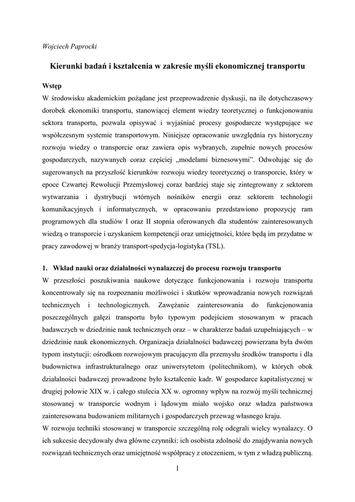 Wojciech Paprocki Kierunki badań i kształcenia w zakresie myśli ekonomicznej transportu Wstęp W środowisku akademickim pożądane jest przeprowadzenie dyskusji, na ile dotychczasowy dorobek ekonomiki transportu, stanowiącej element wiedzy teoretycznej o funkcjonowaniu sektora transportu, pozwala opisywać i wyjaśniać procesy gospodarcze występujące we współczesnym systemie transportowym. Niniejsze opracowanie uwzględnia rys historyczny rozwoju wiedzy o transporcie oraz zawiera opis wybranych, zupełnie nowych procesów gospodarczych, nazywanych coraz częściej „modelami biznesowymi”. Odwołując się do sugerowanych na przyszłość kierunków rozwoju wiedzy teoretycznej o transporcie, który w epoce Czwartej Rewolucji Przemysłowej coraz bardziej staje się zintegrowany z sektorem wytwarzania i dystrybucji wtórnych nośników energii oraz sektorem technologii komunikacyjnych i informatycznych, w opracowaniu przedstawiono propozycję ram programowych dla studiów I oraz II stopnia oferowanych dla studentów zainteresowanych wiedzą o transporcie i uzyskaniem kompetencji oraz umiejętności, które będą im przydatne w pracy zawodowej w branży transport-spedycja-logistyka (TSL). 1. Wkład nauki oraz działalności wynalazczej do procesu rozwoju transportu W przeszłości poszukiwania naukowe dotyczące funkcjonowania i rozwoju transportu koncentrowały się na rozpoznaniu możliwości i skutków wprowadzania nowych rozwiązań technicznych i technologicznych. Zawężanie zainteresowania do funkcjonowania poszczególnych gałęzi transportu było typowym podejściem stosowanym w pracach badawczych w dziedzinie nauk technicznych oraz – w charakterze badań uzupełniających – w dziedzinie nauk ekonomicznych. Organizacja działalności badawczej powierzana była dwóm typom instytucji: ośrodkom rozwojowym pracującym dla przemysłu środków transportu i dla budownictwa infrastrukturalnego oraz uniwersytetom (politechnikom), w których obok działalności badawczej prowadzone było kształcenie kadr. W gospodarce kapitalistycznej w drugiej połowie XIX w. i całego stulecia XX w. ogromny wpływ na rozwój myśli technicznej stosowanej w transporcie wodnym i lądowym miało wojsko oraz władza państwowa zainteresowana budowaniem militarnych i gospodarczych przewag własnego kraju. W rozwoju techniki stosowanej w transporcie szczególną rolę odegrali wielcy wynalazcy. O ich sukcesie decydowały dwa główne czynniki: ich osobista zdolność do znajdywania nowych rozwiązań technicznych oraz umiejętność współpracy z otoczeniem, w tym z władzą publiczną. 1 W licznej grupie twórców nowych rozwiązań technicznych i jednocześnie sprawnych organizatorów zakładów przemysłowych był Hugon Junkers. Po okresie prac nad rozwiązaniami dotyczącymi wykorzystania gazu jako wtórnego nośnika energii w systemach grzewczych przygotował wiele opatentowanych nowatorskich rozwiązań stosowanych najpierw w pojazdach drogowych, a następnie wykorzystywanych do budowy samolotów. Ponieważ w 1933 r. po przejęciu funkcji kanclerza Niemiec przez A. Hitlera odmówił współpracy z władzami, został aresztowany i odsunięty od kierowania swoimi fabrykami, a także od kształcenia nowych pokoleń inżynierów na uczelniach niemieckich. Życiorys H. Junkersa jest jednym z wielu przykładów, iż w sektorze transportu nie sposób było unikać współpracy z władzami państwowymi. Potwierdził to Umberto Agnelli, który przyznał, że jego rodzina przez dziesięciolecia świadomie współpracowała z faszystowskim rządem B. Mussoliniego, gdyż to zapewniało intratne zlecenia państwowe dla rozwijającej się grupy przemysłowej Fiat produkującej środki transportu drogowego, kolejowego i lotniczego. W gospodarce realnego socjalizmu rola poszczególnych osób, jeśli kształtowali twórczo rozwój przemysłu środków transportu oraz przedsiębiorstw transportowych, z zasady nie prowadziła do spektakularnego sukcesu osobistego. Zdarzały się przypadki, iż niektórzy z grona najlepszych wynalazców i organizatorów produkcji ze względu na uzyskiwany dorobek usuwana była w cień. Wobec osób, które wyrażały własne poglądy sprzeczne z obowiązującą linią polityczną władz stosowano represje, z których najłagodniejszą formą było zmuszanie do emigracji. We współczesnym świecie ogromną szansę mają wizjonerzy realizujący projekty związane z wdrażaniem wywrotowych innowacji (disruptive innovations). Jeśli osiągną sukces, mogą doprowadzić do upowszechnienia przełomowych innowacji, które zmieniają trajektorię rozwoju społeczno-gospodarczego. Do grona takich wizjonerów jest zaliczany Elon Musk, który zmierza do uzyskania trzech efektów: upowszechnienia efektywnej ekonomicznie komunikacji kosmicznej (projekt SpaceX), upowszechnienia nowych środków magazynowanie energii (projekt SolarCity) oraz upowszechnienia samochodów osobowych z napędem elektrycznym (projekt Tesla Motors). Realizacja tych projektów odbywa się przy kierowaniu do SpaceX zleceń (i odpowiednich strumieni pieniędzy) przez amerykańskie władze federalne na realizację projektów w ramach programu zagospodarowywania kosmosu, a dodatkowo przy wykorzystaniu przez E. Muska bezzwrotnej pomocy z amerykańskiego budżetu federalnego. Wartość skumulowana tej pomocy osiągnęła na koniec 2015 r. ponad 1 mld USD i jest to w skali światowej rekordowa pomoc publiczna, jaka kiedykolwiek została przyznana prywatnemu 2 inwestorowi przez władze państwowe. W Europie nie ma równie spektakularnych przypadków wspierania indywidualnych osób ze środków publicznych. 2. Rozwój nauk ekonomicznych dotyczących funkcjonowania transportu Po I wojnie światowej w naukach ekonomicznych rozwinięta została koncepcja makroekonomicznych pożytków interwencjonizmu państwowego jako działania antycyklicznego, które pozwala pobudzać lub utrzymywać rozwój gospodarczy, gdy na rynku d