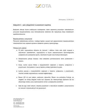 Warszawa, 12.09.2013 Załącznik 2 – opis udogodnień w przestrzeni wspólnej Budynek oferuje liczne praktyczne rozwiązania, które zapewnią przyszłym mieszkańcom poczucie bezpieczeństwa oraz doświadczenia właściwe dla najwyższej klasy światowych apartamentowców. Bezpieczeństwo i utrzymanie Personel całodobowej ochrony i obsługi będzie czuwał nad zapewnieniem bezpieczeństwa mieszkańców oraz zapewni sprawne działanie systemu operacyjnego. Fitness na 8. piętrze ● W pełni wyposażona siłownia do ćwiczeń i relaksu: duża sala obok recepcji z naturalnym oświetleniem, wyposażona w liczne zaawansowane technologicznie urządzenia do uprawiania sportu, słuchania muzyki oraz funkcje telewizyjne. ● Dedykowane pokoje masażu: dwa oddzielne pomieszczenia obok przebieralni i basenu. ● Duża, sucha sauna fińska z bezpośrednim wejściem z basenu, połączona z prysznicami. Korzystanie z sauny będzie umilała dyskretna muzyka. ● Łaźnia parowa z bezpośrednim wejściem z basenu, połączona z prysznicami, również została wyposażona w sprzęt nagłaśniający. ● Basen (25 m) pod stałym nadzorem ratownika. Basen ma podwójną funkcję: ze względu na swoją długość może być używany do intensywnego pływania lub do aktywnego relaksu przy wykorzystaniu wirów i przepływów powietrza. Sala do jogi: obok siłowni, otwarta przestrzeń z naturalnym światłem, przeznaczona do ćwiczeń indywidualnych lub grupowych. ● Zewnętrzny taras słoneczny z jacuzzi i leżakami: duży taras w centrum miasta w pełni wyposażony w wygodne meble ogrodowe. Zewnętrzne jacuzzi z gorącymi kamieniami, z którego można korzystać także w chłodniejsze dni oraz wieczorami, podziwiając wspaniałe miejskie otoczenie. Udogodnienia biznesowe i towarzyskie na 8. piętrze Strefa biznesowa: sala konferencyjna do spotkań biznesowych, przestrzeń biurowa wyposażona w komputery, drukarki, skanery, itd. do prywatnego użytku mieszkańców. ● „Le Club” z barem – prestiżowa przestrzeń, którą można wykorzystywać nie tylko do rodzinnych, ale też biznesowych spotkań w prestiżowym centrum Warszawy. Personel „Le Club” zadba o wspaniałą atmosferę podczas uroczystości obchodzonych w gronie rodziny i przyjaciół, w tym pełny catering, koktajl party lub śniadania na zielonym tarasie. Usługi i praktyczne udogodnienia na parterze ● Całodobowa obsługa concierge: wejście do apartamentów przez lobby i boczne drzwi. Lobby będzie także wykorzystywane jako miejsce spotkań z gośćmi. Centralnym punktem lobby jest recepcja działająca przez całą dobę. ● Personel budynku będzie dostępny przez całą dobę. Zespół będzie pracował na trzy zmiany, po 18 osób każda. ● Usługi dostępne dla mieszkańców są nieograniczone. Niektóre przykłady: zamawianie śniadania do pokoju każdego dnia, lekcje pływania dla dzieci w budynku, masaż w „Le Club”. ● Portier: w hallu recepcyjnym, obok głównego wejścia, odpowiedzialny za opiekę i pomoc podczas wchodzenia i opuszczania budynku, transport bagażu, otwieranie drzwi samochodu. ● 2 Piwnica z winami: bardzo obszerna (88 m , 188 oddzielnych przedziałów, każdy na 70 butelek) i łatwo dostępna z parteru, przeznaczona do przechowywania kolekcji butelek wina rezydentów. ● 2 Duże przechowalnie (23 m ) na parterze: na wypadek większych przesyłek pocztowych, specjalne pomieszczenie do przechowywania paczek czy innych przesyłek dla mieszkańców. ● 2 Duże pomieszczenie na wózki spacerowe (21 m , 10 wózków): pomieszczenie na wózki znajdować się będzie na parterze z łatwym dostępem z zewnątrz. ● 2 Wyjątkowo duże pomieszczenia na rowery (104 m , 36 miejsc) dostępne dla właścicieli mieszkań i mieszkańców budynku: główne pomieszczenie rowerowe znajdować się będzie na parterze, a pozostałe na poziomie garażu. Parking ze stanowiskiem do mycia ● Parking w budynku (288 miejsc postojowych): korzystanie z parkingu wyłącznie dla mieszkańców i ich gości. ● Stanowisko do mycia samochodów wewnątrz budynku (na 3. piętrze) – wygodne miejsce do umycia samochodu, wyposażone w specjalny sprzęt do profesjonalnego czyszczenia. Przestrzeń handlowa i otoczenie budynku ● Sklepy na parterze: przestrzeń handlowa (i recepcyjna) będą jedynymi przestrzeniami dostępnymi dla wszystkich. Wszystkie wejścia do przestrzeni handlowej znajdować się będą na parterze z poziomu chodnika wzdłuż ulicy Złotej. ● Krajobraz: teren wokół budynku został zaprojektowany w taki sposób, aby komponował się z architekturą budynku. Oprócz intensywnej zieleni krajobraz będą kształtowały również zewnętrzne oświetlenie, woda i 3 niesamowite rzeźby autorstwa słynnego europejskiego rzeźbiarza Maurizia Tofolettiego.