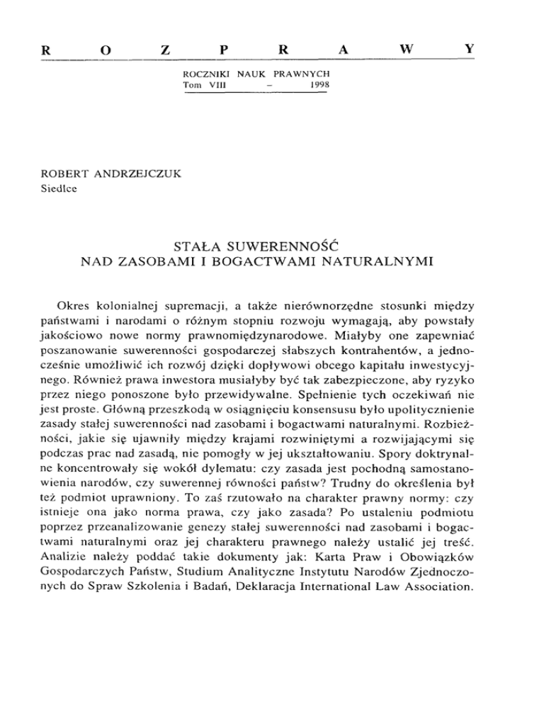 R _ 0_ Z P ROCZNIKI Tom VIII R NAUK A W Y PRAW NYCH - 1998 R O BER T A N D R Z E JC Z U K S ie d lc e STAŁA SU W EREN NOŚĆ NAD ZASOBAM I I BO GA CTW AM I N A TU R A LN Y M I Okres kolonialnej supremacji, a także nierównorzędne stosunki między państwami i narodami o różnym stopniu rozwoju wymagają, aby powstały jakościowo nowe normy prawnomiędzynarodowe. Miałyby one zapewniać poszanowanie suwerenności gospodarczej słabszych kontrahentów, a jedno cześnie umożliwić ich rozwój dzięki dopływowi obcego kapitału inwestycyj nego. Również prawa inwestora musiałyby być tak zabezpieczone, aby ryzyko przez niego ponoszone było przewidywalne. Spełnienie tych oczekiwań nie jest proste. Główną przeszkodą w osiągnięciu konsensusu było upolitycznienie zasady stałej suwerenności nad zasobami i bogactwami naturalnymi. Rozbież ności, jakie się ujawniły między krajami rozwiniętymi a rozwijającymi się podczas prac nad zasadą, nie pomogły w jej ukształtowaniu. Spory doktrynal ne koncentrowały się wokół dylematu: czy zasada jest pochodną samostano wienia narodów, czy suwerennej równości państw? Trudny do określenia był też podmiot uprawniony. To zaś rzutowało na charakter prawny normy: czy istnieje ona jako norma prawa, czy jako zasada? Po ustaleniu podmiotu poprzez przeanalizowanie genezy stałej suwerenności nad zasobami i bogac twami naturalnymi oraz jej charakteru prawnego należy ustalić jej treść. Analizie należy poddać takie dokumenty jak: Karta Praw i Obowiązków Gospodarczych Państw, Studium Analityczne Instytutu Narodów Zjednoczo nych do Spraw Szkolenia i Badań, Deklaracja International Law Association. I. G E N E Z A Z A S A D Y Po raz pierwszy zasada stałej suwerenności nad złożami naturalnymi jako samoistna reguła pojawiła się w projekcie przedłożonym ONZ przez Chile przy okazji prac nad dokumentami praw człowieka w 1952 r. Nawiązano do niej podczas dyskusji nad społeczno-ekonomicznymi prawami jednostek oraz prawami ludów i narodów. Znamienny jest fakt, iż zasada suwerenności nad bogactwami naturalnymi w tym stadium prac nie odnosiła się do państw. Komentując to zjawisko J. Makarczyk przychyla się do poglądu, „iż w kon tekście praw człowieka odesłanie do państwa, które niestety często samo ponosiło odpowiedzialność za niedostateczną realizację praw gospodarczych jednostek, byłoby bezprzedmiotowe” 1. Niestety wskutek czysto politycznych decyzji po dekolonizacji ewoluował podmiot uprawniony tej zasady wypie rając lud czy naród na rzecz państwa. Toteż w późniejszych dokumentach jako następstwo tendencji do umacniania wszelkiej działalności państwa na podległym mu terytorium, suwerenność nad złożami naturalnymi przysługi wała już nie narodom czy ludom, lecz państwu2. Wspomniana propozycja chilijska zgłoszona została podczas VI Sesji Zgromadzenia Ogólnego NZ, które 12 I 1952 r. przyjęło między innymi rezolucję 523/VI w Zintegrowany rozwój gospodarczy i umowy handlowe. W pierwszym jej punkcie czytamy: „[...] kraje zacofane mają prawo do swobodnego określenia sposobów użytkowania ich bogactw naturalnych oraz muszą one korzystać z tych bogactw tak, by być w korzystnej pozycji dla zapewnienia realizacji swych planów rozwoju gospodarczego zgodnie z narodowym interesem i dla przyspieszenia ekspansji gospodarki światowej”3. W tekście tym, po pierwsze, nie zostało użyte pojęcie suwerenności państwa nad jego bogactwami naturalnymi ani też pojęcie samostanowienia, zasto sowane przez Zgromadzenie Ogólne NZ w rezolucji 545/VI, przyjętej cztery tygodnie później. Po drugie, w odróżnieniu od dokumentów dotyczących praw człowieka mówi się o uprawnieniach czy obowiązkach nie ludów czy na rodów, lecz krajów. Po trzecie wreszcie, w rezolucji wspomina się nie tylko o uprawnieniach, lecz także obowiązkach wobec własnych narodów, a także 1 J. M a k a r c z y k, Z a sa d y N ow eg o M ięd zyn a ro d o w eg o Ł a d u G o sp o d a rki Św iatow ej, W roctaw 1988, s. 233. 2 Por. G. F e u e r, La théorie de la so u v e ra in e té su r les resso u rces n a tu re lle s dans les ré so lu tio n s des N a tio n s Unies, [w :] D ro it In te rn a tio n a l e t D évelo p p em en t. A ctes d e colloque in te rn a tio n a l tenu à A lg e r du I I au 14 o c to b re 1976, A lger 1976, s. 101 n. 3 Za: M a k a r c z y k , Z a sa d y, s. 238. wobec całej społeczności międzynarodowej, używając w obu kontekstach pojęcia rozwoju. Na podkreślenie zasługuje również fakt, iż w rezolucji 523/VI brak jest jakiejkolwiek wzmianki o konieczności poszanowania przez kraje zacofane zaciągniętych przez nie zobowiązań międzynarodowych, jak to miało miejsce w opracowanych równolegle dokumentach dotyczących praw człowieka. Do wodzi to z jednej strony braku koordynacji prac prowadzonych w Drugim i Trzecim Komitecie Zgromadzenia Ogólnego NZ, z drugiej zaś przywiązywa nia znacznie mniejszej wagi przez państwa członkowskie ONZ do kwestii prawnej definicji samookreślenia i suwerenności w kontekście gospodarczym w tym okresie. Pojęcie samostanowienia nie występuje także w rezolucji 626/VII Zgroma dzenia Ogólnego NZ z 21 XII 1952 r., w której stwierdzono, iż prawo ludów do swobodnego użytkowania i eksploatacji bogactw wynika w sposób natural ny z ich suwerenności, i zalecono wszystkim państwom członkowskim po wstrzymanie się od jakichkolwiek kroków, bezpośrednich lub pośrednich, które miałyby na celu utrudnianie wykonywania suwerenności nad bogactwa mi naturalnymi przez jakiekolwiek państwo. W rezolucji użyto pojęć ludu i państwa, co pozwala sądzić, iż dla autorów rezolucji samo prawo swobodnej eksploatacji bogactw naturalnych jest atrybutem ludu czy narodu, natomiast jego wykonywanie należy do państwa, które nie powinno napotykać na prze szkody ze strony innych członków społeczności międzynarodowej. W projekcie 
