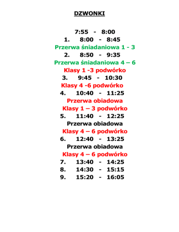 DZWONKI 7:55 - 8:00 1. 8:00 - 8:45 Przerwa śniadaniowa 1 - 3 2. 8:50 - 9:35 Przerwa śniadaniowa 4 – 6 Klasy 1 -3 podwórko 3. 9:45 - 10:30 Klasy 4 -6 podwórko 4. 10:40 - 11:25 Przerwa obiadowa Klasy 1 – 3 podwórko 5. 11:40 - 12:25 Przerwa obiadowa Klasy 4 – 6 podwórko 6. 12:40 - 13:25 Przerwa obiadowa Klasy 4 – 6 podwórko 7. 13:40 - 14:25 8. 14:30 - 15:15 9. 15:20 - 16:05