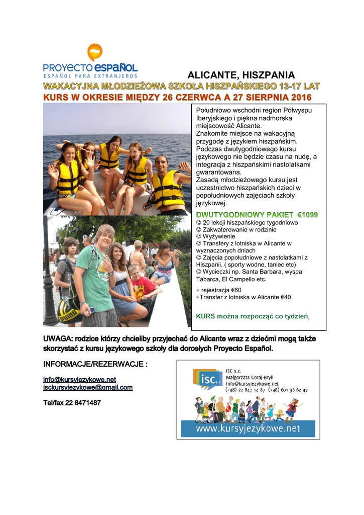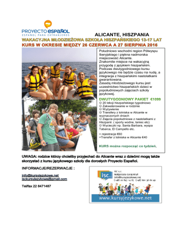 ALICANTE, HISZPANIA Południowo wschodni region Półwyspu Iberyjskiego i piękna nadmorska miejscowość Alicante. Znakomite miejsce na wakacyjną przygodę z językiem hiszpańskim. Podczas dwutygodniowego kursu językowego nie będzie czasu na nudę, a integracja z hiszpańskimi nastolatkami gwarantowana. Zasadą młodzieżowego kursu jest uczestnictwo hiszpańskich dzieci w popołudniowych zajęciach szkoły językowej. 20 lekcji hiszpańskiego tygodniowo Zakwaterowanie w rodzinie Wyżywienie Transfery z lotniska w Alicante w wyznaczonych dniach Zajęcia popołudniowe z nastolatkami z Hiszpanii. ( sporty wodne, taniec etc) Wycieczki np. Santa Barbara, wyspa Tabarca, El Campello etc. + rejestracja €60 +Transfer z lotniska w Alicante €40