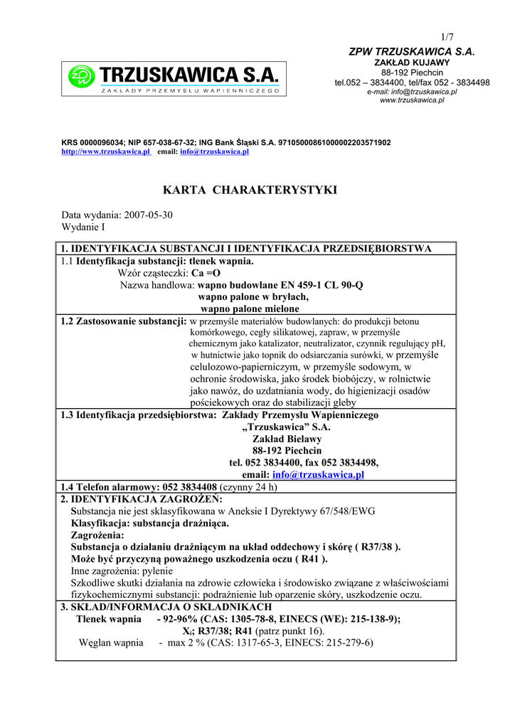 1/7 ZPW TRZUSKAWICA S.A. ZAKŁAD KUJAWY 88-192 Piechcin tel.052 – 3834400, tel/fax 052 - 3834498 e-mail: [email protected] www.trzuskawica.pl KRS 0000096034; NIP 657-038-67-32; ING Bank Śląski S.A. 97105000861000002203571902 http://www.trzuskawica.pl email: [email protected] KARTA CHARAKTERYSTYKI Data wydania: 2007-05-30 Wydanie I 1. IDENTYFIKACJA SUBSTANCJI I IDENTYFIKACJA PRZEDSIĘBIORSTWA 1.1 Identyfikacja substancji: tlenek wapnia. Wzór cząsteczki: Ca =O Nazwa handlowa: wapno budowlane EN 459-1 CL 90-Q wapno palone w bryłach, wapno palone mielone 1.2 Zastosowanie substancji: w przemyśle materiałów budowlanych: do produkcji betonu komórkowego, cegły silikatowej, zapraw, w przemyśle chemicznym jako katalizator, neutralizator, czynnik regulujący pH, w hutnictwie jako topnik do odsiarczania surówki, w przemyśle celulozowo-papierniczym, w przemyśle sodowym, w ochronie środowiska, jako środek biobójczy, w rolnictwie jako nawóz, do uzdatniania wody, do higienizacji osadów pościekowych oraz do stabilizacji gleby 1.3 Identyfikacja przedsiębiorstwa: Zakłady Przemysłu Wapienniczego „Trzuskawica” S.A. Zakład Bielawy 88-192 Piechcin tel. 052 3834400, fax 052 3834498, email: [email protected] 1.4 Telefon alarmowy: 052 3834408 (czynny 24 h) 2. IDENTYFIKACJA ZAGROŻEŃ: Substancja nie jest sklasyfikowana w Aneksie I Dyrektywy 67/548/EWG Klasyfikacja: substancja drażniąca. Zagrożenia: Substancja o działaniu drażniącym na układ oddechowy i skórę ( R37/38 ). Może być przyczyną poważnego uszkodzenia oczu ( R41 ). Inne zagrożenia: pylenie Szkodliwe skutki działania na zdrowie człowieka i środowisko związane z właściwościami fizykochemicznymi substancji: podrażnienie lub oparzenie skóry, uszkodzenie oczu. 3. SKŁAD/INFORMACJA O SKŁADNIKACH Tlenek wapnia - 92-96% (CAS: 1305-78-8, EINECS (WE): 215-138-9); Xi; R37/38; R41 (patrz punkt 16). Węglan wapnia - max 2 % (CAS: 1317-65-3, EINECS: 215-279-6) 2/7 4. PIERWSZA POMOC Rodzaj drogi narażenia Wdychanie Kontakt ze skórą Kontakt z oczami Połknięcie Objawy Sposób udzielania pierwszej pomocy Kaszel, uczucie palenia, krótki oddech Wyprowadzić z miejsca narażenia, chronić przed utratą ciepła. W razie potrzeby stosować sztuczne oddychanie. Potrzebna natychmiastowa pomoc lekarska. Zaczerwienienie Zdjąć odzież, zanieczyszczoną skórę skóry, pieczenie, przetrzeć na sucho, a następnie myć bardzo ból dużą ilością chłodnej wody przynajmniej przez 15 minut. Nie stosować mydła ani środków zobojętniających. Założyć na oparzenia jałowe opatrunki. Wezwać lekarza. Może być konieczna konsultacja dermatologiczna. Zaczerwienienie, Natychmiast usunąć szkła kontaktowe, czystą ból, zaburzenie chusteczką usunąć większe kawałki wapna, widzenia płukać oczy co najmniej 15 minut dużą ilością roztworu soli fizjologicznej lub wody (unikać silnego strumienia ze względu na ryzyko uszkodzenia rogówki). Uwaga: osoby narażone na kontakt tlenku wapnia z oczami powinny być pouczone o konieczności i sposobie ich natychmiastowego płukania. W każdym przypadku skażenia oczu konieczna pilna konsultacja okulistyczna. Uczucie palenia, Nie wywoływać wymiotów. Podawać do ból brzucha, picia zimną czystą wodę, małymi porcjami. wymioty Nigdy nie podawać niczego do picia osobie nieprzytomnej. Potrzebna natychmiastowa pomoc lekarska. Wskazówki ogólne Efekty mogą być opóźnione. W przypadku wystąpienia zaburzeń zasięgnąć porady lekarza, pokazać opakowanie produktu. 5. POSTĘPOWANIE W PRZYPADKU POŻARU Niepalne ciało stałe, zawierające również proszek i pył. Nie podtrzymuje palenia. Reaguje z wodą z wydzieleniem dużej ilości ciepła, która może być wystarczająca do zapalenia materiałów łatwopalnych. W przypadku pożaru w otoczeniu należy stosować gaśnice proszkowe lub śniegowe ABCE. Do gaszenia pożaru nie stosować wody i środków pochodnych. Służby Ratownicze powinny stosować odzież ochronną oraz indywidualne środki ochrony dróg oddechowych i oczu. Nie ma specjalnych wymagań dla sprzętu ochronnego dla Służb Ratowniczych. 6. POSTĘPOWANIE W PRZYPADKU NIEZAMIERZONEGO UWOLNIENIA DO ŚRODOWISKA Rozsypany produkt ostrożnie zebrać (nie wzbijając obłoku pyłu) do zamykanego pojemnika lub pyłoszczelnego worka (patrz pkt 13). Unikać kontaktu substancji z wodą. Używać środków ochrony indywidualnej (patrz pkt 8), zapewnić odpowiednią wentylację oraz kontrolować pylenie. Unikać niezamierzonego uwolnienia do wód 3/7 powierzchniowych i gruntowych (wzrost pH). 7. POSTĘPOWANIE Z SUBSTANCJĄ I JEJ MAGAZYNOWANIE 7.1 Postępowanie z substancją Przechowywać poza zasięgiem dzieci. Podczas stosowania nie jeść, nie pić, unikać bezpośredniego kontaktu substancji z oczami i skórą, unikać wdychania pyłu. Pracować w pomieszczeniach wyposażonych w wentylację ogólną lub miejscową. Przestrzegać zasad higieny osobistej, stosować środki ochrony indywidualnej (patrz pkt 8). 7.2 Magazynowanie Magazynować w pomieszczeniach lub zbiornikach zabezpieczających przed zawilgoceniem, oznakowanych zgodnie z Rozporządzeniem Ministra Zdrowia z dn. 14 marca 2003 r.( DU nr 61 z 2003 r., poz.552) w sprawie sposobu oznakowania miejsc, rurociągów oraz pojemników i zbiorników służących do przechowywania lub zawierających substancje niebezpieczne lub preparaty niebezpieczne. Zabezpieczyć przed możliwością zanieczyszczenia. Nie transportować ani przechowywać w zbiornikach z aluminium zwłaszcza gdy jest ryzyko kontaktu substancji z wodą. Każdy zbiornik, w którym przechowywana jest substancja powinien być wyposażony w odpylacz o odpowiedniej skuteczności, a pomieszczenie w wentylację ogólną lub miejscową. 7.3 Specyficzne zastosowania Nie ma osobnych zaleceń dotyczących specyficznych zastosowań substancji. 8. KONTROLA NARAŻENIA I ŚRODKI OCHRONY INDYWIDUALNEJ 8.1 Wartości graniczne narażenia Zgodnie z Rozporządzeniem Min