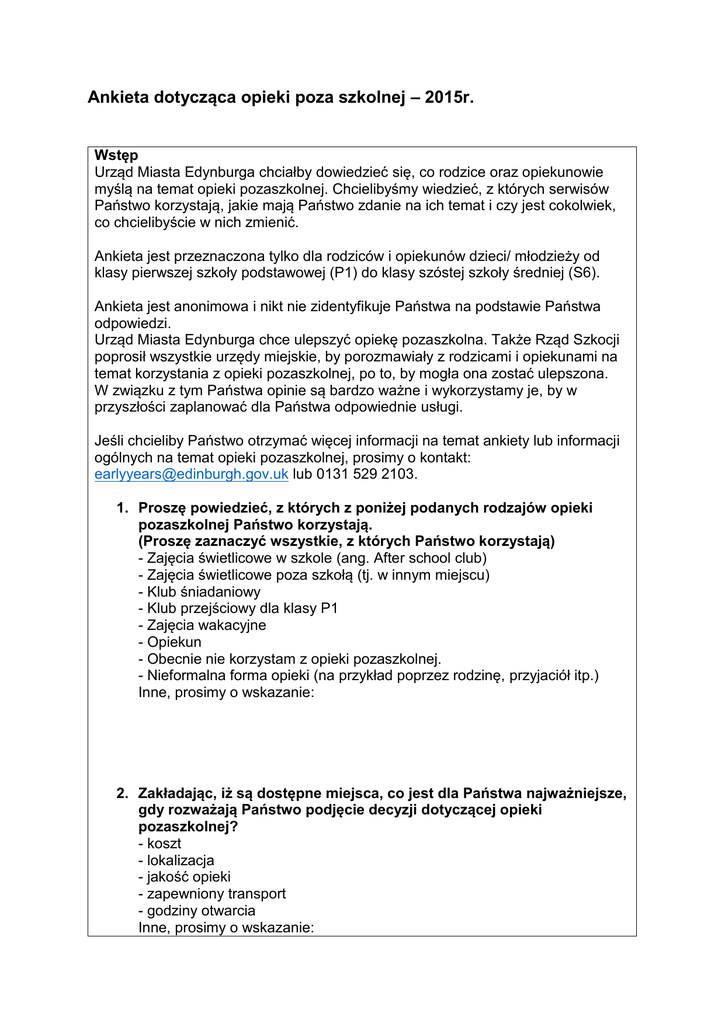 Ankieta dotycząca opieki poza szkolnej – 2015r. Wstęp Urząd Miasta Edynburga chciałby dowiedzieć się, co rodzice oraz opiekunowie myślą na temat opieki pozaszkolnej. Chcielibyśmy wiedzieć, z których serwisów Państwo korzystają, jakie mają Państwo zdanie na ich temat i czy jest cokolwiek, co chcielibyście w nich zmienić. Ankieta jest przeznaczona tylko dla rodziców i opiekunów dzieci/ młodzieży od klasy pierwszej szkoły podstawowej (P1) do klasy szóstej szkoły średniej (S6). Ankieta jest anonimowa i nikt nie zidentyfikuje Państwa na podstawie Państwa odpowiedzi. Urząd Miasta Edynburga chce ulepszyć opiekę pozaszkolna. Także Rząd Szkocji poprosił wszystkie urzędy miejskie, by porozmawiały z rodzicami i opiekunami na temat korzystania z opieki pozaszkolnej, po to, by mogła ona zostać ulepszona. W związku z tym Państwa opinie są bardzo ważne i wykorzystamy je, by w przyszłości zaplanować dla Państwa odpowiednie usługi. Jeśli chcieliby Państwo otrzymać więcej informacji na temat ankiety lub informacji ogólnych na temat opieki pozaszkolnej, prosimy o kontakt: [email protected] lub 0131 529 2103. 1. Proszę powiedzieć, z których z poniżej podanych rodzajów opieki pozaszkolnej Państwo korzystają. (Proszę zaznaczyć wszystkie, z których Państwo korzystają) - Zajęcia świetlicowe w szkole (ang. After school club) - Zajęcia świetlicowe poza szkołą (tj. w innym miejscu) - Klub śniadaniowy - Klub przejściowy dla klasy P1 - Zajęcia wakacyjne - Opiekun - Obecnie nie korzystam z opieki pozaszkolnej. - Nieformalna forma opieki (na przykład poprzez rodzinę, przyjaciół itp.) Inne, prosimy o wskazanie: 2. Zakładając, iż są dostępne miejsca, co jest dla Państwa najważniejsze, gdy rozważają Państwo podjęcie decyzji dotyczącej opieki pozaszkolnej? - koszt - lokalizacja - jakość opieki - zapewniony transport - godziny otwarcia Inne, prosimy o wskazanie: Ankieta dotycząca opieki poza szkolnej 3. Czy jest jakakolwiek pora roku dla Państwa, która jest trudniejsza w zakresie opieki pozaszkolnej? (Prosimy o zaznaczenie tych, które Państwa dotyczą). - okres semestralny - okres wakacji szkolnych - dni, gdy szkoła jest zamknięta dla uczniów (ang. In-service day) Inne, prosimy o wskazanie: 4. Jakie jest Państwa zdanie na temat kosztów opieki pozaszkolnej? Czy są: - zbyt wysokie - odpowiednie - za niskie - nie dotyczy – nie płacę za opiekę pozaszkolną 5. Według Państwa, jako rodzica/ opiekuna, jakie są dwie najlepsze rzeczy dotyczące opieki pozaszkolnej? a) b) 6. A jakie są dwie rzeczy, które chcieliby Państwo ulepszyć? a) b) 7. Czy mają Państwo jakiekolwiek obawy dotyczące opieki pozaszkolnej dla Państwa dzieci w przyszłości? (Na przykład, czy zmieni się opieka, jeśli dziecko zmieni szkołę itp.) Na temat Państwa Pomimo tego, iż jest to anonimowa ankieta, byłby pomocne, jeśli powiedzieliby nam Państwo troszeczkę o sobie, oraz o swojej sytuacji. 8. Proszę powiedzieć nam, do której szkoły uczęszcza Państwa dziecko/ dzieci. Proszę wypisać: Ankieta dotycząca opieki poza szkolnej 9. Państwa dziecko/ dzieci Proszę powiedzieć nam, czy mają Państwo dzieci, które obecnie uczęszczają do: (Proszę zaznaczyć wszystkie odpowiedzi odnoszące się do Państwa sytuacji). - Klasy 1 do 3 szkoły podstawowej - Klasy 4 do 7 szkoły podstawowej - klasy 1 i 2 szkoły średniej - klasy S3 i wyżej 10. Ile dzieci w wieku przedszkolnym (wiek od 0-5 lat) oraz szkolnym mają Państwo? -1 -2 -3 -4 - 5 lub więcej - Wolelibyśmy nie mówić 11. Status zatrudnienia Czy są Państwo obecnie: - zatrudnieni na pełen etat - zatrudnieni na część etatu - studentem lub praktykantem - otrzymują Państwo zasiłki dla osób niepracujących - sprawują Państwo opiekę rodzicielską/ opiekuńczą, nie pracując zawodowo 12. Jaki jest Państwa dochód roczny w gospodarstwie domowym przed podatkiem? (Nie biorąc pod uwagę zasiłków ulg podatkowych, zasiłku rodzinnego itp.) - mniej niż £15.000 - £15.000 - £25.000 - £25.000- £35.000 - £35.000 - £45.000 - £45.000 + - Wolelibyśmy nie mówić 13. Czy są Państwo: - mężczyzną - kobietą Ankieta dotycząca opieki poza szkolnej 14. Czy są Państwo samotnym rodzicem? - tak - nie - Wolelibyśmy nie mówić 15. Jak opisaliby Państwo swoje pochodzenie etniczne? - Białe, Wielka Brytania - Białe, Inne - Azjatyckie – Bangladeskie - Azjatyckie – Chińskie - Azjatyckie – Pakistańskie - Azjatyckie – Inne - Czarne – Afrykańskie - Czarne – Karaibskie - Czarne – Inne - Cygańska społeczność wędrowna - Zawodowa społeczność wędrowna - Inna społeczność wędrowna - Mieszane - Nie wiem - Wolelibyśmy nie mówić 16. Czy według Państwa Wasze dziecko jest niepełnosprawne? (Oznacza to długotrwałą fizyczną lub psychiczna przypadłość, która powoduje, iż czynności codzienne są dla tej osoby bardzo trudne bez odpowiedniego wsparcia). - tak - nie - Wolelibyśmy nie mówić 17. Jeśli odpowiedzieli Państwo ‘tak’, na powyższe pytanie, to czy otrzymują Państwo zasiłek dla osób niepełnosprawnych? (ang. Disability Living Allowance) - tak - nie - Wolelibyśmy nie mówić