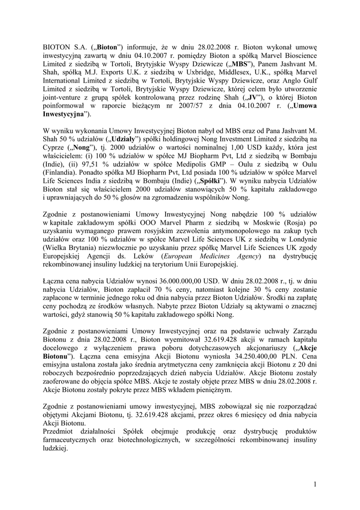 BIOTON S.A. („Bioton”) informuje, że w dniu 28.02.2008 r. Bioton wykonał umowę inwestycyjną zawartą w dniu 04.10.2007 r. pomiędzy Bioton a spółką Marvel Bioscience Limited z siedzibą w Tortoli, Brytyjskie Wyspy Dziewicze („MBS”), Panem Jashvant M. Shah, spółką M.J. Exports U.K. z siedzibą w Uxbridge, Middlesex, U.K., spółką Marvel International Limited z siedzibą w Tortoli, Brytyjskie Wyspy Dziewicze, oraz Anglo Gulf Limited z siedzibą w Tortoli, Brytyjskie Wyspy Dziewicze, której celem było utworzenie joint-venture z grupą spółek kontrolowaną przez rodzinę Shah („JV”), o której Bioton poinformował w raporcie bieżącym nr 2007/57 z dnia 04.10.2007 r. („Umowa Inwestycyjna”). W wyniku wykonania Umowy Inwestycyjnej Bioton nabył od MBS oraz od Pana Jashvant M. Shah 50 % udziałów („Udziały”) spółki holdingowej Nong Investment Limited z siedzibą na Cyprze („Nong”), tj. 2000 udziałów o wartości nominalnej 1,00 USD każdy, która jest właścicielem: (i) 100 % udziałów w spółce MJ Biopharm Pvt, Ltd z siedzibą w Bombaju (Indie), (ii) 97,51 % udziałów w spółce Medipolis GMP – Oulu z siedzibą w Oulu (Finlandia). Ponadto spółka MJ Biopharm Pvt, Ltd posiada 100 % udziałów w spółce Marvel Life Sciences India z siedzibą w Bombaju (Indie) („Spółki”). W wyniku nabycia Udziałów Bioton stał się właścicielem 2000 udziałów stanowiących 50 % kapitału zakładowego i uprawniających do 50 % głosów na zgromadzeniu wspólników Nong. Zgodnie z postanowieniami Umowy Inwestycyjnej Nong nabędzie 100 % udziałów w kapitale zakładowym spółki OOO Marvel Pharm z siedzibą w Moskwie (Rosja) po uzyskaniu wymaganego prawem rosyjskim zezwolenia antymonopolowego na zakup tych udziałów oraz 100 % udziałów w spółce Marvel Life Sciences UK z siedzibą w Londynie (Wielka Brytania) niezwłocznie po uzyskaniu przez spółkę Marvel Life Sciences UK zgody Europejskiej Agencji ds. Leków (European Medicines Agency) na dystrybucję rekombinowanej insuliny ludzkiej na terytorium Unii Europejskiej. Łączna cena nabycia Udziałów wynosi 36.000.000,00 USD. W dniu 28.02.2008 r., tj. w dniu nabycia Udziałów, Bioton zapłacił 70 % ceny, natomiast kolejne 30 % ceny zostanie zapłacone w terminie jednego roku od dnia nabycia przez Bioton Udziałów. Środki na zapłatę ceny pochodzą ze środków własnych. Nabyte przez Bioton Udziały są aktywami o znacznej wartości, gdyż stanowią 50 % kapitału zakładowego spółki Nong. Zgodnie z postanowieniami Umowy Inwestycyjnej oraz na podstawie uchwały Zarządu Biotonu z dnia 28.02.2008 r., Bioton wyemitował 32.619.428 akcji w ramach kapitału docelowego z wyłączeniem prawa poboru dotychczasowych akcjonariuszy („Akcje Biotonu”). Łączna cena emisyjna Akcji Biotonu wyniosła 34.250.400,00 PLN. Cena emisyjna ustalona została jako średnia arytmetyczna ceny zamknięcia akcji Biotonu z 20 dni roboczych bezpośrednio poprzedzających dzień nabycia Udziałów. Akcje Biotonu zostały zaoferowane do objęcia spółce MBS. Akcje te zostały objęte przez MBS w dniu 28.02.2008 r. Akcje Biotonu zostały pokryte przez MBS wkładem pieniężnym. Zgodnie z postanowieniami umowy inwestycyjnej, MBS zobowiązał się nie rozporządzać objętymi Akcjami Biotonu, tj. 32.619.428 akcjami, przez okres 6 miesięcy od dnia nabycia Akcji Biotonu. Przedmiot działalności Spółek obejmuje produkcję oraz dystrybucję produktów farmaceutycznych oraz biotechnologicznych, w szczególności rekombinowanej insuliny ludzkiej. 1 Dzięki realizacji JV, Bioton uzyskał dostęp do produktów innowacyjnych oraz biotechnologicznych w zaawansowanych fazach rozwoju oraz procesów rejestracji w Europejskiej Agencji ds. Leków, a ponadto możliwości wzajemnych synergii w zakresie wykorzystania infrastruktury produkcyjnej oraz istniejących sieci dystrybucji. Technologie nowych produktów biotechnologicznych, m.in. analogów insuliny ludzkiej, będą wdrażane w centrum badawczo-rozwojowym w Finlandii, które posiada wymagane certyfikaty do rejestracji produktów w EMEA i FDA. Realizacja powyższej transakcji stanowi element realizacji planu budowy nowoczesnej firmy biotechnologicznej działającej na rynku globalnym, a w szczególności element realizacji strategii rozwoju Grupy Bioton, związanej z wejściem na rynki Europy Zachodniej i USA oraz rozwojem swojej działalności na tych rynkach. 2