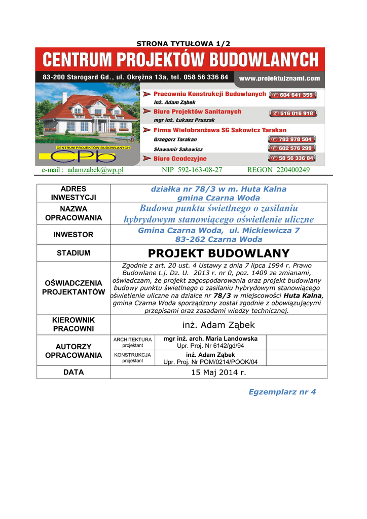 STRONA TYTUŁOWA 1/2 e-mail : [email protected] NIP 592-163-08-27 REGON 220400249 ADRES INWESTYCJI działka nr 78/3 w m. Huta Kalna gmina Czarna Woda NAZWA OPRACOWANIA Budowa punktu świetlnego o zasilaniu hybrydowym stanowiącego oświetlenie uliczne INWESTOR Gmina Czarna Woda, ul. Mickiewicza 7 83-262 Czarna Woda STADIUM PROJEKT BUDOWLANY Zgodnie z art. 20 ust. 4 Ustawy z dnia 7 lipca 1994 r. Prawo Budowlane t.j. Dz. U. 2013 r. nr 0, poz. 1409 ze zmianami, oświadczam, że projekt zagospodarowania oraz projekt budowlany OŚWIADCZENIA budowy punktu świetlnego o zasilaniu hybrydowym stanowiącego PROJEKTANTÓW oświetlenie uliczne na działce nr 78/3 w miejscowości Huta Kalna, gmina Czarna Woda sporządzony został zgodnie z obowiązującymi przepisami oraz zasadami wiedzy technicznej. KIEROWNIK PRACOWNI AUTORZY OPRACOWANIA DATA inż. Adam Ząbek ARCHITEKTURA projektant KONSTRUKCJA projektant mgr inż. arch. Maria Landowska Upr. Proj. Nr 6142/gd/94 inż. Adam Ząbek Upr. Proj. Nr POM/0214/POOK/04 15 Maj 2014 r. Egzemplarz nr 4 STRONA TYTUŁOWA 2/2 Spis treści: OPIS TECHNICZNY ..............................................................................................................3 I. DANE OGÓLNE: ..............................................................................................................3 1. PODSTAWA OPRACOWANIA. ...............................................................................3 2. PRZEPISY PRAWNE. ................................................................................................3 II. CZĘŚĆ OPISOWA: ...........................................................................................................4 1. PRZEDMIOT INWESTYCJI....................................................................................4 2. ISTNIEJĄCY STAN ZAGOSPODAROWANIA DZIAŁKI. ..................................4 3. PROJEKTOWANE ZAGOSPODAROWANIE DZIAŁKI. ....................................5 4. CHARAKTERYSTYKA ENERGETYCZNA BUDOWLI. ...........................................6 5. CHARAKTERYSTYKA EKOLOGICZNA BUDOWLI. .............................................7 6. INNE DANE. ................................................................................................................7 7. DANE KONSTRUKCYJNO – MATERIAŁOWE ...................................................7 III. INFORMACJE DO OPRACOWANIA PRZEZ KIEROWNIKA BUDOWY.................10 PLANU BEZPIECZEŃSTWA I OCHRONY ZDROWIA........................................................10 UPRAWNIENIA PROJEKTANTÓW...............................................................................12 UZGODNIENIA.....................................................................................................................13 RYSUNKI ................................................................................................................................14 2 OPIS TECHNICZNY do projektu zagospodarowania terenu dla budowy punktu świetlnego o zasilaniu hybrydowym stanowiącego oświetlenie uliczne na działce nr 78/3 w m. Huta Kalna, gmina Czarna Woda. I.DANE OGÓLNE: 1. PODSTAWA OPRACOWANIA. 1.1 Zlecenie Inwestora. 1.2 Mapa do celów projektowych w skali 1:500. 1.3 Wizja w terenie. 2. PRZEPISY PRAWNE. Ustawa z dnia 7 lipca 1994 r., Prawo Budowlane (Dz. U. Nr 10.243.1623 z zmianami) Ustawa z dnia 27 marca 2003 r., o zmianie Ustawy, Prawo Budowlane oraz o zmianie niektórych Ustaw (Dz. U. nr 80, poz. 718) Rozporządzenie Ministra Infrastruktury, z dnia 23 czerwca 2003 r., w sprawie informacji dotyczącej bezpieczeństwa i ochrony zdrowia oraz planu bezpieczeństwa i ochrony zdrowia (Dz. U. Nr 120, poz.1126) Rozporządzenie Ministra Infrastruktury, z dnia 3 lipca 2003 r. w sprawie szczegółowego zakresu i formy projektu budowlanego (Dz. U. Nr 120, poz. 1133). Miejscowy plan zagospodarowania przestrzennego dla m. Huta Kalna Ustawa z dnia 27 marca 2003 r., o planowaniu i zagospodarowaniu przestrzennym (Dz. U. Nr 80, poz. 717) Rozporządzenie Ministra Infrastruktury, z dnia 12 kwietnia 2002 r., w sprawie warunków technicznych jakim powinny odpowiadać budynki i ich usytuowanie (Dz. U. Nr 75, poz. 690) 3 II.CZĘŚĆ OPISOWA: 1. PRZEDMIOT INWESTYCJI. 1.1. Budowa punktu świetlnego o zasilaniu hybrydowym stanowiącego oświetlenie uliczne. Projektowany punkt świetlny będzie oświetlał ogólnodostępne miejsce publiczne – drogę powiatową nr 2722G w m. Huta Kalna . Punkt świetlny składa się z: -słupa oświetleniowego(stalowego) z betonowym fundamentem prefabrykowanym -2 opraw oświetleniowych zamocowanych na wysięgnikach -kolektora słonecznego(paneli ogniw fotowoltaicznych) -turbiny wiatrowej -akumulatorów żelowych(bezobsługowych) o napięciu 12V DC i pojemności minimum 100Ah -czujnika zmierzchowego Projektowany punkt świetlny będzie stanowił konstrukcję hybrydową, autonomiczną(zasilany energią z turbiny wiatrowej oraz z 2 paneli fotowoltaicznych). Wymagana autonomia w przypadku skrajnie niekorzystnych warunków atmosferycznych – min. 24h. Szczegółowe rozwiązania będą uzależnione od wyboru konkretnego producenta wskazanego przez inwestora. 1.2. Miejsce usytuowania – działka nr 78/3, obręb Huta Kalna , gm. Czarna Woda Inwestor – Gmina Czarna Woda ul. Mickiewicza 7, 83-262 Czarna Woda 2. ISTNIEJĄCY STAN ZAGOSPODAROWANIA DZIAŁKI. 2.1. Opis. Inwestycja zlokalizowana jest poza obszarem zwartej zabudowy m. Huta Kalna (teren zabudowy mieszkalnej MN, oraz zabudowy mieszkalno-usługowej MN/UR9), w pasie drogowym drogi powiatowej nr 2722G. 2.2. Warunki geotechniczne. Na podstawie próbnego wykopu stwierdza się występowanie gruntów piaszczysto – gliniastych. Kategoria posadowienia budowli I. Kierownik budowy w czasie wykonywania robót ziemnych powinien potwierdzić zgodność założonej kategorii gruntu wpisem do dziennika budowy. 2.3. Adaptacja terenu. Przed zamierzeniem budowlanym należy zebrać humus. 4 2.4. Planowane rozbiórki i wycinki. Nie występują w pr
