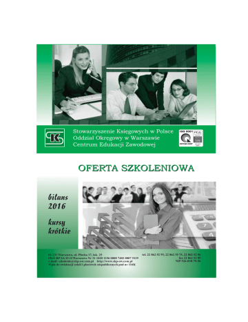 Stowarzyszenie Ksiêgowych w Polsce Oddzia³ Okrêgowy w Warszawie Centrum Edukacji Zawodowej ISO 9001 QMS OFERTA SZKOLENIOWA bilans 2016 kursy krótkie 01-231 Warszawa, ul. P³ocka 17, lok. 25 PKO BP SA 15 O/Warszawa Nr 31 1020 1156 0000 7402 0007 5119 e-mail: [email protected] http://www.skp-ow.com.pl Wpis do ewidencji szkó³ i placówek niepublicznych pod nr 116K tel. 22 862 52 93, 22 862 35 75, 22 862 52 96 fax 22 862 52 95 NIP 526-030-79-56 ZOSTAÑ CZ£ONKIEM STOWARZYSZENIA KSIÊGOWYCH W POLSCE Cz³onkiem zwyczajnym mo¿e byæ obywatel polski, maj¹cy nieposzlakowan¹ opiniê i pe³n¹ zdolnoœæ do czynnoœci prawnych, wykonuj¹cy zawód ksiêgowego lub inny zawód pokrewny zwi¹zany z rachunkowoœci¹. Cz³onkiem stowarzyszenia mo¿e byæ równie¿ cudzoziemiec maj¹cy miejsce zamieszkania na terytorium RP. Cz³onkiem zwyczajnym – dyplomowanym ksiêgowym mo¿e byæ osoba, która spe³nia wymagania okreœlone dla cz³onków zwyczajnych, a ponadto posiada udokumentowane kwalifikacje: dyplomowanego bieg³ego ksiêgowego lub bieg³ego rewidenta lub dyplomowanego ksiêgowego lub równorzêdne. Op³aty cz³onkowskie – minimalna roczna sk³adka cz³onkowska 50,00 z³, jednorazowa op³ata przy zapisie 20,00 z³ Cz³onkowie zwyczajni zrzeszeni s¹ w nastêpuj¹cych ko³ach: bran¿owych – Spó³ek, Biur Rachunkowych, Instytutów, terenowych – w P³oñsku i w Ostro³êce Cz³onkami wspieraj¹cymi mog¹ byæ osoby prawne, organizacje lub instytucje interesuj¹ce siê dzia³alnoœci¹ Stowarzyszenia, które zadeklaruj¹ dowoln¹ kwotê poparcia finansowego dla Stowarzyszenia i zostan¹ przyjête przez zarz¹d okrêgowy na podstawie pisemnej deklaracji. Korzyœci z cz³onkostwa: – – – ulga w op³acie za szkolenia organizowane przez Oddzia³ Okrêgowy w Warszawie; mo¿liwoœæ nieodp³atnego korzystania z odczytów na aktualne tematy z zakresu rachunkowoœci, prawa podatkowego i prawa gospodarczego organizowanych dla cz³onków Stowarzyszenia; bezp³atne konsultacje z zakresu rachunkowoœci, prawa podatkowego, prawa gospodarczego i prawa pracy. Wiêcej informacji na temat cz³onkostwa mo¿na uzyskaæ pod numerami telefonów: 22 862-52-96 i 22 862-52-94 ISO 9001 ZETOM-CERT Szanowni Pañstwo, Stowarzyszenie Ksiêgowych w Polsce Oddzia³ Okrêgowy w Warszawie Centrum Edukacji Zawodowej z przyjemnoœci¹ zaprasza Pañstwa do zapoznania siê z nasz¹ ofert¹ szkoleniow¹. Stowarzyszenie Ksiêgowych w Polsce jest najstarsz¹ i najwiêksz¹ polsk¹ organizacj¹ zrzeszaj¹c¹ przedstawicieli œrodowisk zawodowych zwi¹zanych z rachunkowoœci¹ i finansami. Od 1907 roku Stowarzyszenie dok³ada wszelkich starañ, aby jego cz³onkowie odznaczali siê zarówno najwy¿szej jakoœci kompetencjami zawodowymi, jak i wysokim poziomem etyki. Od 59 lat na naszym obszarze terytorialnym misjê t¹ wype³nia Oddzia³ Okrêgowy w Warszawie. Jako jedna z dwóch polskich organizacji Stowarzyszenie Ksiêgowych w Polsce jest od 1989 roku cz³onkiem zwyczajnym Miêdzynarodowej Federacji Ksiêgowych (IFAC), której cz³onkami s¹ organizacje ze wszystkich zak¹tków œwiata. Zgodnie z wytycznymi Miêdzynarodowej Federacji Ksiêgowych Stowarzyszenie prowadzi certyfikacjê zawodu ksiêgowego, którego czterostopniowa œcie¿ka edukacyjna prowadzi do uzyskania tytu³u zawodowego „dyplomowanego ksiêgowego”. Niepewnoœæ na obecnym rynku pracy powoduje koniecznoœæ nieustannego podnoszenia swoich kwalifikacji, a szybko zmieniaj¹ce siê przepisy prawa i warunki prowadzenia dzia³alnoœci gospodarczej wymagaj¹ od œrodowiska ksiêgowych i finansistów ci¹g³ej aktualizacji ich wiedzy. Tym, którzy dopiero zaczynaj¹ sw¹ przygodê z rachunkowoœci¹, Stowarzyszenie zapewnie mo¿liwoœæ zdobycia gruntownej wiedzy i uzyskania nowych kwalifikacji zawodowych. Z kolei tym, którzy poznali ju¿ zawi³¹ sztukê rewizji finansowej i rachunkowoœci, oferujemy mo¿liwoœæ ci¹g³ego doskonalenia poprzez zapoznawanie ich z najnowszymi rozwi¹zaniami prawa krajowego i miêdzynarodowego oraz sposobami jego stosowania. Na podstawie dotychczasowych doœwiadczeñ, wymagañ naszych Klientów oraz ich sugestii staramy siê nieustannie dostosowywaæ nasz¹ ofertê szkoleniow¹ do Pañstwa potrzeb. Kursy wzbogacamy o nowe formy metodyczno-dydaktyczne i bogatsze materia³y szkoleniowe. Staramy siê, aby nasze kursy sta³y siê wyznacznikiem fachowoœci i nowoczesnoœci. Jednoczeœnie z satysfakcj¹ informujemy, ¿e Mazowiecki Kurator Oœwiaty w Warszawie na podstawie rozporz¹dzenia Ministra Edukacji Narodowej i Sportu z dnia 20 grudnia 2003 roku w sprawie akredytacji placówek i oœrodków prowadz¹cych kszta³cenie ustawiczne w formach pozaszkolnych wyda³ trzy pozytywne decyzje o przyznaniu akredytacji na organizowane przez nasz¹ placówkê kursy, okreœlone w treœci tych decyzji. Akredytacje te zgodnie z art. 68b ustawy z dnia 7 wrzeœnia 1991 roku o systemie oœwiaty stanowi¹ potwierdzenie spe³niania przez nasz¹ placówkê okreœlonych w przepisach prawa wymogów oraz zapewniaj¹ wysok¹ jakoœæ prowadzonego procesu kszta³cenia. Liczymy, ¿e proponowane przez nas kursy spotkaj¹ siê z Pañstwa zainteresowaniem. Z powa¿aniem Za organ prowadz¹cy Za placówkê kszta³cenia ustawicznego Dyrektor Placówki Stowarzyszenie Ksiêgowych w Polsce Oddzia³ Okrêgowy w Warszawie Centrum Edukacji Zawodowej Wiceprezes Zarz¹du Oddzia³u Okrêgowego w Warszawie Stowarzyszenia Ksiêgowych w Polsce Prezes Zarz¹du Oddzia³u Okrêgowego w Warszawie Stowarzyszenia Ksiêgowych w Polsce Pawe³ Przedpe³ski Agnieszka Cicha Jerzy Koniecki Warszawa, wrzesieñ 2016 roku BILANS BILANS 2016 MODU£ I – ZAMKNIÊCIE ROKU I SPORZ¥DZANIE JEDNOSTKOWYCH SPRAWOZDAÑ FINANSOWYCH ZE SZCZEGÓLNYM UWZGLÊDNIENIEM ZNOWELIZOWANEJ USTAWY O RACHUNKOWOŒCI Modu³ ten obejmuje 8 godzin wyk³adowych i realizowany jest w ci¹gu jednego dnia. Wyk³adowcy i terminy szkolenia: Termin szkolenia Wyk³adowca 14 listopada 2016 r. Jadwiga Godlewska – bieg³y 