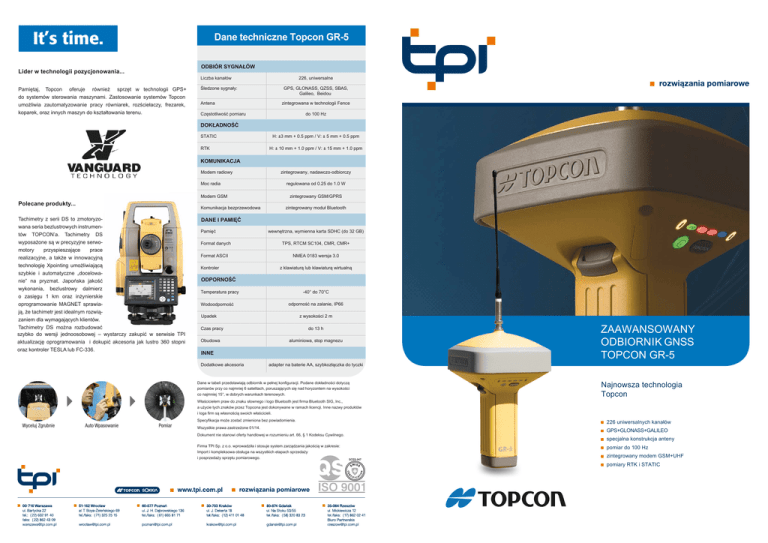 Dane techniczne Topcon GR-5 ODBIÓR SYGNAŁÓW Lider w technologii pozycjonowania... Liczba kanałów Pamiętaj, Topcon oferuje również sprzęt w technologii GPS+ do systemów sterowania maszynami. Zastosowanie systemów Topcon umożliwia zautomatyzowanie pracy równiarek, rozściełaczy, frezarek, koparek, oraz innych maszyn do kształtowania terenu. Śledzone sygnały: Antena 226, uniwersalne GPS, GLONASS, QZSS, SBAS, Galileo, Beidou zintegrowana w technologii Fence Częstotliwość pomiaru do 100 Hz DOKŁADNOŚĆ STATIC RTK H: ±3 mm + 0.5 ppm / V: ± 5 mm + 0.5 ppm H: ± 10 mm + 1.0 ppm / V: ± 15 mm + 1.0 ppm KOMUNIKACJA Modem radiowy Moc radia Modem GSM Polecane produkty... Komunikacja bezprzewodowa Tachimetry z serii DS to zmotoryzowana seria bezlustrowych instrumentów TOPCON’a. Tachimetry DS wyposażone są w precyzyjne serwomotory przyspieszające prace realizacyjne, a także w innowacyjną technologię Xpointing umożliwiającą szybkie i automatyczne „docelowanie” na pryzmat. Japońska jakość wykonania, bezlustrowy dalmierz o zasięgu 1 km oraz inżynierskie oprogramowanie MAGNET sprawiają, że tachimetr jest idealnym rozwiązaniem dla wymagających klientów. Tachimetry DS można rozbudować szybko do wersji jednoosobowej – wystarczy zakupić w serwisie TPI aktualizację oprogramowania i dokupić akcesoria jak lustro 360 stopni oraz kontroler TESLA lub FC-336. zintegrowany, nadawczo-odbiorczy regulowana od 0.25 do 1.0 W zintegrowany GSM/GPRS zintegrowany moduł Bluetooth DANE I PAMIĘĆ Pamięć Format danych Format ASCII Kontroler wewnętrzna, wymienna karta SDHC (do 32 GB) TPS, RTCM SC104, CMR, CMR+ NMEA 0183 wersja 3.0 z klawiaturą lub klawiaturą wirtualną ODPORNOŚĆ Temperatura pracy Wodoodporność -40° do 70°C odporność na zalanie, IP66 z wysokości 2 m Upadek Czas pracy Obudowa do 13 h aluminiowa, stop magnezu INNE Dodatkowe akcesoria adapter na baterie AA, szybkozłączka do tyczki Dane w tabeli przedstawiają odbiornik w pełnej konfiguracji. Podane dokładności dotyczą pomiarów przy co najmniej 6 satelitach, poruszających się nad horyzontem na wysokości co najmniej 15°, w dobrych warunkach terenowych. Właścicielem praw do znaku słownego i logo Bluetooth jest firma Bluetooth SIG, Inc., a użycie tych znaków przez Topcona jest dokonywane w ramach licencji. Inne nazwy produktów i loga firm są własnością swoich właścicieli. Wyceluj Zgrubnie Auto Wpasowanie Pomiar Specyfikacja może zostać zmieniona bez powiadomienia. Wszystkie prawa zastrzeżone 01/14. Dokument nie stanowi oferty handlowej w rozumieniu art. 66, § 1 Kodeksu Cywilnego. Firma TPI Sp. z o.o. wprowadziła i stosuje system zarządzania jakością w zakresie: Import i kompleksowa obsługa na wszystkich etapach sprzedaży i posprzedaży sprzętu pomiarowego. ZAAWANSOWANY ODBIORNIK GNSS TOPCON GR-5 Najnowsza technologia Topcon 226 uniwersalnych kanałów GPS+GLONASS+GALILEO specjalna konstrukcja anteny pomiar do 100 Hz zintegrowany modem GSM+UHF pomiary RTK i STATIC T Odbiornik GR-5 – najnowsza generacja systemów RTK TOPCON opcon jako jeden z pierwszych wprowadził odbiornik w technologii G3 łączący pomiary satelitarne z systemów GPS, GLONASS i GALILEO. Najnowsza technologia zastosowana w odbiorniku GR-5 pozwala w przyszłości na pracę ze wszystkimi systemami satelitarnymi: Niezwykłe możliwości nowego odbiornika GR-5 pozwalają na śledzenie wszystkich obecnych i przyszłych sygnałów z systemów GPS/GLONASS/GALILEO oraz dzięki innowacyjnym cechom użytkowym sprawiają, że jest to najprawdopodobniej najlepszy odbiornik GPS. Dzięki temu jest on gotowy do pracy dziś jak i w przyszłości gdy wszystkie systemy będą ukończone i w pełni funkcjonujące. Kombinacja możliwości i zaawansowanej technologii. Zastosowana w GR-5 nowa antena, stworzona w opatentowanej technologii Fence pozwala na jeszcze dokładniejsze pomiary wykonywane w trudnych warunkach. W połączeniu ze specjalnymi algorytmami oraz procesorem najnowszej generacji, odbiornik redukuje sygnały odbite (multipath) zapewniając jednocześnie odbiór słabych sygnałów i ich precyzyjne przetwarzanie. 2 Zaawansowana redukcja wielodrożności Technologia Fence, w połączeniu ze specjalnie stworzonymi algorytmami, pozwala na wykrycie i wyeliminowanie sygnałów odbitych, co pozwala na pracę odbiornikiem w trudnym terenie. Dowolne kontrolery i akcesoria Do pracy z odbiornikiem GR-5 można wykorzystać jeden z czterech dostępnych kontrolerów: - superlekki FC-25A - uniwersalny FC-250 - FC-336 z wbudowanym modemem GSM - FC-2600 z klawiaturą alfanumeryczną - TESLA z ekrane 5,7” stacji GPS / GLONASS zwiêkszaj¹ca skutecznośæ i efektywnośæ prac GNSS. 9 5 11 12 13 6 1 Precyzyjna antena GNSS 2 226 uniwersalnych kanałów 4 Całkowicie zabezpieczone porty komunikacyjne 5 Dwie wymienne baterie Li-Ion oraz adapter na “paluszki” AA Gniazdo karty pamięci SDHC 6 ze 118 8 10 4 Maksymalna czułość Dzięki antenie wykonanej w technologii Fence odbiornik śledzi sygnały niskich satelitów, a także wykorzystuje słabe sygnały niedostępne dla innych odbiorników. 3 Tylko dla klientów TPI - poprawka powierzchniowa 3 Zaawansowana technologia GR-5 połączona jest z super wytrzymałą konstrukcją odporną na zalanie, niskie temperatury czy upadek z wysokości 2 metrów. PEŁNA WSPÓŁPRACA Z SIECIAMI TPI NETpro I ASG-EUPOS Dzięki tym wszystkim innowacjom Topcon GR-5 jest najbardziej zaawansowanym odbiornikiem GNSS na rynku. 7 Znana z innych odbiorników opatentowana innowacyjna technologia uniwersalnych kanałów sprawia, że odbiornik nie ma przyporządkowanej stałej ilości kanałów danym systemom ale automatycznie i elastycznie dostosowuje ich ilość zgodnie z bieżącym zapotrzebowaniem. Uzupełnieniem całości jest wydajne zasilanie (2 wymienne baterie Li-Ion) oraz dwa zintegrowane modemy – GSM oraz UHF. Dzięki temu GR-5 może pracować zarówno z sieciami referencyjnymi jak i jako
