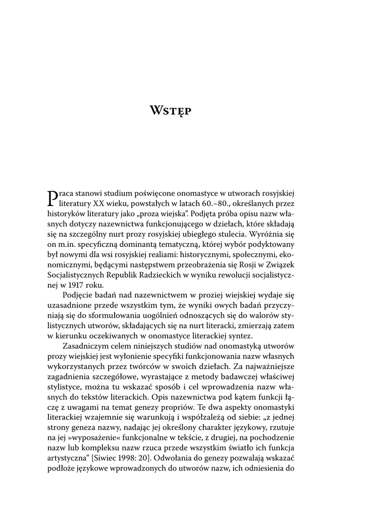 Wstęp Wstp P raca stanowi studium poświęcone onomastyce w utworach rosyjskiej literatury XX wieku, powstałych w latach .−., określanych przez historyków literatury jako „proza wiejska”. Podjęta próba opisu nazw własnych dotyczy nazewnictwa funkcjonującego w dziełach, które składają się na szczególny nurt prozy rosyjskiej ubiegłego stulecia. Wyróżnia się on m.in. specyficzną dominantą tematyczną, której wybór podyktowany był nowymi dla wsi rosyjskiej realiami: historycznymi, społecznymi, ekonomicznymi, będącymi następstwem przeobrażenia się Rosji w Związek Socjalistycznych Republik Radzieckich w wyniku rewolucji socjalistycznej w roku. Podjęcie badań nad nazewnictwem w proziej wiejskiej wydaje się uzasadnione przede wszystkim tym, że wyniki owych badań przyczyniają się do sformułowania uogólnień odnoszących się do walorów stylistycznych utworów, składających się na nurt literacki, zmierzają zatem w kierunku oczekiwanych w onomastyce literackiej syntez. Zasadniczym celem niniejszych studiów nad onomastyką utworów prozy wiejskiej jest wyłonienie specyfiki funkcjonowania nazw własnych wykorzystanych przez twórców w swoich dziełach. Za najważniejsze zagadnienia szczegółowe, wyrastające z metody badawczej właściwej stylistyce, można tu wskazać sposób i cel wprowadzenia nazw własnych do tekstów literackich. Opis nazewnictwa pod kątem funkcji łączę z uwagami na temat genezy propriów. Te dwa aspekty onomastyki literackiej wzajemnie się warunkują i współzależą od siebie: „z jednej strony geneza nazwy, nadając jej określony charakter językowy, rzutuje na jej »wyposażenie« funkcjonalne w tekście, z drugiej, na pochodzenie nazw lub kompleksu nazw rzuca przede wszystkim światło ich funkcja artystyczna” [Siwiec : ]. Odwołania do genezy pozwalają wskazać podłoże językowe wprowadzonych do utworów nazw, ich odniesienia do Wstp 8 słownika i systemu onimicznego, a co za tym idzie, pozwalają określić stosunek między onomastyką świata przedstawionego utworów a onomastyką świata realnego, w konsekwencji zaś porównać fikcję artystyczną z obiektywną rzeczywistością. Wyodrębniając funkcje nazewnictwa, odwołuję się przede wszystkim do prac badaczy lubelskiej szkoły funkcjonalnej, przyjmujących pojęcie funkcji za nadrzędną kategorię interpretacyjną [Kosyl , ; Siwiec ]. Trzeba od razu zaznaczyć, że zestawy funkcji wydzielanych przez badaczy dostosowuję do specyfiki materiału doświadczalnego, podzielając opinię K. Rymuta, że funkcje nazewnictwa należy badać „nie podciągając tych funkcji do z góry przyjętych szablonów” [Rymut : ]. Również układ pracy jest następstwem osobliwości wyekscerpowanego materiału. Moim zamierzeniem było wyeksponowanie najważniejszych funkcji dla poszczególnych klas nazw wprowadzonych do utworów, dlatego w przypadku kumulowania się funkcji w wypadku tych samych nazw − a jest to zjawisko rzadkie − funkcje dodatkowe omawiam przy opisie prawidłowości, a nie osobno. Takie podejście było możliwe dzięki właściwościom tekstów wziętych pod uwagę, które są na tyle jednorodne, że w każdym z nich te same funkcje są dominujące. Wyłaniając funkcje, uwzględniam także takie kategorie interpretacyjne, jak poetyka utworu (gatunku) i konwencja literacka. Jako główne środki organizacji przestrzeni świata przedstawionego zostały omówione nazwy geograficzne. W przeważającej większości autentyczne − pod względem leksykalnym i denotacyjnym lub tylko leksykalnym − są one jednym z najbardziej wyrazistych wykładników realistycznej konwencji prozy wiejskiej. Dominującej dla nich funkcji lokalizacji w przestrzeni towarzyszy funkcja informacyjna, polegająca na ukazaniu związków bohaterów ze światem zewnętrznym, oraz emotywna, zasadzająca się na związku nazw z zabarwionym uczuciowo stosunkiem do nich pisarza. Imiona, patronimika i nazwiska zostały przedstawione w aspekcie głównej dla nich funkcji identyfikacyjno-dyferencjacyjnej. Dla tych klas antroponimów, które, dodajmy, wprowadzone nie funkcjonują jako osobne nazwy, a w „szeregu paradygmatycznym” [Фонякова ], identyfikacja i dyferencjacja ma szczególne uwarunkowania tekstowe. Jednocześnie, jako istotne, omówione są tu pozostające z nimi we wza- Określenie I. Sarnowskiej-Giefing. Por.: I. Sarnowska-Giefing, Od onimu do gatunku tekstu. Nazewnictwo w satyrze polskiej do roku, Poznań , s. . Wstp jemnej zależności same sposoby identyfikacji i dyferencjacji zastosowane przez pisarzy. W osobnym rozdziale rozpatrywane są przezwiska, tworzące charakterystyczne dla prozy wiejskiej, używając terminu V. I. Supruna, „pole onomastyczne” [Супрун ], którego składniki pełnią przede wszystkim funkcję semantyczną, wyrażającą się w związku znaczenia wyrazu motywującego nazwę z charakterystyką oznaczanej przez nią postaci, a także sprzężoną z nią identyfikacyjno-dyferencjacyjną, posiadającą aspekt środowiskowy, wynikający z tematyki utworów. Przedmiotem rozważań są tu też specyficzne nazwy dwuczłonowe z dywizem, składające się z imienia i apellativum, które, formalnie nie będąc przezwiskami, pełnią podobne jak one funkcje. Oddzielnie zostały rozpatrzone zoonimy, zajmujące ważne miejsce w warstwie onomastycznej utworów prozy wiejskiej. Nazywają one postacie zwierzęce, które niejednokrotnie mają równie istotne znaczenie w rozwoju fabuły jak osoby, a niekiedy nawet większe. W odrębnym rozdziale zostały omówione nazwy własne w tytułach utworów. Miana te stanowią niemałą grupę w wybranym do interpretacji materiale onomastycznym, obejmującym poświadczone tekstowo nazwy osobowe, geograficzne i nazwy zwierząt. Wykorzystanie ich przez pisarzy w funkcji tytułów lub części składowych tytułów jest rezultatem m.in. wyboru określonej preferencji gatunkowej i poetyckiej utworów