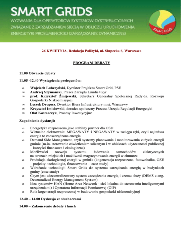 26 KWIETNIA, Redakcja Polityki, ul. Słupecka 6, Warszawa PROGRAM DEBATY 11.00 Otwarcie debaty 11.05 -12.40 Wystąpienia prelegentów: • • • • • • Wojciech Lubczyński, Dyrektor Projektu Smart Grid, PSE Andrzej Szymański, Prezes Zarządu Landis+Gyr prof. Krzysztof Żmijewski, Sekretarz Generalny Społecznej Rady ds. Rozwoju Gospodarki Niskoemisyjnej Leszek Drogosz, Dyrektor Biura Infrastruktury m.st. Warszawy Krzysztof Imiełowski, doradca społeczny Prezesa Urzędu Regulacji Energetyki Olaf Kostarczyk, Procesy Inwestycyjne Zagadnienia dyskusji: • • • • • • • • • Energetyka rozproszona jako stabilny partner dla OSD Wirtualne elektrownie: MEGAWATY i NEGAWATY w zasięgu ręki, czyli najtańsza energia to zaoszczędzona energia Demand Side Management, czyli systemy planowania i monitorowania zużycia energii gminie (m.in. sterowanie oświetleniem ulicznym i w obiektach użyteczności publicznej – korzyści finansowe i ekologiczne) Możliwości rozwoju systemu ładowania samochodów elektrycznych na terenach miejskich i możliwość magazynowania energii w chmurze Produkcja ekologicznej energii w gminie (kogeneracja rozproszona, fotowoltaika, OZE – projekty, technologie, finansowanie – case study) Wdrażanie technologii Smart Grids do systemu zarządzania energią w budynkach gminy (case study) Czym jest zdecentralizowany system zarządzania energią i czemu służy (DEMS z ang. Decentralized Energy Management System) Idea systemów HAN (Home Area Network - sieć lokalna do sterowania inteligentnymi urządzeniami) i Operatora Informacji Pomiarowej (OIP) Rola kogeneracji rozproszonej w budowaniu gospodarki niskoemisyjnej 12.40 – 14.00 Dyskusja ze słuchaczami 14.00 – Zakończenie debaty i lunch Organizator Debaty: Patronat i nadzór merytoryczny: Patroni: Informacji o Debacie udziela Beata Czarkowska, Procesy Inwestycyjne Sp. z o.o., tel. 722102300, email: [email protected] Debata jest dofinansowana ze środków Narodowego Funduszu Ochrony Środowiska i Gospodarki Wodnej