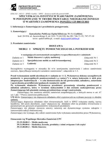 EDZ.242 –102/11 - SPSK 4 Lublin – SIWZ – dostawa mebli dla potrzeb SOR SPECYFIKACJA ISTOTNYCH WARUNKÓW ZAMÓWIENIA W POSTĘPOWANIU W TRYBIE PRZETARGU NIEOGRANICZONEGO O WARTOŚCI ZAMÓWIENIA PONIśEJ 125 000 EURO I. Informacja o Zamawiającym i przedmiocie postępowania. 1. Zamawiający: Samodzielny Publiczny Szpital Kliniczny Nr 4 w Lublinie, kod: 20-954, ul. Jaczewskiego 8, tel. 0-81 72-44-520, fax 081 746-71-55, 747-57-10 www: spsk4.lublin.pl, e-mail: [email protected] 2. Przedmiot zamówienia: DOSTAWA MEBLI I SPRZĘTU POMOCNICZEGO DLA POTRZEB SOR w następujących asortymentach szczegółowo wyspecyfikowanych w zadaniach: Zadanie nr 1 Zadanie nr 2 Zadanie nr 3 Meble biurowe i z płyty meblowej Specjalistyczne meble ze stali kwasoodpornej Lodówki Załącznik Nr 1 Załącznik Nr 2 Załącznik Nr 3 Szczegółowe wymagania w stosunku do w/w asortymentu zamówienia i zakres zamówienia zawiera „Specyfikacja istotnych warunków zamówienia”, załącznik nr 1-3. Przed wykonaniem mebli określonych w zadaniu nr 1 i 2, Wykonawca dokona szczegółowych pomiarów w poszczególnych pomieszczeniach („z natury”) w miarę kończenia w nich prac adaptacyjno- budowlanych - w celu dostosowania do ich powierzchni, zabudowy, ustawienia i sprawdzenia prawidłowości podanych rozmiarów mebli Po wykonaniu obmiarów Wykonawca przedstawi prezentację wizualną pomieszczeń z układem zabudowy, który w terminie maksymalnie 2 dni zostanie zaakceptowany przez Zamawiającego lub pisemnie zostaną przedstawione uwagi i zastrzeŜenia. Zamawiający nie zamierza udzielić zamówień uzupełniających, o których mowa w art. 67 ust.1 pkt. 7 Prawa zamówień publicznych. UWAGA: Zamawiający nie dopuszcza składania ofert częściowych na wybrane pozycje w obrębie zadania. Zamawiający dopuszcza składanie ofert równowaŜnych. Jeśli w SIWZ wskazano markę, nazwę handlową lub uŜyto określenia „typu” dopuszcza się składanie ofert na produkty równowaŜne o parametrach nie gorszych od parametrów wskazanych produktów. Zamawiający nie planuje zawarcia umowy ramowej ani dynamicznego systemu zakupów i zastosowania aukcji elektronicznej. Zamawiający nie wymaga, aby całość zamówienia była wykonana samodzielnie przez Wykonawcę. Oznaczenie wg Wspólnego Słownika Zamówień CPV 33.19.20.00-2 – Meble medyczne 39.11.00.00-6 – Siedziska, krzesła, produkty z nimi związane i ich części 39.13.00.00-2 – Meble biurowe Strona 1 z 44 EDZ.242 –102/11 - SPSK 4 Lublin – SIWZ – dostawa mebli dla potrzeb SOR II. Wymagany termin realizacji umowy Dla zadania nr 1: • Dostawa zestawów mebli – nie później niŜ w ciągu 30 dni od daty podpisania umowy, z zastrzeŜeniem zestawów VII, VIII, IX, X (dotyczącego tylko składzika porządkowego nr 166,156, 138, magazynu medycznego nr 137), XI których dostawa planowana jest na I kwartał 2012r Dla zadania nr 2: • Dostawa zestawów mebli ze stali kwasoodpornej – nie później niŜ w ciągu 30 dni od daty podpisania umowy, z zastrzeŜeniem zestawu XVI, którego dostawa planowana jest na I kwartał 2012r Dla zadania nr 3: • Dostawa lodówek – nie później niŜ w ciągu 30 dni od daty podpisania umowy z zastrzeŜeniem jednej lodówki dostosowanej do zabudowy gabinetów do zestawu IX, ( dotyczącego pokoju socjalnego Nr 153), którego dostawa planowana jest na I kwartał 2012r. (montaŜ/ uruchomienie lodówek musi współgrać z montaŜem mebli oraz uwzględnieniem ich w procesie pomiarów i wizualizacji) III. Opis warunków udziału w postępowaniu oraz oceny spełnienia tych warunków A) O udzielenie zamówienia mogą ubiegać się Wykonawcy, którzy nie podlegają wykluczeniu z postępowania zgodnie z art. 24 pzp oraz spełniają warunki dotyczące: a) posiadania uprawnień do wykonywania określonej działalności lub czynności, jeŜeli przepisy prawa nakładają obowiązek ich posiadania – w niniejszym postępowaniu nie zachodzi taka okoliczność; b) posiadania wiedzy i doświadczenia – Zamawiający uzna spełnienie warunku udziału w postępowaniu, jeśli wykonawca wykonał w okresie ostatnich trzech lat przed upływem terminu składania ofert, a jeŜeli okres prowadzenia działalności jest krótszy – w tym okresie - co najmniej jedno zamówienie, którego przedmiotem była dostawa: - mebli wykonanych z płyty meblowej o wartości nie mniejszej niŜ 192 000,00 PLN w przypadku składania oferty na zadanie nr 1; - mebli wykonanych ze stali kwasoodpornej lub wyposaŜenia pomieszczeń o wartości nie mniejszej niŜ 140 000,00 PLN w przypadku składania oferty na zadanie nr 2; - lodówek i/lub innych artykułów gospodarstwa domowego o wartości nie mniejszej 4 100,00 PLN w przypadku składania oferty na zadanie nr 3. c) dysponowania odpowiednim potencjałem technicznym oraz zasobami zdolnymi do wykonania zamówienia –Zamawiający nie stawia szczegółowego warunku; d) sytuacji ekonomicznej i finansowej – przez co rozumie się, iŜ posiadają środki finansowe w banku lub kasie oszczędnościowo – kredytowej, w którym wykonawca posiada rachunek, lub zdolność kredytową na łączną kwotę odpowiadającą co najmniej sumie wartości z poniŜszej tabeli dla zadań, w których Wykonawca przystępuje do postępowania: zad. nr 1 – 219 000,00 zł zad. nr 2 – 160 000,00 zł zad. nr 3 – 4 700,00 zł Strona 2 z 44 EDZ.242 –102/11 - SPSK 4 Lublin – SIWZ – dostawa mebli dla potrzeb SOR W przypadku składania ofert wspólnych warunki określone w ppkt A) mogą być spełnione łącznie przez Wykonawców wspólnie składających ofertę lub tylko przez jednego z Wykonawców. B) Wykaz oświadczeń, dokumentów/wykazów, jakie mają dostarczyć Wykonawcy w celu potwierdzenia spełniania warunków udziału w postępowaniu. 1. Oświadczenie Wykonawcy o spełnianiu warunków udziału w postępowaniu, o których mowa w art. 22 ust. 1 ustawy Pzp 2. Wykaz wykonanych dostaw w zakresie niezbędnym do wykazania spełnienia warunku