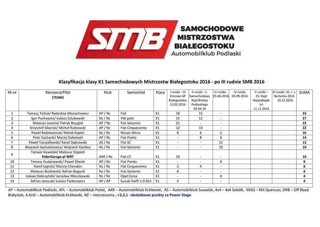 Klasyfikacja klasy K1 Samochodowych Mistrzostw Białegostoku