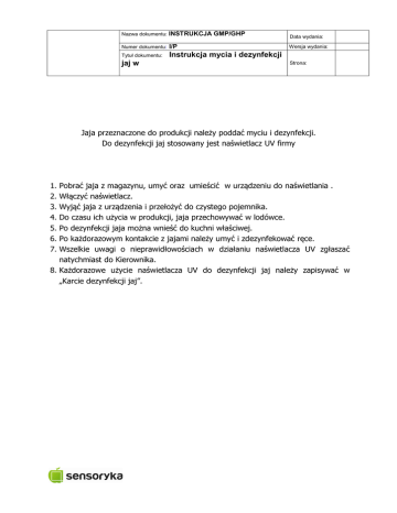 Nazwa dokumentu: INSTRUKCJA GMP/GHP Numer dokumentu: I/P Tytuł dokumentu: Instrukcja mycia i dezynfekcji jaj w Data wydania: Wersja wydania: Strona: Jaja przeznaczone do produkcji należy poddać myciu i dezynfekcji. Do dezynfekcji jaj stosowany jest naświetlacz UV firmy 1. Pobrać jaja z magazynu, umyć oraz umieścić w urządzeniu do naświetlania . 2. Włączyć naświetlacz. 3. Wyjąć jaja z urządzenia i przełożyć do czystego pojemnika. 4. Do czasu ich użycia w produkcji, jaja przechowywać w lodówce. 5. Po dezynfekcji jaja można wnieść do kuchni właściwej. 6. Po każdorazowym kontakcie z jajami należy umyć i zdezynfekować ręce. 7. Wszelkie uwagi o nieprawidłowościach w działaniu naświetlacza UV zgłaszać natychmiast do Kierownika. 8. Każdorazowe użycie naświetlacza UV do dezynfekcji jaj należy zapisywać w „Karcie dezynfekcji jaj”.