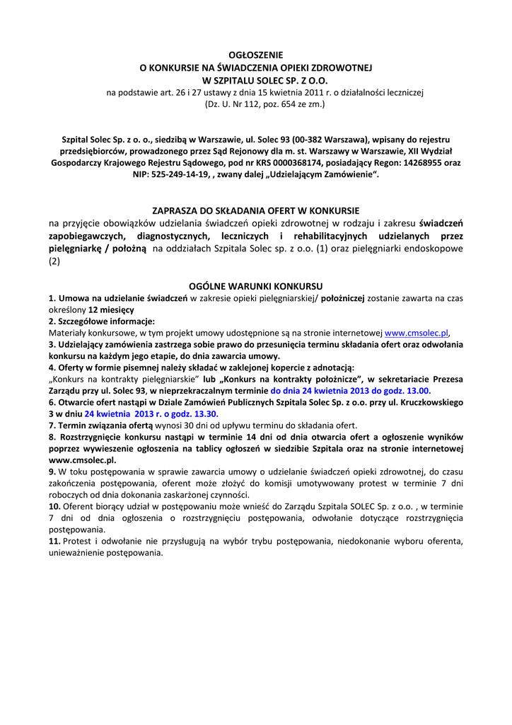 OGŁOSZENIE O KONKURSIE NA ŚWIADCZENIA OPIEKI ZDROWOTNEJ W SZPITALU SOLEC SP. Z O.O. na podstawie art. 26 i 27 ustawy z dnia 15 kwietnia 2011 r. o działalności leczniczej (Dz. U. Nr 112, poz. 654 ze zm.) Szpital Solec Sp. z o. o., siedzibą w Warszawie, ul. Solec 93 (00-382 Warszawa), wpisany do rejestru przedsiębiorców, prowadzonego przez Sąd Rejonowy dla m. st. Warszawy w Warszawie, XII Wydział Gospodarczy Krajowego Rejestru Sądowego, pod nr KRS 0000368174, posiadający Regon: 14268955 oraz NIP: 525-249-14-19, , zwany dalej „Udzielającym Zamówienie“. ZAPRASZA DO SKŁADANIA OFERT W KONKURSIE na przyjęcie obowiązków udzielania świadczeń opieki zdrowotnej w rodzaju i zakresu świadczeń zapobiegawczych, diagnostycznych, leczniczych i rehabilitacyjnych udzielanych przez pielęgniarkę / położną na oddziałach Szpitala Solec sp. z o.o. (1) oraz pielęgniarki endoskopowe (2) OGÓLNE WARUNKI KONKURSU 1. Umowa na udzielanie świadczeń w zakresie opieki pielęgniarskiej/ położniczej zostanie zawarta na czas określony 12 miesięcy 2. Szczegółowe informacje: Materiały konkursowe, w tym projekt umowy udostępnione są na stronie internetowej www.cmsolec.pl, 3. Udzielający zamówienia zastrzega sobie prawo do przesunięcia terminu składania ofert oraz odwołania konkursu na każdym jego etapie, do dnia zawarcia umowy. 4. Oferty w formie pisemnej należy składać w zaklejonej kopercie z adnotacją: „Konkurs na kontrakty pielęgniarskie” lub „Konkurs na kontrakty położnicze”, w sekretariacie Prezesa Zarządu przy ul. Solec 93, w nieprzekraczalnym terminie do dnia 24 kwietnia 2013 do godz. 13.00. 6. Otwarcie ofert nastąpi w Dziale Zamówień Publicznych Szpitala Solec Sp. z o.o. przy ul. Kruczkowskiego 3 w dniu 24 kwietnia 2013 r. o godz. 13.30. 7. Termin związania ofertą wynosi 30 dni od upływu terminu do składania ofert. 8. Rozstrzygnięcie konkursu nastąpi w terminie 14 dni od dnia otwarcia ofert a ogłoszenie wyników poprzez wywieszenie ogłoszenia na tablicy ogłoszeń w siedzibie Szpitala oraz na stronie internetowej www.cmsolec.pl. 9. W toku postępowania w sprawie zawarcia umowy o udzielanie świadczeń opieki zdrowotnej, do czasu zakończenia postępowania, oferent może złożyć do komisji umotywowany protest w terminie 7 dni roboczych od dnia dokonania zaskarżonej czynności. 10. Oferent biorący udział w postępowaniu może wnieść do Zarządu Szpitala SOLEC Sp. z o.o. , w terminie 7 dni od dnia ogłoszenia o rozstrzygnięciu postępowania, odwołanie dotyczące rozstrzygnięcia postępowania. 11. Protest i odwołanie nie przysługują na wybór trybu postępowania, niedokonanie wyboru oferenta, unieważnienie postępowania. WARUNKI KONKURSU OFERT I. UDZIELAJĄCY ZAMÓWIENIA Szpital Solec Sp. z o.o. ul. Solec 93 00-382 Warszawa www.cmsolec.pl e-mail: [email protected] tel./fax (22) 696 20 04 REGON: 14268955 NIP: 525-24-91-419 Godziny pracy Udzielającego Zamówienie: od poniedziałku do piątku w godzinach od 8.00 do 15.30. II. PRZEDMIOT KONKURSU Przyjęcie obowiązków wykonywania pielęgniarskich oraz położniczych i endoskopowych świadczeń opieki zdrowotnej nad pacjentami w imieniu Szpitala SOLEC Sp. z o.o. na zasadach określonych w Umowie - Kontrakcie, zgodnie z załączonym wzorem (Załącznik Nr 3). Świadczenia udzielane będą w zależności od potrzeb Szpitala SOLEC Sp. z o.o. w terminach ustalonych ze zleceniodawcą w dni powszednie oraz w soboty, niedziele i inne dni ustawowo wolne od pracy w systemie dyżurów 12 godzinnych dziennych od godz.7°° - 19°° oraz dyżurów nocnych 19°° - 7°° bądź też w innych systemie uzgodnionym wspólnie przez strony. III. PRZYJMUJĄCY ZAMÓWIENIE (Oferent) Do konkursu mogą przystąpić podmioty wykonujące działalność leczniczą: 1. podmioty lecznicze, które zgodnie z wpisem do rejestru są uprawnione do udzielania świadczeń w zakresie podstawowej opieki zdrowotnej, 2. wykonujące zawód w ramach działalności leczniczej, wykonywanej w formie: jednoosobowej działalności gospodarczej jako indywidualna praktyka pielęgniarki/ położnej, , indywidualna praktyka pielęgniarki / położnej wyłącznie w Spółce SOLEC lub indywidualna specjalistyczna praktyka pielęgniarki/ położnej wyłącznie w Spółce SOLEC, spółki cywilnej, spółki jawnej albo spółki partnerskiej, zwanymi dalej „praktykami zawodowymi”, zgodnie z art. 26 ust. 1 ustawy z dnia 15 kwietnia 2011 r. o działalności leczniczej (Dz. U. Nr 112, poz. 654 ze zm.), zwani dalej Oferentem. W przypadku praktyk zawodowych wykonywanych przez osoby pozostające w stosunku pracy ze SZPITALEM SOLEC SP. Z O.O. na stanowisku pielęgniarki, położnej zawarcie umowy – kontraktu dopuszczalne jest jedynie pod warunkiem złożenia oświadczenia o propozycji rozwiązania umowy o pracę za porozumieniem stron. Kwalifikacje wymagane – zgodne z obowiązującymi regulacjami prawnymi: 1. Ustawa z dnia 15 lipca 2011 r. o zawodach pielęgniarki i położnej Dz.U. 11.174.1039 ze zm. 2. Obwieszczenie Ministra Zdrowia z dnia 22 grudnia 2011 r. w sprawie wykazu dyplomów, świadectw i innych dokumentów potwierdzających posiadanie formalnych kwalifikacji do 2 wykonywania zawodu pielęgniarki, położnej przez obywateli państw członkowskich Unii Europejskiej, państw członkowskich Europejskiego Porozumienia o Wolnym Handlu (EFTA) - stron umowy o Europejskim Obszarze Gospodarczym i Konfederacji SzwajcarskiejM.P.2012 nr 0 poz. 15 3. W przypadku składania oferty na pielęgniarkę endoskopową należy ponadto przedłożyć: dokument o ukończonym kursie z zakresu endoskopii oraz oświadczenie o posiadaniu co najmniej 3 letniego doświadczenia Oferent musi zobowiązać się do poddania się kontroli przeprowadzonej przez Szpital SOLEC Sp. z o.o. oraz Narodowy Fundusz Zdrowia w zakresie świadczonych usług, w ramach zawartej umowy. Oferent musi zobowiązać się do spełnienia innych wymagań NFZ, których konieczności wprow