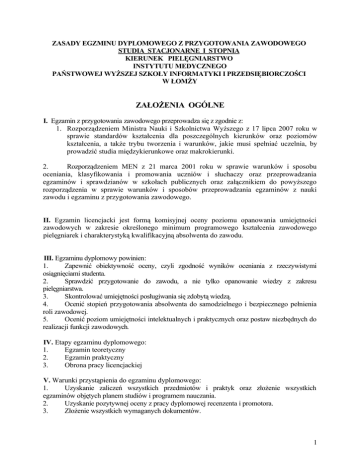 ZASADY EGZMINU DYPLOMOWEGO Z PRZYGOTOWANIA ZAWODOWEGO STUDIA STACJONARNE I STOPNIA KIERUNEK PIELĘGNIARSTWO INSTYTUTU MEDYCZNEGO PAŃSTWOWEJ WYŻSZEJ SZKOŁY INFORMATYKI I PRZEDSIĘBIORCZOŚCI W ŁOMŻY ZAŁOŻENIA OGÓLNE I. Egzamin z przygotowania zawodowego przeprowadza się z zgodnie z: 1. Rozporządzeniem Ministra Nauki i Szkolnictwa Wyższego z 17 lipca 2007 roku w sprawie standardów kształcenia dla poszczególnych kierunków oraz poziomów kształcenia, a także trybu tworzenia i warunków, jakie musi spełniać uczelnia, by prowadzić studia międzykierunkowe oraz makrokierunki. 2. Rozporządzeniem MEN z 21 marca 2001 roku w sprawie warunków i sposobu oceniania, klasyfikowania i promowania uczniów i słuchaczy oraz przeprowadzania egzaminów i sprawdzianów w szkołach publicznych oraz załącznikiem do powyższego rozporządzenia w sprawie warunków i sposobów przeprowadzania egzaminów z nauki zawodu i egzaminu z przygotowania zawodowego. II. Egzamin licencjacki jest formą komisyjnej oceny poziomu opanowania umiejętności zawodowych w zakresie określonego minimum programowego kształcenia zawodowego pielęgniarek i charakterystyką kwalifikacyjną absolwenta do zawodu. III. Egzaminu dyplomowy powinien: 1. Zapewnić obiektywność oceny, czyli zgodność wyników oceniania z rzeczywistymi osiągnięciami studenta. 2. Sprawdzić przygotowanie do zawodu, a nie tylko opanowanie wiedzy z zakresu pielęgniarstwa. 3. Skontrolować umiejętności posługiwania się zdobytą wiedzą. 4. Ocenić stopień przygotowania absolwenta do samodzielnego i bezpiecznego pełnienia roli zawodowej. 5. Ocenić poziom umiejętności intelektualnych i praktycznych oraz postaw niezbędnych do realizacji funkcji zawodowych. IV. Etapy egzaminu dyplomowego: 1. Egzamin teoretyczny 2. Egzamin praktyczny 3. Obrona pracy licencjackiej V. Warunki przystąpienia do egzaminu dyplomowego: 1. Uzyskanie zaliczeń wszystkich przedmiotów i praktyk oraz złożenie wszystkich egzaminów objętych planem studiów i programem nauczania. 2. Uzyskanie pozytywnej oceny z pracy dyplomowej recenzenta i promotora. 3. Złożenie wszystkich wymaganych dokumentów. 1 VI. Warunkiem przystąpienia do egzaminu praktycznego jest zdanie egzaminu teoretycznego. VII. Warunkiem przystąpienia do obrony pracy licencjackiej jest zdanie egzaminu teoretycznego i praktycznego. VIII. Za organizację i przebieg egzaminu dyplomowego odpowiedzialny jest Dyrektor Instytutu Medycznego PWSIiP w Łomży lub wyznaczony przez niego Zastępca, który: 1. Przedstawia studentom wykaz promotorów prac licencjackich. 2. Powołuje komisje egzaminacyjne. 3. Zatwierdza wykaz jednostek opieki zdrowotnej do przeprowadzania egzaminu praktycznego. 4. Ustala harmonogram przebiegu egzamin. IX. W przypadku uzyskania z egzaminu licencjackiego oceny niedostatecznej lub nieusprawiedliwionego nieprzystąpienia do tego egzaminu w terminie ustalonym przez Dyrektora lub wyznaczonego przez niego Zastępcę Instytutu Medycznego PWSIiP w Łomży, wyznacza drugi termin egzaminu, jako ostateczny. ORGANIZACJA I PRZEBIEG EGZAMINU TEORETYCZNEGO I. Część teoretyczna egzaminu dyplomowego poprzedza część praktyczną egzaminu i obronę pracy dyplomowej. II. Część teoretyczna egzaminu dyplomowego polega na udzieleniu przez studenta odpowiedzi na 30 pytań testowych obejmujących treści nauczania w zakresie podstaw pielęgniarstwa oraz pielęgniarstw: internistycznego, chirurgicznego, pediatrycznego. III.Student za każde pytanie może otrzymać 1 punkt, maksymalnie 30 pkt. z całego testu. IV. Do zaliczenia testu wymagane jest uzyskanie co najmniej 17 punktów. ORGANIZACJA I PRZEBIEG EGZAMINU PRAKTYCZNEGO I. Egzamin przeprowadzają komisje, powołane przez Dyrektora lub wyznaczonego przez niego Zastępcę Dyrektora Instytutu Medycznego PWSIiP w Łomży, składające się z 1. przewodniczącego 2. członków komisji – na każdym wytypowanym oddziale, z co najmniej trzech nauczycieli akademickich prowadzących zajęcia ze studentami na studiach licencjackich kierunek pielęgniarstwo, posiadających kierunkowe wykształcenie zawodowe i stopień naukowy co najmniej magister. II. W pracach komisji egzaminacyjnej, w charakterze obserwatora, mogą brać udział przedstawiciele Samorządu Pielęgniarek i Położnych, Polskiego Towarzystwa Pielęgniarskiego oraz opiekun roku. III. W skład komisji mogą wchodzić przedstawiciele zakładu opieki zdrowotnej, w którym odbywa się egzamin dyplomowy – pielęgniarki oddziałowe, naczelne. 2 IV. W części praktycznej egzaminu może pracować równolegle kilka komisji oceniających. V. Przewodniczącego komisji oraz jej członków powołuje Dyrektor lub wyznaczony przez niego Zastępca. VI. Przewodniczący komisji: Zatwierdza zadania egzaminacyjne do części praktycznej i teoretycznej. Czuwa nad prawidłowym przebiegiem egzaminu. Rozstrzyga kwestie sporne powstałe w czasie egzaminu. Ogłasza wyniki egzaminu. VII. Egzaminatorzy: Przygotowują zadania egzaminacyjne do części praktycznej i teoretycznej. Oceniają wykonywanie zadań egzaminacyjnych oraz zasób wiadomości i umiejętności zdającego posługując się ustalonymi kryteriami oceniania zatwierdzonymi przez Senat PWSIP w Łomży. VIII. Na 2-3 dni przed planowanym egzaminem praktycznym odbywa się losowanie miejsca przeprowadzenia egzaminu. 1. Miejscem egzaminu są oddziały wewnętrzne, chirurgiczne i pediatryczne. 2. Kartki do losowania oddziału przygotowuje i przechowuje przewodniczący komisji egzaminacyjnej. 3. Na kartce do losowania znajdują się informacje, w jakim oddziale losujący będzie zdawał egzamin, data egzaminu, godzina rozpoczęcia i zakończenia egzaminu. 4. Kartki są oznakowane pieczątką Instytutu Medycznego PWSIP w Łomży. 5. Liczba kartek musi odpowiadać liczbie zdających. 6. Kartki do dnia losowania przechowywane są w sejfie. IX. W części praktycznej egzaminu, w jednym oddziale nie może zdawać równocześnie więcej niż 8 studentó