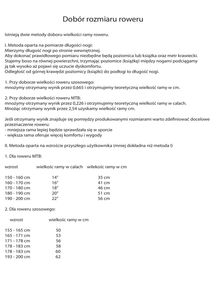 Dobór rozmiaru roweru Istnieją dwie metody doboru wielkości ramy roweru. I. Metoda oparta na pomiarze długości nogi: Mierzymy długość nogi po stronie wewnętrznej. Aby dokonać prawidłowego pomiaru niezbędne będą poziomica lub książka oraz metr krawiecki. Stajemy boso na równej powierzchni, trzymając poziomice (książkę) między nogami podciągamy ją tak wysoko aż pojawi się uczucie dyskomfortu. Odległość od górnej krawędzi poziomicy (książki) do podłogi to długość nogi. 1. Przy doborze wielkości roweru szosowego: mnożymy otrzymany wynik przez 0,665 i otrzymujemy teoretyczną wielkość ramy w cm. 2. Przy doborze wielkości roweru MTB: mnożymy otrzymany wynik przez 0,226 i otrzymujemy teoretyczną wielkość ramy w calach. Mnożąc otrzymany wynik przez 2,54 uzyskamy wielkość ramy cm. Jeśli otrzymany wynik znajduje się pomiędzy produkowanymi rozmiarami warto zdefiniować docelowe przeznaczenie roweru: - mniejsza rama lepiej będzie sprawdzała się w sporcie - większa rama oferuje więcej komfortu i wygody II. Metoda oparta na wzroście przyszłego użytkownika (mniej dokładna niż metoda I) 1. Dla roweru MTB: wzrost 150 - 160 cm 160 - 170 cm 170 - 180 cm 180 - 190 cm 190 - 200 cm wielkośc ramy w calach wilekośc ramy w cm 14" 16" 18" 20" 22" 2. Dla roweru szosowego: wzrost 155 - 165 cm 165 - 171 cm 171 - 178 cm 178 - 183 cm 178 - 183 cm 193 - 200 cm wielkośc ramy w cm 50 53 56 58 60 62 35 cm 41 cm 46 cm 51 cm 56 cm