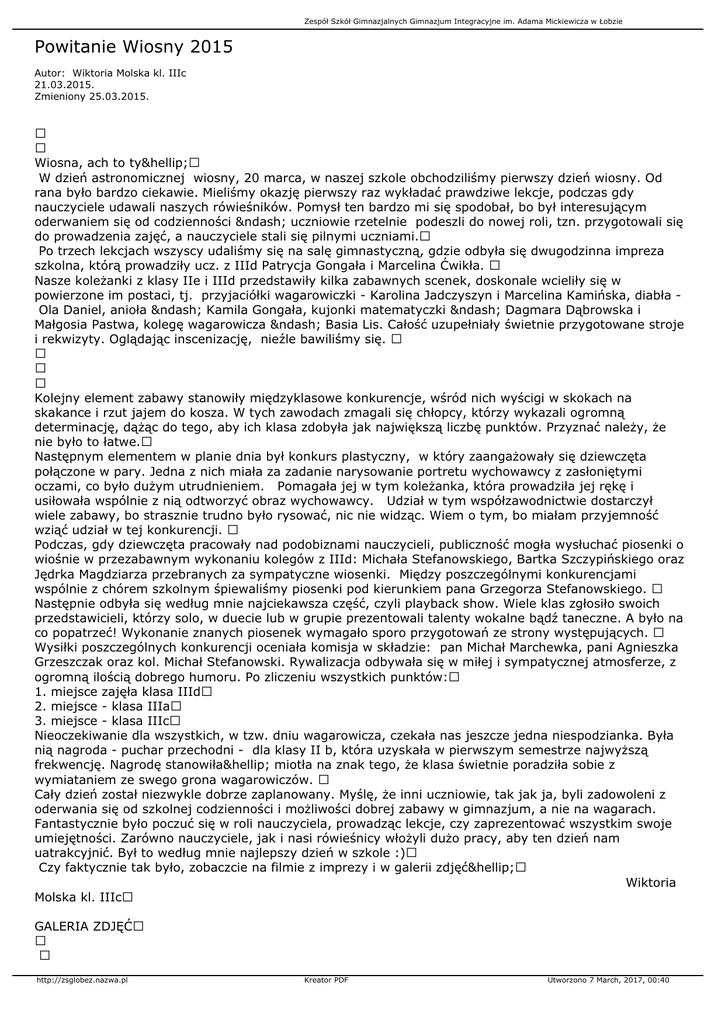 Zespół Szkół Gimnazjalnych Gimnazjum Integracyjne im. Adama Mickiewicza w Łobzie Powitanie Wiosny 2015 Autor: Wiktoria Molska kl. IIIc 21.03.2015. Zmieniony 25.03.2015. Wiosna, ach to ty… W dzień astronomicznej wiosny, 20 marca, w naszej szkole obchodziliśmy pierwszy dzień wiosny. Od rana było bardzo ciekawie. Mieliśmy okazję pierwszy raz wykładać prawdziwe lekcje, podczas gdy nauczyciele udawali naszych rówieśników. Pomysł ten bardzo mi się spodobał, bo był interesującym oderwaniem się od codzienności – uczniowie rzetelnie podeszli do nowej roli, tzn. przygotowali się do prowadzenia zajęć, a nauczyciele stali się pilnymi uczniami. Po trzech lekcjach wszyscy udaliśmy się na salę gimnastyczną, gdzie odbyła się dwugodzinna impreza szkolna, którą prowadziły ucz. z IIId Patrycja Gongała i Marcelina Ćwikła. Nasze koleżanki z klasy IIe i IIId przedstawiły kilka zabawnych scenek, doskonale wcieliły się w powierzone im postaci, tj. przyjaciółki wagarowiczki - Karolina Jadczyszyn i Marcelina Kamińska, diabła Ola Daniel, anioła – Kamila Gongała, kujonki matematyczki – Dagmara Dąbrowska i Małgosia Pastwa, kolegę wagarowicza – Basia Lis. Całość uzupełniały świetnie przygotowane stroje i rekwizyty. Oglądając inscenizację, nieźle bawiliśmy się. Kolejny element zabawy stanowiły międzyklasowe konkurencje, wśród nich wyścigi w skokach na skakance i rzut jajem do kosza. W tych zawodach zmagali się chłopcy, którzy wykazali ogromną determinację, dążąc do tego, aby ich klasa zdobyła jak największą liczbę punktów. Przyznać należy, że nie było to łatwe. Następnym elementem w planie dnia był konkurs plastyczny, w który zaangażowały się dziewczęta połączone w pary. Jedna z nich miała za zadanie narysowanie portretu wychowawcy z zasłoniętymi oczami, co było dużym utrudnieniem. Pomagała jej w tym koleżanka, która prowadziła jej rękę i usiłowała wspólnie z nią odtworzyć obraz wychowawcy. Udział w tym współzawodnictwie dostarczył wiele zabawy, bo strasznie trudno było rysować, nic nie widząc. Wiem o tym, bo miałam przyjemność wziąć udział w tej konkurencji. Podczas, gdy dziewczęta pracowały nad podobiznami nauczycieli, publiczność mogła wysłuchać piosenki o wiośnie w przezabawnym wykonaniu kolegów z IIId: Michała Stefanowskiego, Bartka Szczypińskiego oraz Jędrka Magdziarza przebranych za sympatyczne wiosenki. Między poszczególnymi konkurencjami wspólnie z chórem szkolnym śpiewaliśmy piosenki pod kierunkiem pana Grzegorza Stefanowskiego. Następnie odbyła się według mnie najciekawsza część, czyli playback show. Wiele klas zgłosiło swoich przedstawicieli, którzy solo, w duecie lub w grupie prezentowali talenty wokalne bądź taneczne. A było na co popatrzeć! Wykonanie znanych piosenek wymagało sporo przygotowań ze strony występujących. Wysiłki poszczególnych konkurencji oceniała komisja w składzie: pan Michał Marchewka, pani Agnieszka Grzeszczak oraz kol. Michał Stefanowski. Rywalizacja odbywała się w miłej i sympatycznej atmosferze, z ogromną ilością dobrego humoru. Po zliczeniu wszystkich punktów: 1. miejsce zajęła klasa IIId 2. miejsce - klasa IIIa 3. miejsce - klasa IIIc Nieoczekiwanie dla wszystkich, w tzw. dniu wagarowicza, czekała nas jeszcze jedna niespodzianka. Była nią nagroda - puchar przechodni - dla klasy II b, która uzyskała w pierwszym semestrze najwyższą frekwencję. Nagrodę stanowiła… miotła na znak tego, że klasa świetnie poradziła sobie z wymiataniem ze swego grona wagarowiczów. Cały dzień został niezwykle dobrze zaplanowany. Myślę, że inni uczniowie, tak jak ja, byli zadowoleni z oderwania się od szkolnej codzienności i możliwości dobrej zabawy w gimnazjum, a nie na wagarach. Fantastycznie było poczuć się w roli nauczyciela, prowadząc lekcje, czy zaprezentować wszystkim swoje umiejętności. Zarówno nauczyciele, jak i nasi rówieśnicy włożyli dużo pracy, aby ten dzień nam uatrakcyjnić. Był to według mnie najlepszy dzień w szkole :) Czy faktycznie tak było, zobaczcie na filmie z imprezy i w galerii zdjęć… Wiktoria Molska kl. IIIc GALERIA ZDJĘĆ http://zsglobez.nazwa.pl Kreator PDF Utworzono 7 March, 2017, 00:40 Zespół Szkół Gimnazjalnych Gimnazjum Integracyjne im. Adama Mickiewicza w Łobzie http://zsglobez.nazwa.pl Kreator PDF Utworzono 7 March, 2017, 00:40