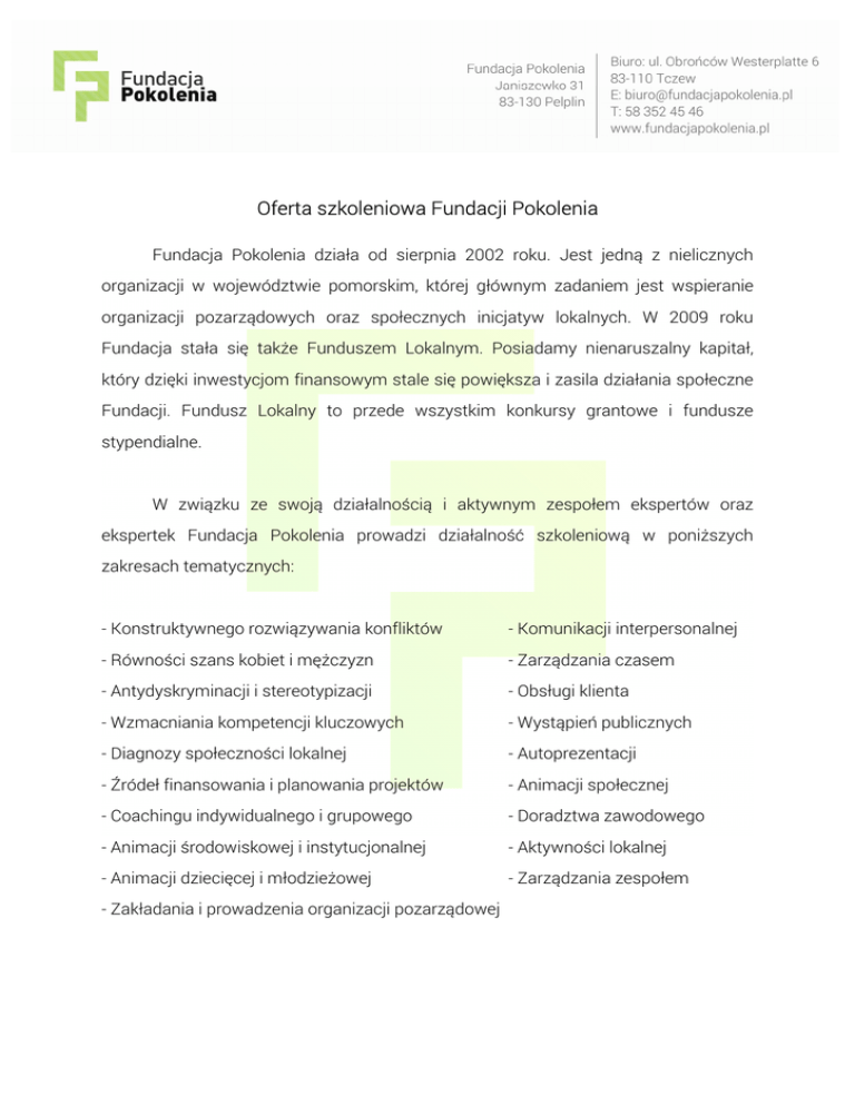Oferta szkoleniowa Fundacji Pokolenia Fundacja Pokolenia działa od sierpnia 2002 roku. Jest jedną z nielicznych organizacji w województwie pomorskim, której głównym zadaniem jest wspieranie organizacji pozarządowych oraz społecznych inicjatyw lokalnych. W 2009 roku Fundacja stała się także Funduszem Lokalnym. Posiadamy nienaruszalny kapitał, który dzięki inwestycjom finansowym stale się powiększa i zasila działania społeczne Fundacji. Fundusz Lokalny to przede wszystkim konkursy grantowe i fundusze stypendialne. W związku ze swoją działalnością i aktywnym zespołem ekspertów oraz ekspertek Fundacja Pokolenia prowadzi działalność szkoleniową w poniższych zakresach tematycznych: - Konstruktywnego rozwiązywania konfliktów - Komunikacji interpersonalnej - Równości szans kobiet i mężczyzn - Zarządzania czasem - Antydyskryminacji i stereotypizacji - Obsługi klienta - Wzmacniania kompetencji kluczowych - Wystąpień publicznych - Diagnozy społeczności lokalnej - Autoprezentacji - Źródeł finansowania i planowania projektów - Animacji społecznej - Coachingu indywidualnego i grupowego - Doradztwa zawodowego - Animacji środowiskowej i instytucjonalnej - Aktywności lokalnej - Animacji dziecięcej i młodzieżowej - Zarządzania zespołem - Zakładania i prowadzenia organizacji pozarządowej Prowadzimy również szkolenia dla wolontariuszy oraz organizacji i instytucji współpracujących, a także konsultacje dotyczące źródeł finansowania i mobilnych technologii. Kierujemy swoją ofertę również do szkół: oferujemy szkolenia z debat oksfordzkich, zakładanie szkolnych klubów debatanckich oraz szkolnych klubów wolontariackich. Oprócz w tego Fundacja Pokolenia dysponuje zasobami szkoleniowymi zakresach: współpracy z mediami, warsztatów z zakresu obróbki dźwięku, tworzenia materiałów audio i video, pisania artykułów, przygotowywania dziennikarskiego, promocji, marketingu i reklamy. Prowadzimy także Eurolekcje (zajęcia dla młodzieży i osób pracujących z młodzieżą, dotyczące takich tematów jak praca, studia, wolontariat za granicą oraz możliwości związane z członkostwem Polski w Unii Europejskiej). Z Fundacją Pokolenia współpracuje również doświadczona grupa animacyjna (szczudlarze, pokazy fireshow, modelowanie balonów, taniec, zabawy z chustą animacyjną, animacja dziecięca itp.), która działa na wielu imprezach plenerowych o różnym charakterze. Mamy również możliwość stworzenia plenerowej pracowni sztuki użytkowej (tworzenie przypinek, nadruków na torby płócienne i koszulki), jak również przygotowywania powyższych materiałów we własnym zakresie i przekazanie ich po wcześniejszym uzgodnieniu warunków. Ważną częścią działalności Fundacji są także warsztaty plastyczne (Street Art., działania w przestrzeni publicznej/miejskiej, tworzenie szablonów, wlepek itp.), które są praktyczną formą rozwinięcia zdolności artystycznych i poznania nowych form wyrazu. Zachęcamy do kontaktu w sprawie szczegółów! Z poważaniem Zespół Fundacji Pokolenia Fundacja Pokolenia (biuro) Ul. Kołłątaja 9, 83-110 Tczew Tel. 58 352 45 46 Adres e-mail: [email protected]
