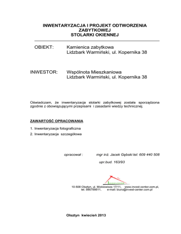 INWENTARYZACJA I PROJEKT ODTWORZENIA ZABYTKOWEJ STOLARKI OKIENNEJ OBIEKT: Kamienica zabytkowa Lidzbark Warmiński, ul. Kopernika 38 INWESTOR: Wspólnota Mieszkaniowa Lidzbark Warmiński, ul. Kopernika 38 Oświadczam, że inwentaryzacja stolarki zabytkowej została sporządzona zgodnie z obowiązującymi przepisami i zasadami wiedzy technicznej. ZAWARTOŚĆ OPRACOWANIA 1. Inwentaryzacja fotograficzna 2. Inwentaryzacja szczegółowa opracował : mgr inż. Jacek Gębski tel: 609 440 508 upr.bud. 163/93 Olsztyn kwiecień 2013 11-100 Lidzbark Warmiński, ul. Kopernika 38 1. Zakres opracowania Opracowanie obejmuje inwentaryzację istniejącej stolarki okiennej i drzwiowej w budynku przy ulicy Kopernika 38 oraz projekt odtworzenia stolarki. 2. Podstawa opracowania Zlecenie inwestora Pomiary istniejącej stolarki okiennej Dokumentacja fotograficzna stolarki 3. Stan istniejący W omawianej kamienicy w klatce schodowej pierwotnie zamontowano okna łukowe, z których część wymieniono na prostokątne. Obecnie zamontowane są okna skrzynkowe a także jednoramowe i nowoczesne wykonane z PCV różniące się wymiarem i podziałem w skrzydłach. W piwnicy zlokalizowano jeden typ okien prostokątnych jednoszybowych. Całość stolarki o konstrukcji drewnianej, okna otwierane do wewnątrz i do zewnątrz. Drzwi wejściowe do budynku jednoskrzydłowe w stanie umożliwiającym konserwację 4. Wymiana stolarki W ramach remontu przewiduje się wymianę stolarki na stolarkę drewnianą, skrzydła okienne– przeszklenie szybą zespoloną. Podział okien identyczny jak stolarka zabytkowa, okna otwierane do wewnątrz.. Nowoprojektowaną stolarkę wyposażoną w uszczelki należy zamontować przy użyciu kotew stalowych stosując odpowiedni rozstaw zgodny z normą i nie przekraczający 80cm. Ustawione okna i drzwi należy sprawdzić w poziomie i pionie. Przestrzeń między ścianami i ościeżnicami należy wypełnić pianką poliuretanową – zabezpieczając ościeżnice przed wypaczeniem. Parapety zewnętrzne należy wykonać zgodnie z projektem renowacji elewacji zachowując odpowiednie spadki. Po montażu okien i parapetów należy uzupełnić tynki wewnętrzne i zewnętrzne. Przed wykonaniem stolarki należy dokonać pomiarów każdego otworu i okiennego. Sporządził: Jacek Gębski INFORMACJA DOTYCZACA BEZPIECZEŃSTWA I OCHRONY ZDROWIA a. zakres robót i kolejność wykonywania – inwestycja obejmuje wymianę stolarki okiennej i drzwiowej w budynku mieszkalnym wielorodzinnym b. Inwestycja planowana jako jednoetapowa. c. kolejność robót –Po wykonaniu pomiarów i wykonaniu stolarki okiennej można przystąpić do wymiany okien i drzwi. Budowę należy rozpocząć od przygotowania placu budowy, wyznaczenia stref niebezpiecznych. Roboty należy rozpocząć od prac demontażowych usuwając jednocześnie zdemontowane elementy z budynku. Bezwzględnie nie wolno pozostawiać bez dozoru niezabezpieczonych otworów ze względu na możliwość pojawienia się mieszkańców kamienicy w pobliżu wykonywanych prac. d. wykaz istniejących obiektów budowlanych – roboty prowadzone w zamieszkałej kamienicy e. elementy zagospodarowania działki, które mogą stwarzać zagrożenie dla bezpieczeństwa i zdrowia ludzi – brak takich elementów i nie przewiduje się ich zlokalizowania f. przewidywane zagrożenia występujące podczas realizacji robót budowlanych – nie przewiduje się robót określonych w Rozporządzeniu DZU 03.120.1126.6, a co za tym idzie, nie przewiduje się zagrożeń. g. instruktaż pracowników – z powyższych informacji nie wynika konieczność szczególnego szkolenia pracowników h. zapobieganie niebezpieczeństwom – stopień skomplikowania obiektu, technologia budowy i materiały nie wymagają szczególnych warunków. Należy zapobiegać zagrożeniom przez stosowanie powszechnie obowiązujących norm i zasad BHP, instrukcji, poleceń kierownika budowy. Do budowy należy używać materiałów posiadających wymagane atesty. Drogą ewakuacyjną jest wyjazd własny na drogę miejską. informację sporządził mgr inż. Jacek Gębski