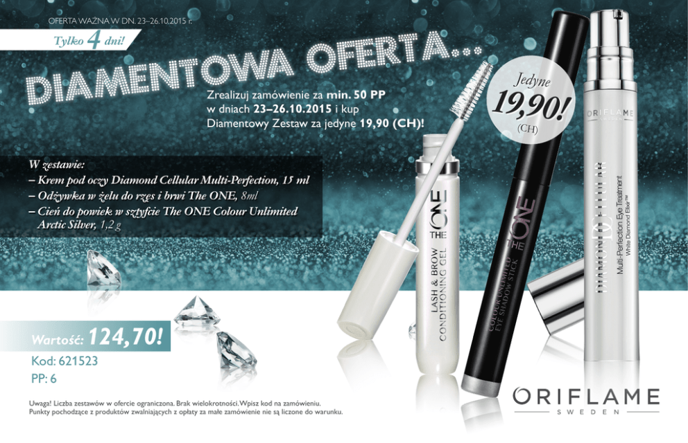 OFERTA WAŻNA W DN. 23–26.10.2015 r. 4 dni! . . . a t r e f o a w Jedyne o t n diame 19,90! Tylko Zrealizuj zamówienie za min. 50 PP w dniach 23–26.10.2015 i kup Diamentowy Zestaw za jedyne 19,90 (CH)! W zestawie: – Krem pod oczy Diamond Cellular Multi-Perfection, 15 ml – Odżywka w żelu do rzęs i brwi The ONE, 8ml – Cień do powiek w sztyfcie The ONE Colour Unlimited Arctic Silver, 1,2 g Wartość: 124,70! Kod: 621523 PP: 6 Uwaga! Liczba zestawów w ofercie ograniczona. Brak wielokrotności. Wpisz kod na zamówieniu. Punkty pochodzące z produktów zwalniających z opłaty za małe zamówienie nie są liczone do warunku. (CH)