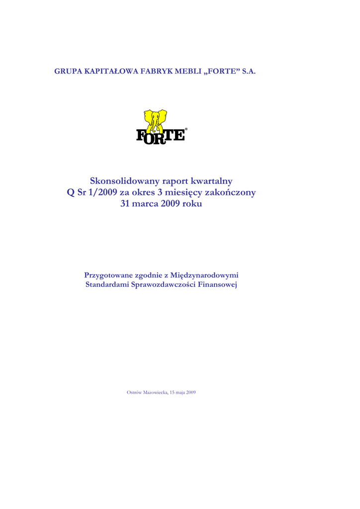 GRUPA KAPITAŁOWA FABRYK MEBLI „FORTE” S.A. Skonsolidowany raport kwartalny Q Sr 1/2009 za okres 3 miesięcy zakończony 31 marca 2009 roku Przygotowane zgodnie z Międzynarodowymi Standardami Sprawozdawczości Finansowej Ostrów Mazowiecka, 15 maja 2009 Grupa Kapitałowa Fabryk Mebli „Forte” S.A. Skonsolidowany raport kwartalny QS 1/2009 za okres 3 miesięcy zakończony 31 marca 2009 wraz z informacją dodatkową ( w tysiącach złotych) WYBRANE DANE FINANSOWE Dane dotyczące skróconego skonsolidowanego sprawozdania finansowego Przychody netto ze sprzedaŜy produktów, towarów, materiałów i usług Zysk (strata) z działalności operacyjnej Zysk (strata) brutto Zysk (strata) netto przypadający właścicielom jednostki dominującej Pełny dochód za okres Przepływy pienięŜne netto z działalności operacyjnej Przepływy pienięŜne netto z działalności inwestycyjnej Przepływy pienięŜne netto z działalności finansowej Zwiększenie netto stanu środków pienięŜnych i ich ekwiwalentów Liczba akcji (w szt.) Zysk (strata) na jedną akcję zwykłą (w zł/ EUR) Suma aktywów Zobowiązania razem Zobowiązania długoterminowe Zobowiązania krótkoterminowe Kapitał własny udziałowców jednostki dominującej Kapitał zakładowy Wartość księgowa na jedną akcję (w zł/EUR) PLN 1 kwartał 2009 roku EURO 1 kwartał 2008 roku 1 kwartał 2009 roku 1 kwartał 2008 roku 140 520 9 561 8 964 119 619 5 619 5 963 30 552 2 079 1 949 33 625 1 580 1 676 7 184 10 419 4 552 3 289 1 562 2 265 1 280 925 36 974 13 375 8 039 3 760 -2 295 1 459 -499 410 -34 505 -14 729 -7 502 -4 140 174 105 38 30 23 751 084 23 751 084 23 751 084 23 751 084 0,30 0,19 0,07 0,05 stan na stan na stan na stan na 2009-03-31 2008-12-31 2009-03-31 2008-12-31 429 537 445 864 91 366 106 860 159 137 65 152 93 985 185 873 88 608 97 265 33 850 13 858 19 991 44 548 21 237 23 312 267 612 23 751 257 227 23 751 56 923 5 052 61 650 5 692 11,27 10,83 2,40 2,60 Komisja Nadzoru Finansowego 2 Grupa Kapitałowa Fabryk Mebli „Forte” S.A. Skonsolidowany raport kwartalny QS 1/2009 za okres 3 miesięcy zakończony 31 marca 2009 wraz z informacją dodatkową ( w tysiącach złotych) WYBRANE DANE FINANSOWE Dane dotyczące skróconego sprawozdania finansowego Przychody netto ze sprzedaŜy produktów, towarów, materiałów i usług PLN 1 kwartał 2009 roku Zysk (strata) z działalności operacyjnej Zysk (strata) brutto Zysk (strata) netto Pełen dochód za okres Przepływy pienięŜne netto z działalności operacyjnej Przepływy pienięŜne netto z działalności inwestycyjnej Przepływy pienięŜne netto z działalności finansowej Zwiększenie netto stanu środków pienięŜnych i ich ekwiwalentów Liczba akcji (w szt.) Zadeklarowana lub wypłacona dywidenda na jedną akcję (w zł/EUR) Zysk (strata) na jedną akcję zwykłą (w zł/ EUR) Suma aktywów Zobowiązania razem Zobowiązania długoterminowe Zobowiązania krótkoterminowe Kapitał własny Kapitał zakładowy Wartość księgowa na jedną akcję (w zł/EUR) EURO 1 kwartał 2008 roku 1 kwartał 2009 roku 1 kwartał 2008 roku 130 695 107 573 28 416 30 239 9 236 10 032 8 611 8 611 2 482 4 727 4 059 4 059 2 008 2 181 1 872 1 872 698 1 329 1 141 1 141 29 615 12 736 6 439 3 580 1 889 2 084 411 586 -34 394 -14 264 -7 478 -4 010 -2 969 556 -646 156 23 751 084 23 751 084 23 751 084 23 751 084 0,00 0,00 0,00 0,00 0,36 0,17 0,08 0,05 stan na stan na stan na stan na 2009-03-31 2008-12-31 2009-03-31 2008-12-31 418 143 439 664 88 942 105 374 145 107 175 240 30 865 42 000 58 911 86 196 273 035 23 751 82 687 92 553 264 424 23 751 12 531 18 335 58 076 5 052 19 818 22 182 63 375 5 692 11,50 11,13 2,45 2,67 Poszczególne pozycje sprawozdań finansowych zostały przeliczone według kursów podanych w punkcie 9.16 Informacji dodatkowej do Skonsolidowanego raportu kwartalnego Q Sr 1/2009. Komisja Nadzoru Finansowego 3 Grupa Kapitałowa Fabryk Mebli „Forte” S.A. Skonsolidowany raport kwartalny QS 1/2009 za okres 3 miesięcy zakończony 31 marca 2009 wraz z informacją dodatkową ( w tysiącach złotych) SKONSOLIDOWANY RACHUNEK ZYSKÓW I STRAT za okres 3 miesięcy zakończony 31 marca 2009 Za okres 3 miesięcy zakończony 31 marca 2009 roku 2008 roku Działalność kontynuowana Przychody ze sprzedaŜy towarów, produktów i materiałów Przychody ze sprzedaŜy usług 139 634 886 118 843 776 Przychody ze sprzedaŜy 140 520 119 619 Koszt własny sprzedaŜy Zysk brutto ze sprzedaŜy 82 344 58 176 85 910 33 709 5 190 24 028 11 203 840 (17 734) 9 561 245 18 001 8 423 3 935 2 024 5 619 594 2 142 1 191 1 815 - 17 Zysk (strata) przed opodatkowaniem 8 964 5 963 Podatek dochodowy Zysk (strata) okresu 1 746 7 218 1 408 4 555 Przypadający\a Właścicielom jednostki dominującej 7 184 4 552 34 3 – podstawowy z zysku za okres obrotowy przypadającego właścicielom jednostki dominującej 0,30 0,19 – rozwodniony z zysku za okres obrotowy przypadającego właścicielom jednostki dominującej 0,30 0,19 Pozostałe przychody operacyjne Koszty sprzedaŜy Koszty ogólnego zarządu Pozostałe koszty operacyjne Zysk (strata) z pochodnych instrumentów finansowych Zysk (strata) z działalności operacyjnej Przychody finansowe Koszty finansowe Udział w zyskach jednostek rozliczanych MPW Udziałom mniejszościowym Zysk/(strata) na jedną akcję: Komisja Nadzoru Finansowego 4 Grupa Kapitałowa Fabryk Mebli „Forte” S.A. Skonsolidowany raport kwartalny QS 1/2009 za okres 3 miesięcy zakończony 31 marca 2009 wraz z informacją dodatkową ( w tysiącach złotych) SKONSOLIDOWANE SPRAWOZDANIE Z PEŁNEGO DOCHODU za okres 3 miesięcy zakończony 31 marca 2009 Za okres 3 miesięcy zakończony 31 marca 2009 roku Zysk (strata) okresu 2008 roku 7 218 4 555 3 201 (1 266) 3 201 (1 266) Pełny dochód za okres 10 419 3 289 Przypadający Właścicielom jednostki dominującej Udziałom mniejszościowym 10 386 33 3 287 2 Inne składniki pełnego dochodu RóŜnice kursowe z przeliczenia jednostek zagranicznych Pozostałe