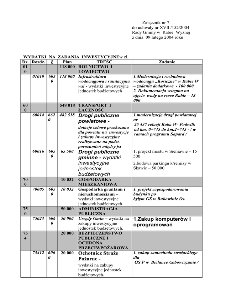 Załącznik nr 7 do uchwały nr XVII /152/2004 Rady Gminy w Rabie Wyżnej z dnia 09 lutego 2004 roku WYDATKI NA ZADANIA INWESTYCYJNEw zł. Dz. Rozdz. § Plan TREŚĆ 01 118 000 ROLNICTWO I 0 ŁOWIECTWO 01010 605 118 000 Infrastruktura 0 wodociągowa i sanitacyjna wsi - wydatki inwestycyjne jednostek budżetowych 60 0 Zadanie 1.Modernizcja i rozbudowa wodociągu „Kosiczne” w Rabie W – zadania dodatkowe - 100 000 2. Dokumentacja wstępna na ujęcie wody na rzece Rabie – 18 000 548 018 TRANSPORT I ŁĄCZNOŚĆ 60014 662 482 518 Drogi publiczne 0 powiatowe - 60016 605 0 65 500 1.modernizację drogi powiatowej nr 25 437 relacji Raba W- Podwilk dotacje celowe przekazana od km. 0+745 do km.2+745 - / w dla powiatu na inwestycje ramach programu Sapard / i zakupy inwestycyjne realizowane na podst. porozumień między jst 1. projekt mostu w Sieniawie – 15 Drogi publiczne 500 gminne - wydatki inwestycyjne jednostek budżetowych 70 0 70005 605 0 75 0 75023 606 0 75 4 75412 606 0 10 032 GOSPODARKA MIESZKANIOWA 10 032 Gospodarka gruntami i nieruchomościami – wydatki inwestycyjne jednostek budżetowych 50 000 ADMINISTRACJA PUBLICZNA 50 000 Urzędy Gmin – wydatki na zakupy inwestycyjne jednostek budżetowych. 20 000 BEZPIECZEŃSTWO PUBLICZNE I OCHRONA PRZECIWPOŻAROWA 20 000 Ochotnicz Straże Pożarne wydatki na zakupy inwestycyjne jednostek budżetowych. 2.budowa parkingu k/remizy w Skawie – 50 000 1. projekt zagospodarowania budynku po byłym GS w Bukowinie Os. 1.Zakup komputerów i oprogramowań 1. zakup samochodu strażackiego dla OS P w Bielance /zobowiązanie / 75 8 50 000 RÓŻNE ROZLICZENIA 75818 680 0 80 1 50 000 Rezerwy ogólne i celowe Rezerwa na inwestycje i zakupy inwestycyjne 844 216 OŚWIATA I WYCHOWANIE 572 660 Szkoły podstawowe 80101 605 569 000 wyd.inwestycyjne 0 jedn.budż. 3 660 606 0 80110 605 270 000 0 80114 606 0 90 0 1 556 380 104 90001 350 104 wydatki na zakupy inwestycyjne jednostek budżet . Gimnazja – wydatki inwestycyjne jednostek budżetowych Zespoły obsługi ekonomicznoadministracyjnej szkoły – wydatki na zakupy inwestycyjne GOSPODARKA KOMUNALNA I OCHRONA ŚRODOWISKA Gospodarka ściekowa i ochrona wód wydatki inwestycyjne jedn.bud. 605 260 104 0 90 000 665 Wpłaty gmin na rzecz 0 innych jedn.samorz.teryt.oraz związków gmin na zad.inwestycyjneZw.Dorzecza Górnej Raby i Krakowa 90015 605 0 1.budowa sali gimnastycznej w Sieniawie-zobowiązanie – 400 000 2.budowa sali gimnastycznej w Podsarniu – 150 000 3.projekt rozbudowy szkoły nr 3 w Skawie - 19 000 1. zakup kserokopiarki dla SP Harkabuz 1.Budowa boiska sportowego przy gimnazjum w Skawie 1. zakup programu komputerowego 1.Projekt kanalizacji w Skawie– zobowiązanie 1. budowa kanalizacji w Rokicinach Podh. i Rabie W– 50 000 2.opracowanie koncepcji budowy kanalizacji w Bielance – 40 000 30 000 Oświetlenie ulic, placów i 1. Rozbudowa oświetlenia 30 000 dróg-wydatki inwestycyjne ulicznego w Skawie jednostek budżetowych 2 020 OGÓŁEM 370 Przewodniczacy Rady Gminy Raba Wyżna Marian Wojdyła