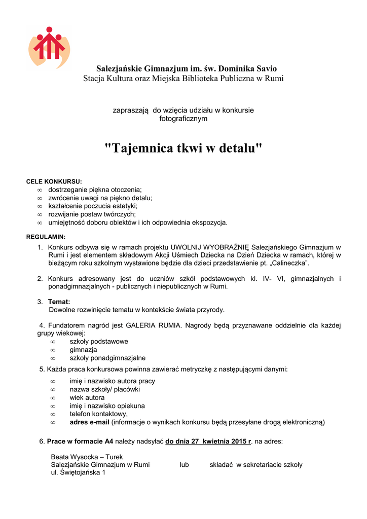 Salezjańskie Gimnazjum im. św. Dominika Savio Stacja Kultura oraz Miejska Biblioteka Publiczna w Rumi zapraszają do wzięcia udziału w konkursie fotograficznym "Tajemnica tkwi w detalu" CELE KONKURSU: • • • • • dostrzeganie piękna otoczenia; zwrócenie uwagi na piękno detalu; kształcenie poczucia estetyki; rozwijanie postaw twórczych; umiejętność doboru obiektów i ich odpowiednia ekspozycja. REGULAMIN: 1. Konkurs odbywa się w ramach projektu UWOLNIJ WYOBRAŹNIĘ Salezjańskiego Gimnazjum w Rumi i jest elementem składowym Akcji Uśmiech Dziecka na Dzień Dziecka w ramach, której w bieżącym roku szkolnym wystawione będzie dla dzieci przedstawienie pt. „Calineczka”. 2. Konkurs adresowany jest do uczniów szkół podstawowych kl. IV- VI, gimnazjalnych i ponadgimnazjalnych - publicznych i niepublicznych w Rumi. 3. Temat: Dowolne rozwinięcie tematu w kontekście świata przyrody. 4. Fundatorem nagród jest GALERIA RUMIA. Nagrody będą przyznawane oddzielnie dla każdej grupy wiekowej: • szkoły podstawowe • gimnazja • szkoły ponadgimnazjalne 5. Każda praca konkursowa powinna zawierać metryczkę z następującymi danymi: • • • • • • imię i nazwisko autora pracy nazwa szkoły/ placówki wiek autora imię i nazwisko opiekuna telefon kontaktowy, adres e-mail (informacje o wynikach konkursu będą przesyłane drogą elektroniczną) 6. Prace w formacie A4 należy nadsyłać do dnia 27 kwietnia 2015 r. na adres: Beata Wysocka – Turek Salezjańskie Gimnazjum w Rumi ul. Świętojańska 1 lub składać w sekretariacie szkoły 7. Podsumowanie konkursu i wręczenie dyplomów i nagród nastąpi 6 maja, godz. 18.00 (środa) w STACJI KULTURA – podczas spotkania rozpoczynającego wernisaż wystawy fotografii najlepszych prac uczniów z całej Rumi, która potrwa do 31 maja ( wszyscy nagrodzeni zostaną poinformowani drogą elektroniczną ). 8. Organizatorzy konkursu zastrzegają sobie prawo publikowania i reprodukowania prac konkursowych bez wypłacania honorariów autorskich. 9. Prace będą zwracane na prośbę wykonawcy po zamknięciu ekspozycji. 10.Uczestnictwo w konkursie jest równoznaczne z wyrażeniem zgody na publikację danych dotyczących wizerunku uczestnika i placówki, w związku z konkursem, jeżeli nie zmieni się cel ich przetwarzania. 11.Odpowiedzialność za bezpieczeństwo laureatów przybyłych na podsumowanie konkursu ponoszą ich opiekunowie. Serdecznie zapraszamy do wzięcia udziału w konkursie Beata Wysocka - Turek wicedyrektor Salezjańskie Gimnazjum im. św. Dominika Savio Rumia 84-230 ul. Świętojańska 1 tel. kont. 503-601-509