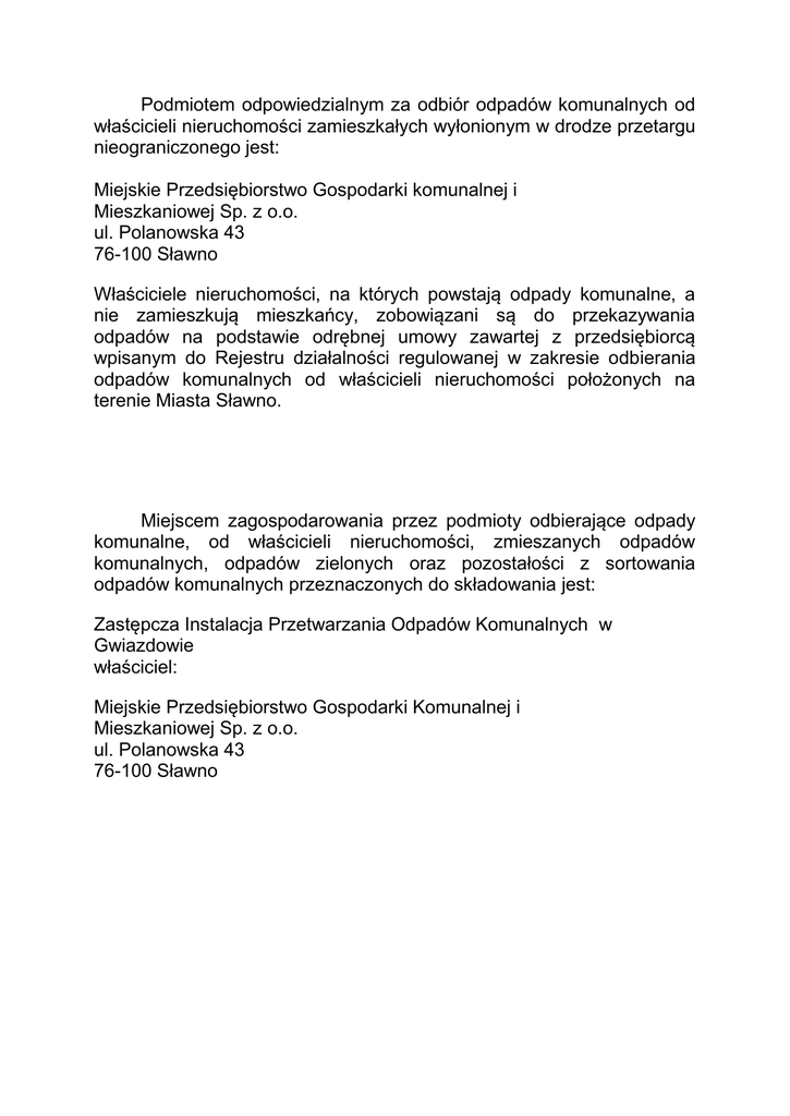 Podmiotem odpowiedzialnym za odbiór odpadów komunalnych od właścicieli nieruchomości zamieszkałych wyłonionym w drodze przetargu nieograniczonego jest: Miejskie Przedsiębiorstwo Gospodarki komunalnej i Mieszkaniowej Sp. z o.o. ul. Polanowska 43 76-100 Sławno Właściciele nieruchomości, na których powstają odpady komunalne, a nie zamieszkują mieszkańcy, zobowiązani są do przekazywania odpadów na podstawie odrębnej umowy zawartej z przedsiębiorcą wpisanym do Rejestru działalności regulowanej w zakresie odbierania odpadów komunalnych od właścicieli nieruchomości położonych na terenie Miasta Sławno. Miejscem zagospodarowania przez podmioty odbierające odpady komunalne, od właścicieli nieruchomości, zmieszanych odpadów komunalnych, odpadów zielonych oraz pozostałości z sortowania odpadów komunalnych przeznaczonych do składowania jest: Zastępcza Instalacja Przetwarzania Odpadów Komunalnych w Gwiazdowie właściciel: Miejskie Przedsiębiorstwo Gospodarki Komunalnej i Mieszkaniowej Sp. z o.o. ul. Polanowska 43 76-100 Sławno