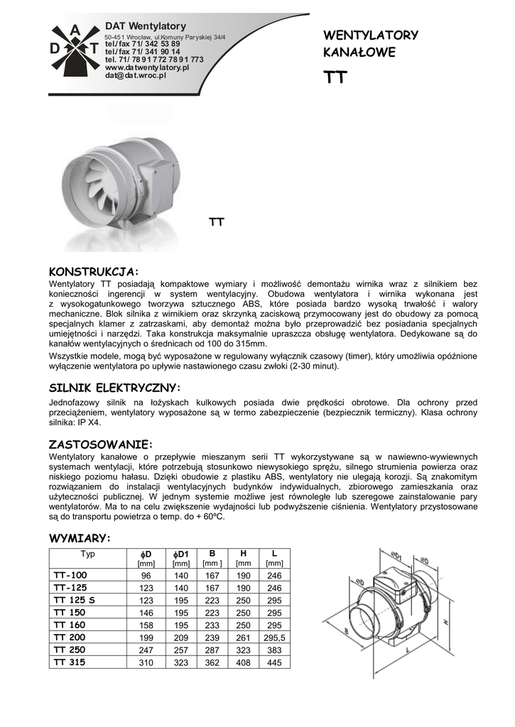 DAT Wentylatory A D T WENTYLATORY KANAŁOWE 50-45 1 Wrocław, ul.Komuny Par yskiej 34/4 tel./ fax 71/ 342 53 89 tel./ fax 71/ 341 90 14 tel. 71/ 78 9 1 7 72 78 9 1 773 www.da twenty latory.pl dat@ da t.wroc.pl TT TT KONSTRUKCJA: Wentylatory TT posiadają kompaktowe wymiary i możliwość demontażu wirnika wraz z silnikiem bez konieczności ingerencji w system wentylacyjny. Obudowa wentylatora i wirnika wykonana jest z wysokogatunkowego tworzywa sztucznego ABS, które posiada bardzo wysoką trwałość i walory mechaniczne. Blok silnika z wirnikiem oraz skrzynką zaciskową przymocowany jest do obudowy za pomocą specjalnych klamer z zatrzaskami, aby demontaż można było przeprowadzić bez posiadania specjalnych umiejętności i narzędzi. Taka konstrukcja maksymalnie upraszcza obsługę wentylatora. Dedykowane są do kanałów wentylacyjnych o średnicach od 100 do 315mm. Wszystkie modele, mogą być wyposażone w regulowany wyłącznik czasowy (timer), który umożliwia opóźnione wyłączenie wentylatora po upływie nastawionego czasu zwłoki (2-30 minut). SILNIK ELEKTRYCZNY: Jednofazowy silnik na łożyskach kulkowych posiada dwie prędkości obrotowe. Dla ochrony przed przeciążeniem, wentylatory wyposażone są w termo zabezpieczenie (bezpiecznik termiczny). Klasa ochrony silnika: IP X4. ZASTOSOWANIE: Wentylatory kanałowe o przepływie mieszanym serii TT wykorzystywane są w nawiewno-wywiewnych systemach wentylacji, które potrzebują stosunkowo niewysokiego sprężu, silnego strumienia powierza oraz niskiego poziomu hałasu. Dzięki obudowie z plastiku ABS, wentylatory nie ulegają korozji. Są znakomitym rozwiązaniem do instalacji wentylacyjnych budynków indywidualnych, zbiorowego zamieszkania oraz użyteczności publicznej. W jednym systemie możliwe jest równoległe lub szeregowe zainstalowanie pary wentylatorów. Ma to na celu zwiększenie wydajności lub podwyższenie ciśnienia. Wentylatory przystosowane są do transportu powietrza o temp. do + 60ºC. WYMIARY: Typ TT-100 TT-125 TT 125 S TT 150 TT 160 TT 200 TT 250 TT 315 D D1 B H L [mm] [mm] [mm ] [mm [mm] 96 123 123 146 158 199 247 310 140 140 195 195 195 209 257 323 167 167 223 223 233 239 287 362 190 190 250 250 250 261 323 408 246 246 295 295 295 295,5 383 445 DAT Wentylatory A D T WENTYLATORY KANAŁOWE 50-45 1 Wrocław, ul.Komuny Par yskiej 34/4 tel./ fax 71/ 342 53 89 tel./ fax 71/ 341 90 14 tel. 71/ 78 9 1 7 72 78 9 1 773 www.da twenty latory.pl dat@ da t.wroc.pl TT DANE TECHNICZNE: poziom ciśnienia akustycznego [dB(A)] z 3m max temp. [OC] masa 1~230 35 28 60 1,4 0,26 0,19 1~230 36 29 60 1,4 0,054 0,028 0,16 0,10 1~230 42 31 60 3 2450 1670 0,060 0,030 0,27 0,17 1~230 44 33 60 3 340 275 2450 1670 0,060 0,030 0,17 0,27 1~230 44 33 60 3 1040 830 345 255 2510 2045 0,125 0,090 0,55 0,4 1~230 52 45 60 6,4 TT 250 1400 1110 450 340 2440 1955 0,177 0,125 0,79 0,54 1~230 55 47 60 8,3 TT 315 2350 645 2660 0,330 1,43 1760 425 1980 0,225 0,98 60 11,4 [1/min] moc silnika [kW] natężenie prądu [A] 135 120 2500 2450 0,033 0,021 0,20 0,12 280 220 138 108 2500 1900 0,037 0,023 TT 125 S 345 285 360 330 2500 1875 TT 150 552 167 340 275 TT 160 552 467 TT 200 wydajność [m3/h] spręż [Pa] obroty TT 100 187 145 TT 125 Typ zasilanie [V] 1~230 58 49 CHARAKTERYSTYKI: TT 100 TT 125 [kg] DAT Wentylatory A D T 50-45 1 Wrocław, ul.Komuny Par yskiej 34/4 tel./ fax 71/ 342 53 89 tel./ fax 71/ 341 90 14 tel. 71/ 78 9 1 7 72 78 9 1 773 www.da twenty latory.pl dat@ da t.wroc.pl WENTYLATORY KANAŁOWE TT TT 125S TT 150 TT 160 TT 200 DAT Wentylatory A D T 50-45 1 Wrocław, ul.Komuny Par yskiej 34/4 tel./ fax 71/ 342 53 89 tel./ fax 71/ 341 90 14 tel. 71/ 78 9 1 7 72 78 9 1 773 www.da twenty latory.pl dat@ da t.wroc.pl TT 250 WENTYLATORY KANAŁOWE TT TT 315