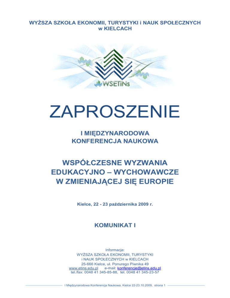 WYśSZA SZKOŁA EKONOMII, TURYSTYKI i NAUK SPOŁECZNYCH w KIELCACH ZAPROSZENIE I MIĘDZYNARODOWA KONFERENCJA NAUKOWA WSPÓŁCZESNE WYZWANIA EDUKACYJNO – WYCHOWAWCZE W ZMIENIAJĄCEJ SIĘ EUROPIE Kielce, 22 - 23 października 2009 r. KOMUNIKAT I Informacje: WYśSZA SZKOŁA EKONOMII, TURYSTYKI i NAUK SPOŁECZNYCH w KIELCACH 25-666 Kielce, ul. Ponurego Piwnika 49 www.etins.edu.pl e-mail: [email protected] tel./fax: 0048 41 345-85-88, tel. 0048 41 345-23-57 I Międzynarodowa Konferencja Naukowa, Kielce 22-23.10.2009, strona 1 ADRESACI KONFERENCJI Adresatami konferencji są w szczególności pracownicy naukowi z ośrodków akademickich krajowych i zagranicznych oraz pracownicy instytucji edukacyjnych, wychowawczych, profilaktycznych, terapeutycznych, resocjalizacyjnych, penitencjarnych. Na obrady zapraszamy równieŜ przedstawicieli świata biznesu, instytucji poŜytku publicznego, a takŜe studentów oraz wszystkie osoby zainteresowane. CEL KONFERENCJI Celem konferencji jest utworzenie interdyscyplinarnej przestrzeni współpracy i wymiany doświadczeń na płaszczyźnie teorii i praktyki pedagogicznej z udziałem pracowników nauki, administracji publicznej, stowarzyszeń, róŜnych instytucji prywatnych, państwowych oraz organizacji pozarządowych i innych. TEMATYKA KONFERENCJI Zagadnienia szczegółowe w ramach tematu: I. Pomoc psychologiczno – pedagogiczna w zmieniającej się Europie II. Wspomaganie rozwoju dzieci i młodzieŜy III. Profilaktyka i resocjalizacja w standardzie UE IV. Praca socjalna wobec wyzwań MIĘDZYNARODOWY KOMITET NAUKOWY Przewodniczący: dr Jan Telus – Rektor WyŜszej Szkoły Ekonomii, Turystyki i Nauk Społecznych w Kielcach, Członkowie: prof. zw. dr hab. Stefan Mieszalski prof. zw. dr hab. Zbigniew Tarkowski prof. nadzw. dr hab. Mirosław Babiarz prof. dr hab. Jolanta Karbowniczek ks. prof. nadzw. dr hab. Piotr Mazur prof. dr Slavoljub Vicić – Rektor, The College of Hotel Management – Belgrade, Serbia doc. dr Stefan Kireta – Vice Dean Faculty of Management, University of Presov, Slovakia prof. dr nauk prawnych Ilia Wasiliewicz Iliev – Prezydent Międzynarodowej Akademii Nauk Humanistycznych, Sofia, Bułgaria prof. dr Nicolay Mazhar – Rektor, Humanity University in Smolensk, Russia Vadim Vitynski – Volin Institute of Economy and Management in Łuck, Ukraine PeadDr. Iwan Pavlov PhD – Dyrektor Centrum Metodyczno - Pedagogicznego w Preszowie, Słowacja I Międzynarodowa Konferencja Naukowa, Kielce 22-23.10.2009, strona 2 KOMITET ORGANIZACYJNY Przewodniczący prof. nadzw. dr hab. Mirosław Babiarz Członkowie: dr ElŜbieta Męcina-Bednarek; dr Jolanta Góral – Półrola, dr Maria Kotomska, dr Karol Bidziński KALENDARIUM Względy organizacyjne wymagają ścisłego przestrzegania przedstawionego niŜej harmonogramu, o co serdecznie prosimy: do 30 września 2009 – elektroniczne przesłanie abstraktu na adres sekretariatu konferencji do 30 września 2009 – akceptacja tematu i abstraktu do 10 października 2009 – ostateczny termin przysłania referatów do 15 października 2009 – płatność za udział w konferencji 22-23 października 2009 – termin konferencji PROGRAM KONFERENCJI 22 października 2009 (czwartek) 10.00 – 11.00 – rejestracja uczestników 11.00 – 12.30– sesja plenarna 12.30 – 13.00 – przerwa kawowa 13.00 – 14.00 – sesja plenarna (c.d.) 14.00 – 15.00 – przerwa obiadowa 15.00 – 18.00 – praca w sekcjach 20.00 – uroczysta kolacja 23 października 2009 (piątek) 10.00 – 11.30 sesja plenarna 11.30 – 12.00 – przerwa kawowa 12.00 – 12.30 – podsumowanie obrad 13.00 – uroczysta inauguracja roku akademickiego 2009/2010 WYMOGI EDYTORSKIE Tekst abstraktu i referatu w języku polskim lub angielskim. Abstrakt maksymalnie do 200 znaków, objętość referatu max. 20 stron (1/2 arkusza wydawniczego). Tekst referatu w formie MS Word, czcionka Times New Roman (12 pkt), odstęp między liniami: 1,5. Standardowa strona formatu A4, marginesy: lewy: 3,5 cm, pozostałe: 2,5 cm. Struktura referatu - tytuł – 14 pkt, duŜymi literami, pogrubione, scentrowane, imię i nazwisko Autora – 12 pkt, kursywą, scentrowane, nazwa i miejsce pracy Autora – 12pkt, kursywą, scentrowane, I Międzynarodowa Konferencja Naukowa, Kielce 22-23.10.2009, strona 3 tekst – 12 pkt, odstęp 1,5, z wcięciem 6 mm na początku kaŜdego akapitu, wyjustowany, przypisy bezpośrednio w tekście w formacie [nr, s.24] – gdzie nr oznacza numer pozycji ze spisu literatury, - literatura – 11 pkt, w formacie: [numer] nazwisko i imię autora, tytuł (kursywą), wydawnictwo, miejsce wydania, rok. - streszczenie – 11 pkt, kursywą, w języku angielskim. Dla kaŜdego uczestnika przeznaczone jest 10 minut na prezentację oraz 5 minut na dyskusję. MoŜliwość prezentacji multimedialnej. Języki konferencji: polski, angielski, rosyjski. - OPŁATY Koszt uczestnictwa w konferencji wynosi 400 zł. Opłata obejmuje uczestnictwo w obradach i imprezach towarzyszących, materiały konferencyjne oraz wyŜywienie. Prosimy o kierowanie wpłat na konto: Bank PKO BP S.A. 59102026290000990201246362 z dopiskiem: „Konferencja” NOCLEG Koszt uczestnictwa nie obejmuje opłaty za noclegi. Konferencja będzie się odbywać w hotelu Exbud Skanska w Kielcach. Uczestnicy konferencji koszty zakwaterowania pokrywają osobiście bezpośrednio w recepcji (miejsca będą wcześniej zarezerwowane przez organizatorów). SEKRETARIAT KONFERENCJI dr ElŜbieta Męcina - Bedanrek Dziekan Wydziału Pedagogicznego WyŜsza Szkoła Ekonomii, Turystyki i Nauk Społecznych w Kielcach e-mail: [email protected] tel.: 0048 41 345-23-57 tel./fax: 0048 41 345-85-88 web site: www.etins.edu.pl I Międzynarodowa Konferencja Naukowa, Kielce 22-23.10.2009, strona 4