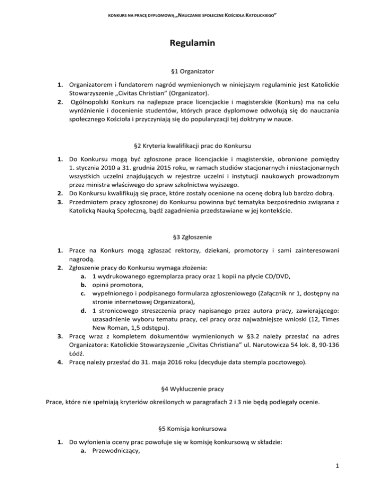 KONKURS NA PRACĘ DYPLOMOWĄ „NAUCZANIE SPOŁECZNE KOŚCIOŁA KATOLICKIEGO” Regulamin §1 Organizator 1. Organizatorem i fundatorem nagród wymienionych w niniejszym regulaminie jest Katolickie Stowarzyszenie „Civitas Christian” (Organizator). 2. Ogólnopolski Konkurs na najlepsze prace licencjackie i magisterskie (Konkurs) ma na celu wyróżnienie i docenienie studentów, których prace dyplomowe odwołują się do nauczania społecznego Kościoła i przyczyniają się do popularyzacji tej doktryny w nauce. §2 Kryteria kwalifikacji prac do Konkursu 1. Do Konkursu mogą być zgłoszone prace licencjackie i magisterskie, obronione pomiędzy 1. stycznia 2010 a 31. grudnia 2015 roku, w ramach studiów stacjonarnych i niestacjonarnych wszystkich uczelni znajdujących w rejestrze uczelni i instytucji naukowych prowadzonym przez ministra właściwego do spraw szkolnictwa wyższego. 2. Do Konkursu kwalifikują się prace, które zostały ocenione na ocenę dobrą lub bardzo dobrą. 3. Przedmiotem pracy zgłoszonej do Konkursu powinna być tematyka bezpośrednio związana z Katolicką Nauką Społeczną, bądź zagadnienia przedstawiane w jej kontekście. §3 Zgłoszenie 1. Prace na Konkurs mogą zgłaszać rektorzy, dziekani, promotorzy i sami zainteresowani nagrodą. 2. Zgłoszenie pracy do Konkursu wymaga złożenia: a. 1 wydrukowanego egzemplarza pracy oraz 1 kopii na płycie CD/DVD, b. opinii promotora, c. wypełnionego i podpisanego formularza zgłoszeniowego (Załącznik nr 1, dostępny na stronie internetowej Organizatora), d. 1 stronicowego streszczenia pracy napisanego przez autora pracy, zawierającego: uzasadnienie wyboru tematu pracy, cel pracy oraz najważniejsze wnioski (12, Times New Roman, 1,5 odstępu). 3. Pracę wraz z kompletem dokumentów wymienionych w §3.2 należy przesłać na adres Organizatora: Katolickie Stowarzyszenie „Civitas Christiana” ul. Narutowicza 54 lok. 8, 90-136 Łódź. 4. Pracę należy przesłać do 31. maja 2016 roku (decyduje data stempla pocztowego). §4 Wykluczenie pracy Prace, które nie spełniają kryteriów określonych w paragrafach 2 i 3 nie będą podlegały ocenie. §5 Komisja konkursowa 1. Do wyłonienia oceny prac powołuje się w komisję konkursową w składzie: a. Przewodniczący, 1 KONKURS NA PRACĘ DYPLOMOWĄ „NAUCZANIE SPOŁECZNE KOŚCIOŁA KATOLICKIEGO” b. Wiceprzewodniczący, c. Wiceprzewodniczący, d. Sekretarz. 2. Decyzje komisji konkursowej są nieodwołalne. §6 Ocena prac 1. Prace będą oceniane w dwóch głównych kategoriach: prac licencjackich i prac magisterskich. W tych kategoriach zostanie sporządzony ranking końcowy. 2. Punkty zostaną przyznane przez komisję obradującą w pełnym składzie. 3. Każda praca zostanie oceniona w skali od 0 do 100 punktów według formularza oceny (Załącznik nr 2). 4. W przypadku równej liczby punktów uzyskanej przez poszczególne prace decydujący głos ma przewodniczący komisji. §7 Nagrody 1. Przewiduje się następujące nagrody za prace licencjackie: a. Nagroda główna za najlepszą pracę licencjacką w wysokości 700 zł b. 2 wyróżnienia po 400 zł każde. 2. Przewiduje się następujące nagrody za prace magisterskie: a. Nagroda główna za najlepszą pracę magisterską w wysokości 1000 zł b. 2 wyróżnienia po 500 zł każde. 3. Wśród wszystkich zakwalifikowanych do Konkursu prac przewiduje się przyznanie również dwóch nagród specjalnych: a. Nagrody na najlepiej zredagowaną pracę 500 zł b. Nagrody publiczności w wysokości 300 zł 4. Otrzymanie nagrody specjalnej nie eliminuje z możliwości otrzymania nagrody głównej lub wyróżnienia. a. Nagroda na najlepiej zredagowaną pracę zostanie przyznana przez zawodowego korektora. b. Nagroda publiczności zostanie przyznana poprzez głosowanie w internecie. Głosowanie trwać będzie od 13. do 30. czerwca 2016 roku. 5. Organizator zastrzega sobie prawo do wstrzymania się od przyznania nagrody głównej lub wyróżnień jeśli komisja konkursowa nie przyzna żadnej pracy przynajmniej 75 punktów. 6. Pula nagród może być powiększona dotacjami sponsorów, zarówno osób prawnych jak i fizycznych. Informacja o dodatkowych nagrodach w Konkursie zostanie umieszczona na stronie internetowej Organizatora. 7. Wręczenie nagród przewidziane jest na 17. października 2016 roku w Łodzi. O dokładnej lokalizacji miejsca Organizator poinformuje na stronie internetowej do 31. lipca 2016 roku. 8. Dla promotorów nagrodzonych prac przewidziano dyplomy. §8 Postanowienia końcowe 1. Organizator zastrzega sobie prawo do zmiany niniejszego regulaminu w uzasadnionych przypadkach. 2 KONKURS NA PRACĘ DYPLOMOWĄ „NAUCZANIE SPOŁECZNE KOŚCIOŁA KATOLICKIEGO” 2. Autorzy prac biorących udział w Konkursie wyrażają zgodę na przetwarzanie ich danych w zakresie niezbędnym do przeprowadzenia go w szczególności: a. Publikację nadesłanych streszczeń w internecie, w celu wyłonienia pracy nagrodzonej nagrodą publiczności. b. Publikację listy rankingowej z wynikami całego Konkursu. 3. Organizator zastrzega sobie prawo przesunięcia podanych w regulaminie terminów, o czym poinformuje w komunikacie na stronie internetowej Konkursu. 4. Wszelkie aktualne informacje dotyczące konkursu znajdują się na stronie internetowej http://lodzki.civitaschristiana.pl/konkursNSKK oraz są udzielane pod adresem [email protected] 3