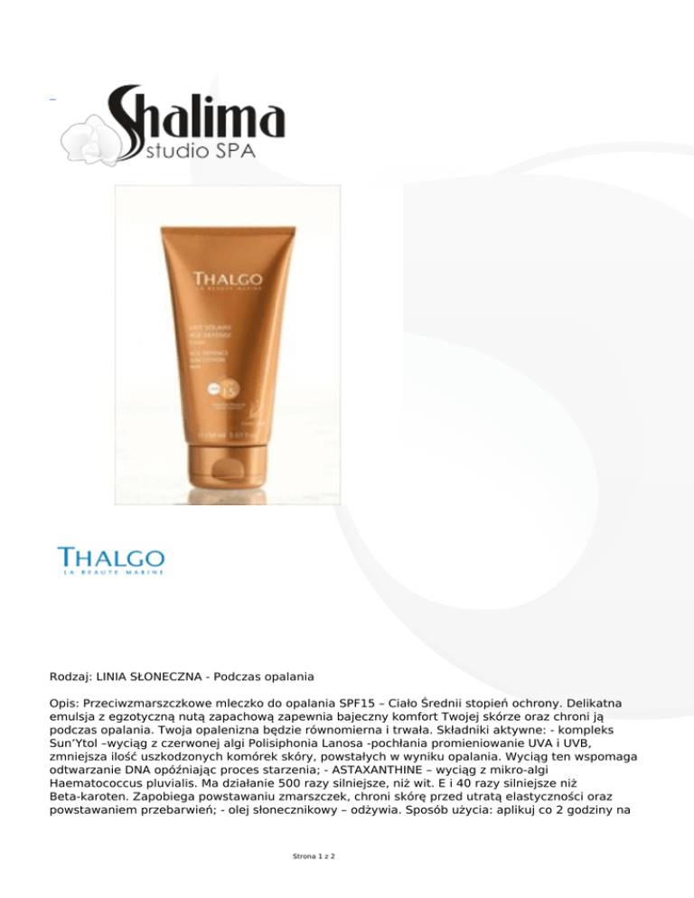 Rodzaj: LINIA SŁONECZNA - Podczas opalania Opis: Przeciwzmarszczkowe mleczko do opalania SPF15 – Ciało Średnii stopień ochrony. Delikatna emulsja z egzotyczną nutą zapachową zapewnia bajeczny komfort Twojej skórze oraz chroni ją podczas opalania. Twoja opalenizna będzie równomierna i trwała. Składniki aktywne: - kompleks Sun’Ytol –wyciąg z czerwonej algi Polisiphonia Lanosa -pochłania promieniowanie UVA i UVB, zmniejsza ilość uszkodzonych komórek skóry, powstałych w wyniku opalania. Wyciąg ten wspomaga odtwarzanie DNA opóźniając proces starzenia; - ASTAXANTHINE – wyciąg z mikro-algi Haematococcus pluvialis. Ma działanie 500 razy silniejsze, niż wit. E i 40 razy silniejsze niż Beta-karoten. Zapobiega powstawaniu zmarszczek, chroni skórę przed utratą elastyczności oraz powstawaniem przebarwień; - olej słonecznikowy – odżywia. Sposób użycia: aplikuj co 2 godziny na Strona 1 z 2 całe ciało, zwłaszcza po kontakcie z wodą. Płeć: Dla kobiety i mężczyzny Wiek: Do każdego wieku Rodzaj skóry: Do każdego rodzaju skóry Działanie: Nawilżające, Ochronne, Anty-Ageing Kategoria: Krem Strona 2 z 2
