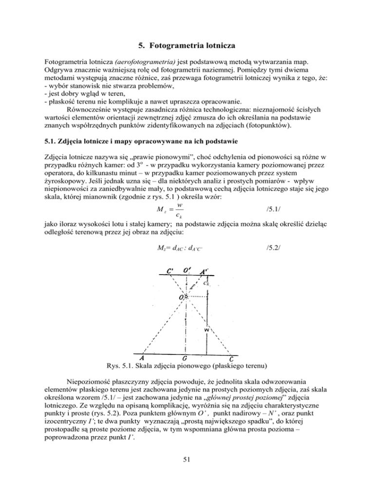 5. Fotogrametria lotnicza Fotogrametria lotnicza (aerofotogrametria) jest podstawową metodą wytwarzania map. Odgrywa znacznie ważniejszą rolę od fotogrametrii naziemnej. Pomiędzy tymi dwiema metodami występują znaczne różnice, zaś przewaga fotogrametrii lotniczej wynika z tego, że: - wybór stanowisk nie stwarza problemów, - jest dobry wgląd w teren, - płaskość terenu nie komplikuje a nawet upraszcza opracowanie. Równocześnie występuje zasadnicza różnica technologiczna: nieznajomość ścisłych wartości elementów orientacji zewnętrznej zdjęć zmusza do ich określania na podstawie znanych współrzędnych punktów zidentyfikowanych na zdjęciach (fotopunktów). 5.1. Zdjęcia lotnicze i mapy opracowywane na ich podstawie Zdjęcia lotnicze nazywa się „prawie pionowymi”, choć odchylenia od pionowości są różne w przypadku różnych kamer: od 3o - w przypadku wykorzystania kamery poziomowanej przez operatora, do kilkunastu minut – w przypadku kamer poziomowanych przez system żyroskopowy. Jeśli jednak uzna się – dla niektórych analiz i prostych pomiarów - wpływ niepionowości za zaniedbywalnie mały, to podstawową cechą zdjęcia lotniczego staje się jego skala, której mianownik (zgodnie z rys. 5.1 ) określa wzór: w /5.1/ Mz = ck jako iloraz wysokości lotu i stałej kamery; na podstawie zdjęcia można skalę określić dzieląc odległość terenową przez jej obraz na zdjęciu: Mz= dAC : dA’C’ /5.2/ ck Rys. 5.1. Skala zdjęcia pionowego (płaskiego terenu) Niepoziomość płaszczyzny zdjęcia powoduje, że jednolita skala odwzorowania elementów płaskiego terenu jest zachowana jedynie na prostych poziomych zdjęcia, zaś skala określona wzorem /5.1/ – jest zachowana jedynie na „głównej prostej poziomej” zdjęcia lotniczego. Ze względu na opisaną komplikację, wyróżnia się na zdjęciu charakterystyczne punkty i proste (rys. 5.2). Poza punktem głównym O’ , punkt nadirowy – N’ , oraz punkt izocentryczny I’; te dwa punkty wyznaczają „prostą największego spadku”, do której prostopadłe są proste poziome zdjęcia, w tym wspomniana główna prosta pozioma – poprowadzona przez punkt I’. 51 Rys. 5.2. Punkty charakterystyczne zdjęcia lotniczego nachylonego pod kątem ν : O’, I’, N’, oraz ich odpowiedniki terenowe: G, I, N Fotogrametria umożliwia opracowywanie różnorakich map – zarówno „rzeczywistych” (materialnych i „dotykalnych”) na podłożu papierowym, kartonowym, foliowym, czy na materiale fotograficznym, jak i wirtualnych (cyfrowych) – zapisanych na komputerowym nośniku danych. Fotogrametryczne mapy rzeczywiste mogą mieć albo postać kreskową (kontury sytuacyjne i warstwice), albo obrazową ( fotograficzną) – jak np. fotomapy, ortofotomapy. Mapy wirtualne mogą być wizualizowane (na ekranie monitora komputerowego) lub drukowane („plotowane”) – uzyskując charakter mapy rzeczywistej; kontury stanowią wtedy efekt wektoryzacji w cyfrowej stacji fotogrametrycznej. 5.2. Przetwarzanie pojedynczego zdjęcia lotniczego w mapę Zdjęcie lotnicze stanowi wartościowy materiał informacyjny, ale nie jest mapą z dwóch powodów: nie jest ściśle pionowe i nie posiada skali mapy. Przekształcenie pojedynczego zdjęcia lotniczego (niepionowego) w mapę drogą przekształcenia rzutowego nazywamy przetwarzaniem zdjęcia lotniczego. Jest ono jednak ścisłe tylko w przypadku terenu płaskiego. Zależność rzutową między mapą (opracowaną geodezyjnie) i fotomapą - stanowiącą efekt przetwarzania - ukazuje rysunek 4.9. Wiąże je łańcuch przekształceń perspektywicznych (rzutowań i przecinań) - świadczący o zależności rzutowej, co stanowi dowód geometrycznej poprawności przetwarzania. Przetwarzanie fotomechaniczne jest wykonywane w przetwornikach (rodzaj powiększalnika). Nie jest ono obecnie stosowane do produkcji map, ale poświęcimy mu nieco uwagi, ponieważ idea tej metody leży u podstaw przetwarzania ortofotoskopowego, a również dlatego, aby poznać naturę błędów i niedoskonałości map tą drogą uzyskanych (gdyby przyszło z nich korzystać). Przetwornik fotomechaniczny to duży, rozbudowany powiększalnik, automatycznie zapewniający ostrość obrazu rzutowanego na nachylany ekran. Zdjęcie lotnicze należy zestroić z podkładem. Podkład stanowi arkusz z naniesionymi w skali mapy czterema fotopunktami przetwarzanego zdjęcia (żadne trzy z nich nie mogą leżeć na jednej prostej !). Zestrojenie polega na doprowadzeniu do pokrycia (na ekranie) czterech par punktów: rzutowanych ze zdjęcia, z naniesionymi na podkładzie. Aby zestrojenie było możliwe, przetwornik musi mieć 5 „stopni swobody”, np: zmianę skali, nachylenie (zdjęcia i ekranu), obrót zdjęcia, oraz dwa (wzajemnie prostopadłe) przesunięcia. Po zestrojeniu naświetlamy papier światłoczuły ułożony na ekranie (w miejsce podkładu). Po wywołaniu zdjęcie stanowi fragment fotomapy. Z przetworzonych zdjęć można zmontować (skleić) sekcję fotomapy. 52 Wysokościowe opracowanie mapy (na podkładzie fotomapy) odbywało się na stoliku topograficznym. Metoda ta nosiła nazwę „kombinowanej”. Błędy sytuacyjne fotomap wywoływała niepłaskość terenu, powodująca zróżnicowanie skali zdjęcia: partie terenu położone wyżej mają bowiem skalę większą, zaś niżej – mniejszą; w trakcie przetwarzania należało zatem powiększać je w różnym stopniu. Stopień powiększenia negatywu, nadający założoną skalę jedynie szczegółom rozmieszczonym wzdłuż pewnej warstwicy, nadawał inne skale partiom terenu leżącym wyżej czy niżej od tej warstwicy. Trzeba więc było naświetlać zdjęcie kilkakrotnie (zmieniając współczynnik powiększenia), wykorzystując następnie z każdego zdjęcia tylko pewną strefę (ograniczoną dwiema warstwicami), poprawną w granicach dopuszczalnych błędów (0,3 mm). Było to tzw. przetwarzanie strefowe. Wpływ deniwelacji