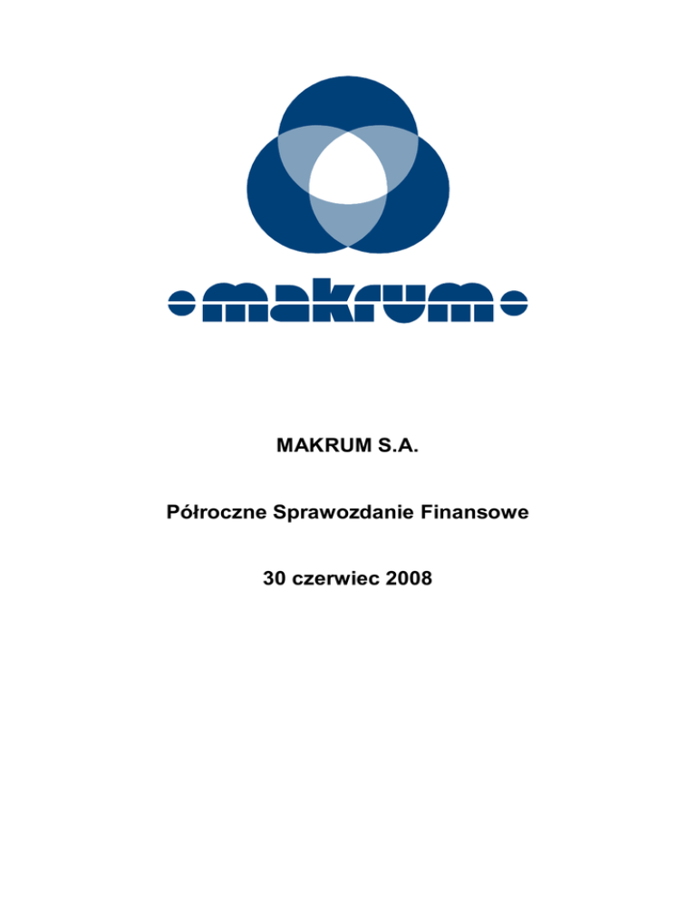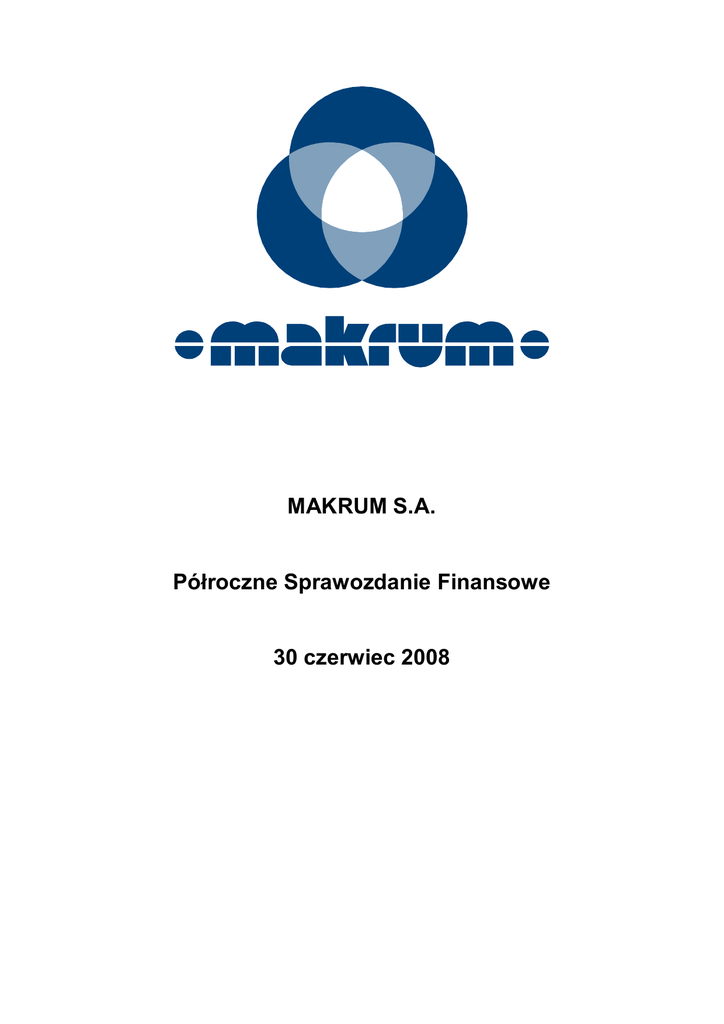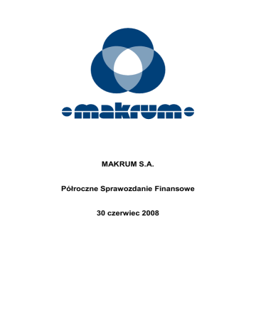MAKRUM S.A. Półroczne Sprawozdanie Finansowe 30 czerwiec 2008 Półroczne Sprawozdanie Finansowe 30 czerwca 2008 roku Indeks do sprawozdania finansowego INDEKS DO SPRAWOZDANIA FINANSOWEGO......................................................................................... 2 OŚWIADCZENIA ZARZĄDU............................................................................................................................ 3 WYBRANE DANE FINANSOWE ...................................................................................................................... 4 WPROWADZENIE DO SPRAWOZDANIA FINANSOWEGO ..................................................................... 5 BILANS................................................................................................................................................................ 22 RACHUNEK ZYSKÓW I STRAT.................................................................................................................... 24 ZESTAWIENIE ZMIAN W KAPITALE WŁASNYM................................................................................... 25 RACHUNEK PRZEPŁYWÓW PIENIĘśNYCH............................................................................................ 28 INFORMACJE DODATKOWE I NOTY OBJAŚNIAJĄCE ......................................................................... 30 NOTY OBJAŚNIAJĄCE DO POZYCJI BILANSOWYCH ............................................................................................. 30 Nota 1 - Wartości niematerialne i prawne .................................................................................................. 30 Nota 2 - Rzeczowe aktywa trwałe ................................................................................................................ 34 Nota 3 - NaleŜności długoterminowe........................................................................................................... 39 Nota 4 - Inwestycje długoterminowe ........................................................................................................... 39 Nota 5 - Długoterminowe rozliczenia międzyokresowe............................................................................... 41 Nota 6 - Zapasy ........................................................................................................................................... 42 Nota 7 - NaleŜności krótkoterminowe.......................................................................................................... 42 Nota 8 - NaleŜności sporne, przeterminowane oraz wątpliwe..................................................................... 44 Nota 9 - Inwestycje krótkoterminowe .......................................................................................................... 44 Nota 10 - Krótkoterminowe rozliczenia międzyokresowe............................................................................ 46 Nota 11 - Odpisy aktualizujące wartość aktywów ....................................................................................... 47 Nota 12 - Kapitał zakładowy (struktura) ..................................................................................................... 47 Nota 13 - Akcje (udziały) własne ................................................................................................................. 47 Nota 14 - Kapitał zapasowy......................................................................................................................... 48 Nota 15 - Kapitał z aktualizacji wyceny ...................................................................................................... 48 Nota 16 - Pozostałe kapitały rezerwowe (według celu przeznaczenia) ....................................................... 48 Nota 17 - Odpisy z zysku netto w ciągu roku obrotowego........................................................................... 48 Nota 18 - Rezerwy na zobowiązania............................................................................................................ 48 Nota 19 - Zobowiązania długoterminowe.................................................................................................... 50 Nota 20 - Zobowiązania krótkoterminowe .................................................................................................. 55 Nota 21 - Rozliczenia międzyokresowe........................................................................................................ 62 NOTY OBJAŚNIAJĄCE DO POZYCJI POZABILANSOWYCH ..................................................................................... 62 NOTY OBJAŚNIAJĄCE DO RACHUNKU ZYSKÓW I STRAT ..................................................................................... 63 Nota 23 - Przychody netto ze sprzedaŜy produktów .................................................................................... 63 Nota 24 - Przychody netto ze sprzedaŜy towarów i materiałów .................................................................. 63 Nota 25 - Koszty według rodzaju................................................................................................................. 64 Nota 26 - Inne przychody operacyjne.......................................................................................................... 65 Nota 27 - Inne koszty operacyjne ................................................................................................................ 65 Nota 28 - Przychody finansowe ................................................................................................................... 66 Nota 29 - Koszty finansowe ......................................................................................................................... 67 Nota 30 - Zyski nadzwyczajne ..................................................................................................................... 68 Nota 31 - Straty nad
