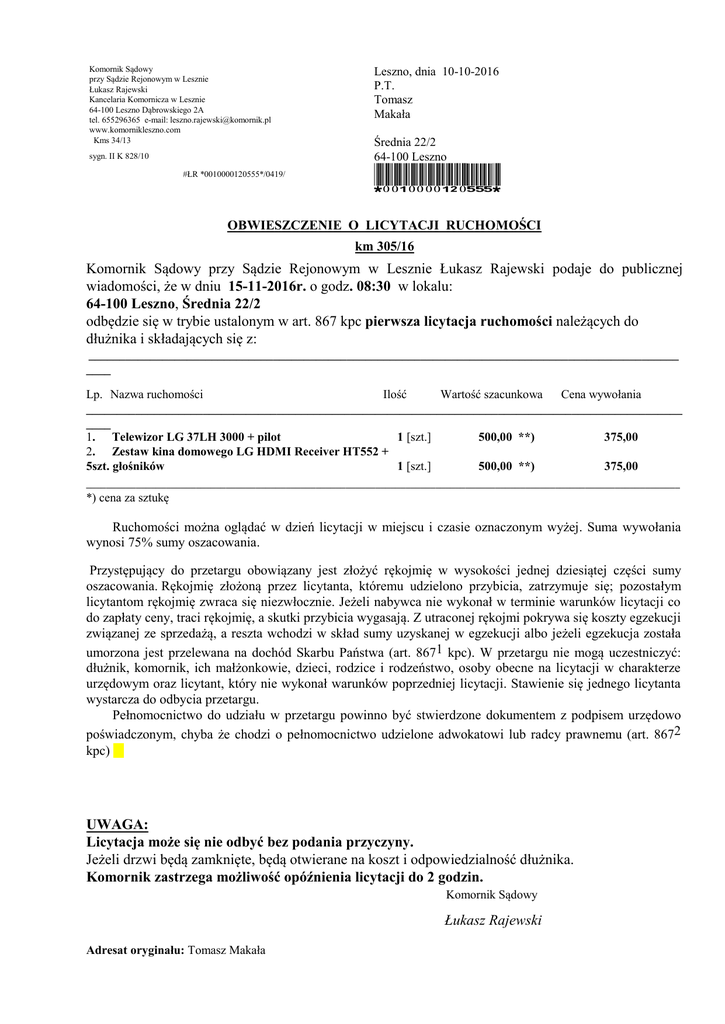 Obwieszczenie o licytacji - Kancelaria Komornicza w Lesznie