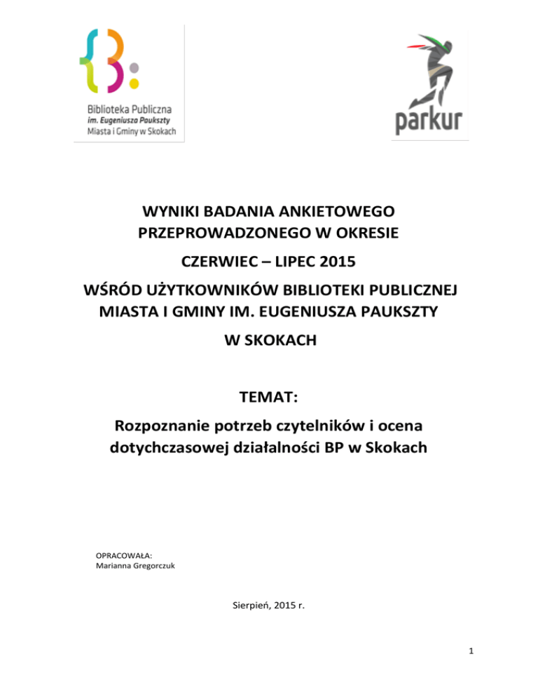 WYNIKI BADANIA ANKIETOWEGO PRZEPROWADZONEGO W OKRESIE CZERWIEC – LIPEC 2015 WŚRÓD UŻYTKOWNIKÓW BIBLIOTEKI PUBLICZNEJ MIASTA I GMINY IM. EUGENIUSZA PAUKSZTY W SKOKACH TEMAT: Rozpoznanie potrzeb czytelników i ocena dotychczasowej działalności BP w Skokach OPRACOWAŁA: Marianna Gregorczuk Sierpień, 2015 r. 1 W badaniu ankietowym przeprowadzonym w okresie czerwiec – lipiec 2015 r. wzięło udział 100 respondentów (10% użytkowników Biblioteki). Ankiety rozdawane były w siedzibie Biblioteki, a więc wypełniały je osoby, które w danym momencie korzystały na miejscu z jej usług. Badanie prowadzone było z podziałem na: 1) Płeć; 2) Grupy wiekowe: - do 20 lat, - 21-30 lat, - 31-40 lat, - 41-50 lat i - powyżej 50 lat; 3) Miejsce zamieszkania: - miasto; - wieś. Wyniki badania przedstawiono w formie opisowej, jak też w postaci tabel i wykresów. Analizując metryczki otrzymaliśmy następujące dane: 77 % ankiet wypełnionych zostało przez kobiety, co nasuwa myśl, że więcej kobiet niż mężczyzn korzysta z Biblioteki w Skokach. 55% ankiet wypełniły osoby w wieku do 20 lat. Jest to prawdopodobnie spowodowane tym, że Biblioteka ma swoją siedzibę w budynku skockiego Gimnazjum, którego uczniowie licznie korzystają z jej zasobów w przerwach między lekcjami. Ankiety wypełnione zostały zarówno przez osoby zamieszkujące teren miasta (58%), jak i wsi (42%), co pozwala sądzić, że dostęp do zasobów BP w Skokach jest w miarę wyrównany. Analizując jednak dalej tą kwestię zauważamy, że najwięcej osób z terenów wiejskich stanowią osoby z grupy wiekowej do 20 lat (76%), a więc najprawdopodobniej uczniowie skockiego Gimnazjum, które jest jedynym w gminie Skoki. Osoby te są w Skokach codziennie (w roku szkolnym), mają więc znacznie ułatwiony dostęp do biblioteki w porównaniu do osób z terenów wiejskich z pozostałych grup wiekowych. Należy zauważyć, że w Gminie Skoki nie funkcjonuje komunikacja podmiejska. Ankietowani wg płci Ankietowani wg miejsca zamieszkania 100 90 80 77 70 60 50 40 30 23 20 10 0 Kobieta Mężczyzna 100 90 80 70 60 50 40 30 20 10 0 58 42 Miasto Wieś 2 Ankietowani wg wieku 100 90 80 70 55 60 50 40 30 18 20 10 9 41-50 lat powyżej 50 lat 8 10 0 do 20 lat 21-30 lat lat Pytanie nr 1. Jak często korzystasz z usług BP31-40 w Skokach? Ankietowani wg wieku i miejsca zamieszkania 35 32 30 25 23 20 15 15 10 7 7 6 5 3 4 31-40 lat 41-50 lat 1 2 0 do 20 lat 21-30 lat miasto powyżej 50 lat wieś Dane uzyskane z analizy odpowiedzi udzielonych przez ankietowanych na pytania zawarte w ankiecie: Wykres nr 1. Jak często korzystasz z usług BP w Skokach? 100 90 80 70 60 50 40 30 20 10 0 27 16 19 26 1 a) Codziennie b) Raz w tygodniu 7 3 c) Raz w d) Kilka razy e) Raz w f) Kilka razy g) Żadne z miesiącu w miesiącu roku w roku powyższych 1 Zaznaczono kilka odpowiedzi (błąd) 3 88% badanych deklaruje korzystanie z usług Biblioteki nie rzadziej niż raz w miesiącu. Osoby wskazujące na codzienne korzystanie z Biblioteki (16%), to w głównej mierze młodzież w wieku do 20 lat. Są to prawdopodobnie (jak już wcześniej wspomniano) gimnazjaliści, którzy chętnie przychodzą do Biblioteki w przerwach pomiędzy lekcjami. Wykres nr 2. Czy znasz godziny otwarcia BP w Skokach? Wykres nr 3. Oceń godziny otwarcia BP w Skokach w skali 1-5, gdzie 5 oznacza bardzo dobre, nie wymagają zmiany, a 1 oznacza zupełnie niedopasowane do potrzeb społeczeństwa. 100 90 80 76 70 80 60 70 50 60 40 50 30 50 40 24 30 20 18 20 10 10 0 1 1 2 7 0 0 TAK NIE 3 4 5 76% badanych wie, w jakich godzinach otwarta jest skocka Biblioteka. 65 % osób z tej grupy ocenia godziny otwarcia Biblioteki na poziomie 5. Wykres nr 4b. Czy znasz zakres działań (ofertę dla mieszkańców) jakie oferuje BP w Skokach? - z podziałem na gupy wiekowe - Wykres nr 4. Czy znasz zakres działań (ofertę dla mieszkańców) jakie oferuje BP w Skokach? 100 suma 90 80 powyżej 50 lat 74 41-50 lat 70 31-40 lat 60 21-30 lat 50 do 20 lat 40 0 26 30 20 10 0 TAK NIE 20 40 NIE do 20 lat 24 21-30 lat 1 31-40 lat 1 TAK 31 7 17 NIE 60 80 41-50 powyżej suma lat 50 lat 0 0 26 10 9 74 TAK 4 74% badanych deklaruje znajomość oferty kierowanej do lokalnej społeczności przez Bibliotekę. 26% ankietowanych nie zna tej oferty, przy czym 92% tej grupy stanowią osoby w wieku do 20 lat. Wykres nr 5. Oceń ofertę BP w Skokach w skali 15, gdzie 5 oznacza bardzo szeroka, a 1 oznacza całkowity brak podejmowanych działań. Wykres nr 6. Czy są działania, których BP w Skokach nie podejmuje, a powinna? 100 80 90 70 80 50 50 60 50 40 40 30 30 21 20 20 10 69 70 60 10 0 0 1 2 3 23 8 0 0 TAK 3 4 5 NIE Brak odpowiedzi 67 % osób z pośród deklarujących znajomość oferty BP w Skokach, oceniło ją na poziomie 5. 8% ankietowanych zasugerowało zmiany w obecnym programie działania. Wśród wymienianych propozycji znalazły się: - zajęcia plastyczne; - dyskusje o książkach; - nauka tańca – balet; - wakacyjne zorganizowane formy spędzania czasu dla dzieci; - techniki uczenia się dla dzieci (ew. dorosłych); - techniki ćwiczenia pamięci; - rozwój myślenia analitycznego dla dzieci; - wycieczki do opery, teatru muzycznego; - sekcja szachowa, warcabowa, turystyczna; - rozszerzenie oferty dla dorosłych; -upowszechnianie czytelnictwa wśród dorosłych. Na pytanie: z których usług/działań oferowanych przez Bibliotekę najczęściej korzystasz ?, ankietowani najczęściej odpowiadali: - wypożyczanie książek; - Internet/komputery; - korzystanie z czytelni; - udział w kołach zainteresowań/zajęciach dodatkowych organizowanych przez Bibliotekę (plastyka, śpiew – Skoczki, gra na instrumentach, j. angielski); - spotkania ze znanymi i ciekawymi osobami; - konkursy; - imprezy (koncerty, kabarety) - wieczory poezji; - półkolonie, zarówno letnie jak i zimowe; - kino; - gry planszowe, play station. 5 Wykres nr 7. W jaki sposób dowiadujesz się o działaniach podejmowanych przez BP w Skokach? 45 