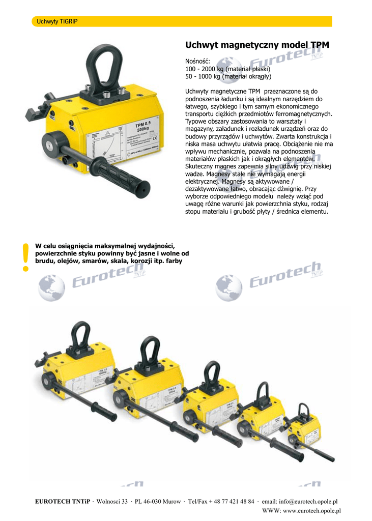 Uchwyty TIGRIP Uchwyt magnetyczny model TPM Nośność: 100 - 2000 kg (materiał płaski) 50 - 1000 kg (materiał okrągły) Uchwyty magnetyczne TPM przeznaczone są do podnoszenia ładunku i są idealnym narzędziem do łatwego, szybkiego i tym samym ekonomicznego transportu ciężkich przedmiotów ferromagnetycznych. Typowe obszary zastosowania to warsztaty i magazyny, załadunek i rozładunek urządzeń oraz do budowy przyrządów i uchwytów. Zwarta konstrukcja i niska masa uchwytu ułatwia pracę. Obciążenie nie ma wpływu mechanicznie, pozwala na podnoszenia materiałów płaskich jak i okrągłych elementów. Skuteczny magnes zapewnia silny udźwig przy niskiej wadze. Magnesy stałe nie wymagają energii elektrycznej. Magnesy są aktywowane / dezaktywowane łatwo, obracając dźwignię. Przy wyborze odpowiedniego modelu należy wziąć pod uwagę różne warunki jak powierzchnia styku, rodzaj stopu materiału i grubość płyty / średnica elementu. W celu osiągnięcia maksymalnej wydajności, powierzchnie styku powinny być jasne i wolne od brudu, olejów, smarów, skala, korozji itp. farby EUROTECH TNTiP . Wolnosci 33 . PL 46-030 Murow . Tel/Fax + 48 77 421 48 84 . email: [email protected] WWW: www.eurotech.opole.pl Dane techniczne modelu TPM Model TPM 0,1 TPM 0,3 TPM 0,5 TPM 0,8 TPM 1,0 TPM 2,0 EAN-No. 4025092* Elem. plaski nosnosc** max. *558853 *558860 *558877 *558884 *558891 *190367 Elem. plaski dlugosc materialu max. mm Elem. okragly nosnosc** max. Srednica materialu okraglego kg Grubosc min. materialu przy max. nosnosci mm Obciazenie probne Waga mm Dlugosc materialu okraglego max. mm kg kg kg 100 300 500 800 1000 2000 14 20 24 34 40 55 2000 2500 3000 3500 3500 3500 50 150 250 400 500 1000 200 - 300 200 - 300 200 - 400 200 - 400 200 - 400 200 - 400 2000 2500 3000 3500 3500 3500 300 900 1500 2400 3000 6000 6.8 15.5 30.6 56.0 61.0 126.0 ** mierzona na stali St 37 Wymiary modelu TPM Model TPM 0,1 TPM 0,3 TPM 0,5 TPM 0,8 TPM 1,0 TPM 2,0 A, mm B, mm C, mm D, mm 122 69 185 160 192 95 225 250 232 120 270 250 302 154 320 450 332 154 320 450 392 196 420 450 Model TPM Nośność w zależności od materiału oraz warunków Prawidłowe działanie On/Off Temperatura ≤ 60° C Wilgotnosc ≤ 80 % St 52 Stop stali Stal . wysokoweglowa Zeliwo Nikiel Stal nierdzewna Mosiadz Aluminium % nośności 100 % 100 % 95 % 80 % 70 % 45 % 45 % 0% 0% 0% EUROTECH TNTiP . Wolnosci 33 . PL 46-030 Murow . Tel/Fax + 48 77 421 48 84 . email: [email protected] WWW: www.eurotech.opole.pl