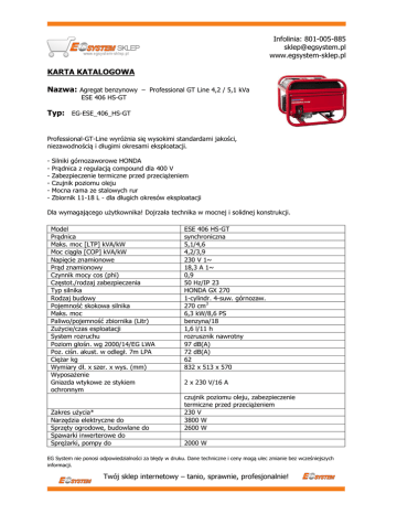Infolinia: 801-005-885 [email protected] www.egsystem-sklep.pl KARTA KATALOGOWA Nazwa: Agregat benzynowy – Professional GT Line 4,2 / 5,1 kVa ESE 406 HS-GT Typ: EG-ESE_406_HS-GT Professional-GT-Line wyróżnia się wysokimi standardami jakości, niezawodnością i długimi okresami eksploatacji. - Silniki górnozaworowe HONDA Prądnica z regulacją compound dla 400 V Zabezpieczenie termiczne przed przeciążeniem Czujnik poziomu oleju Mocna rama ze stalowych rur Zbiornik 11-18 L - dla długich okresów eksploatacji Dla wymagającego użytkownika! Dojrzała technika w mocnej i solidnej konstrukcji. Model Prądnica Maks. moc [LTP] kVA/kW Moc ciągła [COP] kVA/kW Napięcie znamionowe Prąd znamionowy Czynnik mocy cos (phi) Częstot./rodzaj zabezpieczenia Typ silnika Rodzaj budowy Pojemność skokowa silnika Maks. moc Paliwo/pojemność zbiornika (Litr) Zużycie/czas esploatacji System rozruchu Poziom głośn. wg 2000/14/EG LWA Poz. ciśn. akust. w odległ. 7m LPA Ciężar kg Wymiary dł. x szer. x wys. (mm) Wyposażenie Gniazda wtykowe ze stykiem ochronnym Zakres użycia* Narzędzia elektryczne do Sprzęty ogrodowe, budowlane do Spawarki inwerterowe do Sprężarki, pompy do ESE 406 HS-GT synchroniczna 5,1/4,6 4,2/3,9 230 V 1~ 18,3 A 1~ 0,9 50 Hz/IP 23 HONDA GX 270 1-cylindr. 4-suw. górnozaw. 270 cm3 6,3 kW/8,6 PS benzyna/18 1,6 l/11 h rozrusznik nawrotny 97 dB(A) 72 dB(A) 62 832 x 513 x 570 2 x 230 V/16 A czujnik poziomu oleju, zabezpieczenie termiczne przed przeciążeniem 230 V 3800 W 2600 W 2000 W EG System nie ponosi odpowiedzialności za błędy w druku. Dane techniczne i ceny mogą ulec zmianie bez wcześniejszych informacji. Twój sklep internetowy – tanio, sprawnie, profesjonalnie!