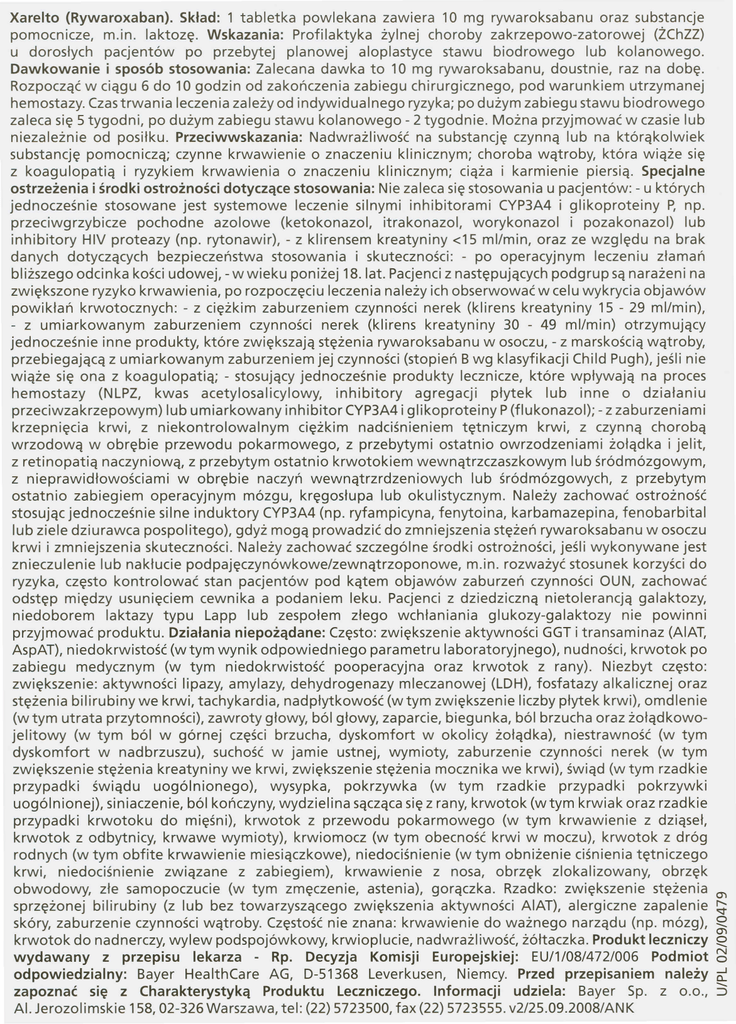 Xarelto (Rywaroxaban). Skład: 1 tabletka powlekana zawiera 10 mg rywaroksabanu oraz substancje pomocnicze, m.in. laktozę. Wskazania: Profilaktyka żylnej choroby zakrzepowo-zatorowej (ŻChZZ) u dorosłych pacjentów po przebytej planowej aloplastyce stawu biodrowego lub kolanowego. Dawkowanie i sposób stosowania: Zalecana dawka to 10 mg rywaroksabanu, doustnie, raz na dobę. Rozpocząć w ciągu 6 do 10 godzin od zakończenia zabiegu chirurgicznego, pod warunkiem utrzymanej hemostazy. Czas trwania leczenia zależy od indywidualnego ryzyka; po dużym zabiegu stawu biodrowego zaleca się 5 tygodni, po dużym zabiegu stawu kolanowego - 2 tygodnie. Można przyjmować w czasie lub niezależnie od posiłku. Przeciwwskazania: Nadwrażliwość na substancję czynną lub na którąkolwiek substancję pomocniczą; czynne krwawienie o znaczeniu klinicznym; choroba wątroby, która wiąże się z koagulopatią i ryzykiem krwawienia o znaczeniu klinicznym; ciąża i karmienie piersią. Specjalne ostrzeżenia i środki ostrożności dotyczące stosowania: Nie zaleca się stosowania u pacjentów: - u których jednocześnie stosowane jest systemowe leczenie silnymi inhibitorami CYP3A4 i glikoproteiny P, np. przeciwgrzybicze pochodne azolowe (ketokonazol, itrakonazol, worykonazol i pozakonazol) lub inhibitory HIV proteazy (np. rytonawir), - z klirensem kreatyniny <15 mi/min, oraz ze względu na brak danych dotyczących bezpieczeństwa stosowania i skuteczności: - po operacyjnym leczeniu złamań bliższego odcinka kości udowej, - w wieku poniżej 18. lat. Pacjenci z następujących podgrup są narażeni na zwiększone ryzyko krwawienia, po rozpoczęciu leczenia należy ich obserwować w celu wykrycia objawów powikłań krwotocznych: - z ciężkim zaburzeniem czynności nerek (klirens kreatyniny 15 - 29 mi/min), - z umiarkowanym zaburzeniem czynności nerek (klirens kreatyniny 30 - 49 mI/min) otrzymujący jednocześnie inne produkty, które zwiększają stężenia rywaroksabanu w osoczu, - z marskością wątroby, przebiegającą z umiarkowanym zaburzeniem jej czynności (stopień B wg klasyfikacji Child Pugh), jeśli nie wiąże się ona z koagulopatią; - stosujący jednocześnie produkty lecznicze, które wpływają na proces hemostazy (NLPZ, kwas acetylosalicylowy, inhibitory agregacji płytek lub inne o działaniu przeciwzakrzepowym) lub umiarkowany inhibitor CYP3A4 i glikoproteiny P (flukonazol); - z zaburzeniami krzepnięcia krwi, z niekontrolowalnym ciężkim nadciśnieniem tętniczym krwi, z czynną chorobą wrzodową w obrębie przewodu pokarmowego, z przebytymi ostatnio owrzodzeniami żołądka i jelit, z retinopatią naczyniową, z przebytym ostatnio krwotokiem wewnątrzczaszkowym lub śródmózgowym, z nieprawidłowościami w obrębie naczyń wewnątrzrdzeniowych lub śródmózgowych, z przebytym ostatnio zabiegiem operacyjnym mózgu, kręgosłupa lub okulistycznym. Należy zachować ostrożność stosując jednocześnie silne induktory CYP3A4 (np. ryfampicyna, feny toina, karbamazepina, fenobarbital lub ziele dziurawca pospolitego), gdyż mogą prowadzić do zmniejszenia stężeń rywaroksabanu w osoczu krwi i zmniejszenia skuteczności. Należy zachować szczególne środki ostrożności, jeśli wykonywane jest znieczulenie lub nakłucie podpajęczynówkowe/zewnątrzoponowe, m.in. rozważyć stosunek korzyści do ryzyka, często kontrolować stan pacjentów pod kątem objawów zaburzeń czynności GUN, zachować odstęp między usunięciem cewnika a podaniem leku. Pacjenci z dziedziczną nietolerancją galaktozy, niedoborem laktazy typu Lapp lub zespołem złego wchłaniania glukozy-galaktozy nie powinni przyjmować produktu. Działania niepożądane: Często: zwiększenie aktywności GGT i transaminaz (AIAT, AspAT), niedokrwistość (w tym wynik odpowiedniego parametru laboratoryjnego), nudności, krwotok po zabiegu medycznym (w tym niedokrwistość pooperacyjna oraz krwotok z rany). Niezbyt często: zwiększenie: aktywności lipazy, amylazy, dehydrogenazy mleczanowej (LDH), fosfatazy alkalicznej oraz stężenia bilirubinywe krwi, tachykardia, nadpłytkowość (w tym zwiększenie liczby płytek krwi), omdlenie (w tym utrata przytomności), zawroty głowy, ból głowy, zaparcie, biegunka, ból brzucha oraz żołądkowojelitowy (w tym ból w górnej części brzucha, dyskomfort w okolicy żołądka), niestrawność (w tym dyskomfort w nadbrzuszu), suchość w jamie ustnej, wymioty, zaburzenie czynności nerek (w tym zwiększenie stężenia kreatyniny we krwi, zwiększenie stężenia mocznika we krwi), świąd (w tym rzadkie przypadki świądu uogólnionego), wysypka, pokrzywka (w tym rzadkie przypadki pokrzywki uogólnionej), siniaczenie, ból kończyny, wydzielina sącząca się z rany, krwotok (wtym krwiak oraz rzadkie przypadki krwotoku do mięśni), krwotok z przewodu pokarmowego (w tym krwawienie z dziąseł, krwotok z odbytnicy, krwawe wymioty), krwiomocz (w tym obecność krwi w moczu), krwotok z dróg rodnych (w tym obfite krwawienie miesiączkowe), niedociśnienie (w tym obniżenie ciśnienia tętniczego krwi, niedociśnienie związane z zabiegiem), krwawienie z nosa, obrzęk zlokalizowany, obrzęk obwodowy, złe samopoczucie (w tym zmęczenie, astenia), gorączka. Rzadko: zwiększenie stężenia sprzężonej bilirubiny (z lub bez towarzyszącego zwiększenia aktywności AlAT), alergiczne zapalenie skóry, zaburzenie czynności wątroby. Częstość nie znana: krwawienie do ważnego narządu (np. mózg), krwotok do nadnerczy, wylew podspojówkowy, krwioplucie, nadwrażliwość, żółtaczka. Produkt leczniczy wydawany z przepisu lekarza - Rp. Decyzja Komisji Europejskiej: EU/1/08/472/006 Podmiot odpowiedzialny: Bayer HealthCare AG, D-51368 Leverkusen, Niemcy. Przed przepisaniem należy zapoznać się z Charakterystyką Produktu Leczniczego. Informacji udziela: Bayer Sp. z 0.0., Al. Jerozolimskie 158, 02-326 Warszawa, tel: (22) 5723500, fax (22) 5723555. v2/25.09.2008/ANK O'l ~