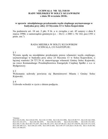 UCHWAŁA NR XL/318/10 RADY MIEJSKIEJ W SOLCU KUJAWSKIM z dnia 30 września 2010r. w sprawie nieodpłatnego przekazania węzła cieplnego usytuowanego w budynku przy ulicy 23 Stycznia 13 w Solcu Kujawskim Na podstawie art. 18 ust. 2 pkt. 9 lit. a w związku z art. 45 ustawy z dnia 8 marca 1990r. o samorządzie gminnym (j.t. – Dz.U. z 2001 r. Nr 142, poz.1591 z późn. zm.1) RADA MIEJSKA W SOLCU KUJAWSKIM UCHWALA, CO NASTEPUJE: §1 Wyraża zgodę na nieodpłatne przekazanie prawa własności węzła cieplnego, usytuowanego w budynku przy ulicy 23 Stycznia 13 w Solcu Kujawskim, o łącznej wartości 24 727,78 zł, stanowiącego własność Gminy Solec Kujawski, na rzecz Komunalnego Przedsiębiorstwa Energetyki Cieplnej Spółki z o.o w Bydgoszczy. §2 Wykonanie uchwały powierza się Burmistrzowi Miasta i Gminy Solec Kujawski. §4 Uchwała wchodzi w życie z dniem podjęcia. 1 Zmiana: Dz.U.02.23.220, Dz.U.02.62.558, Dz.U.02.113.984, Dz.U.02.214.1806, Dz.U.03.80.717, Dz.U.03.162.1568, Dz.U.02.153.1271, Dz.U.04.102.1055, Dz.U.04.116.1203, Dz.U.02.214.1806, Dz.U.05.172.1441, Dz.U.06.17.128, Dz.U.05.175.1457, Dz.U.06.181.1337, Dz.U.07.48.327, Dz.U.07.138.974, Dz.U.07.173.1218, Dz.U.08.180.1111, Dz.U.08.223.1458, Dz.U.09.52.420, Dz.U.09.157.1241,Dz.U.10.28.142, Dz.U.10.28.146, Dz.U.10.106.675. UZASADNIENIE DO UCHWAŁY NR XL/318/10 RADY MIEJSKIEJ W SOLCU KUJAWSKIM z dnia 30 września 2010r. Węzeł cieplny w budynku przy ul. 23 Stycznia 13 w Solcu Kujawskim został sfinansowany z budżetu Gminy Solec Kujawski. Pomieszczenie, w którym zlokalizowany jest węzeł mieści się w budynku Zespołu Szkół Ogólnokształcących i Zawodowych w Solcu Kujawskim. Z ww. węzła dostarczane jest ciepło do budynków Wspólnot Mieszkaniowych przy ul. 23 Stycznia: 15,17, 22, 28 i 30 w Solcu Kujawskim. Wartość węzła wynosi 24.727,78 zł. Utrzymanie węzła wiąże się z kosztami, tj. koszty dzierżawy pomieszczenia, koszty energii elektrycznej i konserwacji. Szacuje się roczny koszt utrzymania węzła na 8.000,- zł. Przekazanie odpłatne węzła na rzecz Komunalnego Przedsiębiorstwa Energetyki Cieplnej Spółka z o.o w Bydgoszczy, wymaga opracowania inwentaryzacji, co wiąże się z dodatkowymi kosztami. KPEC wyraził zgodę na nieodpłatne przejęcie węzła i zobowiązał się do pokrycia kosztów inwentaryzacji. Gmina mogłaby zlikwidować węzeł, ale to pozbawiłaby mieszkańców ww. wspólnot mieszkaniowych dostępu do energii cieplnej. Biorąc pod uwagę powyższe, zasadne jest nieodpłatne przekazanie węzła na rzecz KPEC-u , a tym samym podjęcie przedmiotowej uchwały.