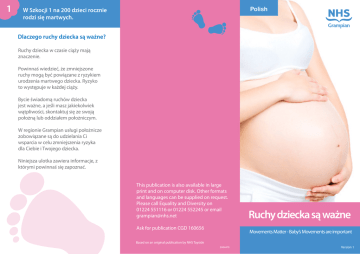 1 Polish W Szkocji 1 na 200 dzieci rocznie rodzi się martwych. Dlaczego ruchy dziecka są ważne? Ruchy dziecka w czasie ciąży mają znaczenie. Powinnaś wiedzieć, że zmniejszone ruchy mogą być powiązane z ryzykiem urodzenia martwego dziecka. Ryzyko to występuje w każdej ciąży. Bycie świadomą ruchów dziecka jest ważne, a jeśli masz jakiekolwiek wątpliwości, skontaktuj się ze swoją położną lub oddziałem położniczym. W regionie Grampian usługi położnicze zobowiązane są do udzielania Ci wsparcia w celu zmniejszenia ryzyka dla Ciebie i Twojego dziecka. Niniejsza ulotka zawiera informacje, z którymi powinnaś się zapoznać. This publication is also available in large print and on computer disk. Other formats and languages can be supplied on request. Please call Equality and Diversity on 01224 551116 or 01224 552245 or email [email protected] Ask for publication CGD 160656 Ruchy dziecka są ważne Movements Matter - Baby’s Movements are important Based on an original publication by NHS Tayside ZA04470 Version 1 2 Co możemy zrobić razem, aby zmniejszyć ryzyko? Bądź świadoma ruchów dziecka. 1 na 2 kobiety, które doświadczyły urodzenia martwego dziecka, zauważyły u siebie zmniejszenie ruchów płodu. Ruchy dziecka są ważne; odczuwanie ruchów dziecka jest zapewnieniem, że maluch ma się dobrze. Jednakże musisz być również świadoma, jaki jest naturalny rytm ruchów Twojego dziecka. Przychodź na wszystkie swoje wizyty przedporodowe. Jest to ważne, gdyż położna będzie w stanie ocenić wzrost dziecka. Dzieci, które są mniejsze niż powinny, znajdują się w grupie zwiększonego ryzyka, dlatego też mogą być konieczne dalsze badania. Jeżeli w którymkolwiek momencie rozwój Twojego dziecka będzie Cię martwić, porozmawiaj o tym ze swoją położną lub lokalnym oddziałem położniczym. Palenie Jeżeli palisz, zwiększasz ryzyko urodzenia martwego dziecka. Możemy zaoferować Ci testy na Carbon Monoxide (CO) oraz skierowanie do usług wspierających rzucanie palenia. Otyłość Ważne jest, aby w ciąży odpowiednio jeść i utrzymywać zdrową wagę. Możemy udzielić Ci wsparcia. Narkotyki i alkohol Mają one wpływ na Twoje zdrowie, a więc także i na wzrost i rozwój dziecka. Możemy udzielić Ci wsparcia. Niektóre schorzenia Twoja położna omówi je z Tobą; otrzymasz też plan opieki oraz omówisz wszystko z lekarzem. 3 Co należy do normalnych ruchów? Ruchy dziecka są często opisywane jako kopnięcia, trzepotanie, uderzenia, chlupotanie lub fikołki. Większość kobiet odczuwa ruchy dziecka od okresu pomiędzy 18-tym a 20-tym tygodniem. Ruchy te zwiększają swoją częstotliwość do 32-go tygodnia, a następnie utrzymują się w takiej samej ilości aż do porodu. Rodzaj ruchu może się zmieniać w miarę jak dziecko rośnie oraz zbliża się termin porodu, ale ilość ruchów powinna pozostać taka sama i powinnaś być świadoma, jaki jest normalny rytm ruchów Twojego dziecka. W 24-tym tygodniu położna odbędzie z Tobą szczegółową rozmowę na temat ruchów dziecka: • Twoje dziecko jest jedyne w swoim rodzaju, więc zapoznaj się z jego normalnym rytmem ruchów. Jest to ważne, gdyż znacząca zmiana w rytmie ruchów dziecka powiązana ze zmniejszeniem się ilości ruchów może być pierwszą oznaką, że z maluchem jest coś nie tak. • Jeżeli niepokoi Cię coś w ruchach dziecka, skontaktuj się z oddziałem położniczym tego samego dnia. • Musisz być świadoma, że zmniejszona aktywność dziecka może być powiązana z obumarciem płodu, jakkolwiek małe ryzyko by to nie było. 4 Co robić, jak pojawią się wątpliwości lub obawy? Jeżeli nie jesteś pewna, czy ruchy dziecka się zmniejszyły, radzimy, abyś: • Położyła się na lewym boku i skupiła na ruchach dziecka przez 1-2 godziny. • Jeżeli w ciągu 1-2 godzin nie poczujesz normalnego rytmu ruchów dziecka, skontaktuj się ze swoją położną bądź lokalnym oddziałem położniczym w celu zasięgnięcia porady. Zostaniesz poproszona o udanie się na najbliższy oddział położniczy w celu wykonania dalszych badań. Wyniki badań pomogą personelowi zaplanować opiekę nad Tobą. W większości przypadków, ruchy dziecka wracają do normy i podjęcie dalszych kroków nie jest konieczne. Jeżeli jednak jesteś świadoma dalszych zmian lub zmniejszenia ruchów dziecka, powinnaś skontaktować się z oddziałem położniczym. W celu uzyskania dalszych informacji www.rcog.org.uk/print/womans-health/clinical-guidance/your-babys-movements-pregnancy